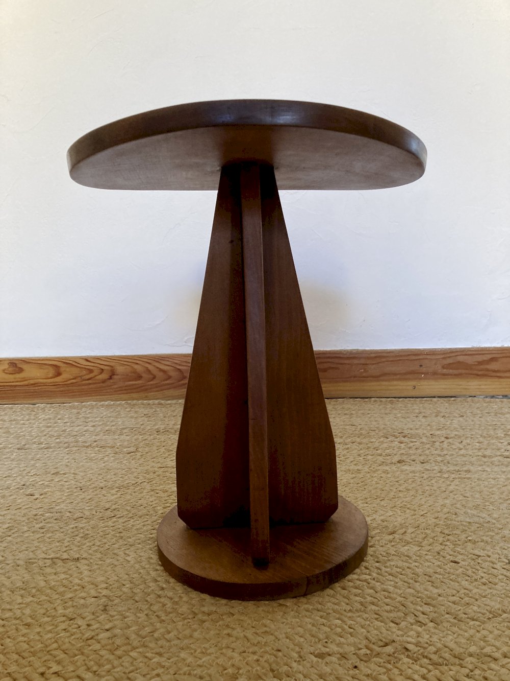 It is in good condition, with only slight warping on the base. We have sanded it and protected it with a layer of dark oak tinted wax.