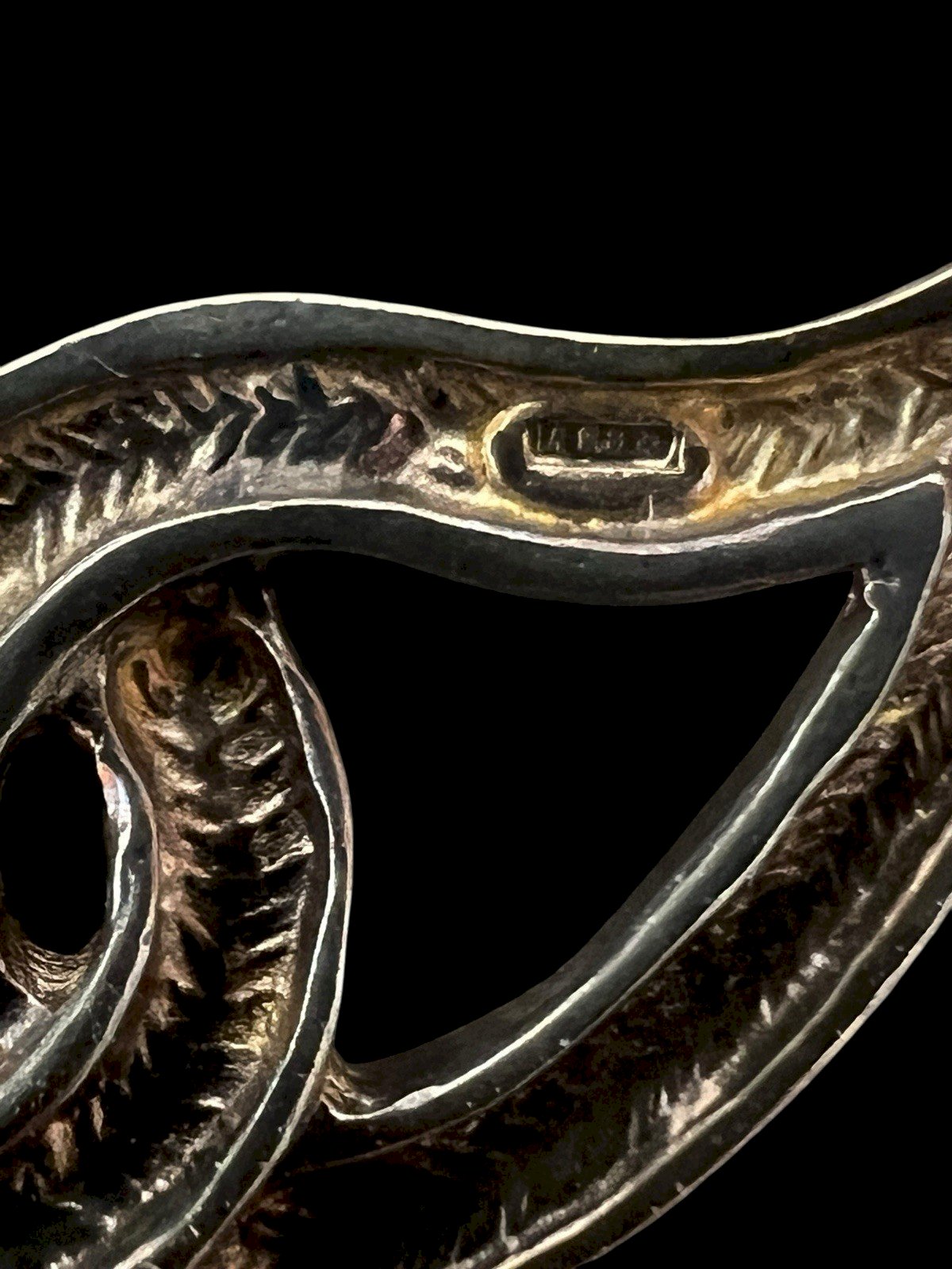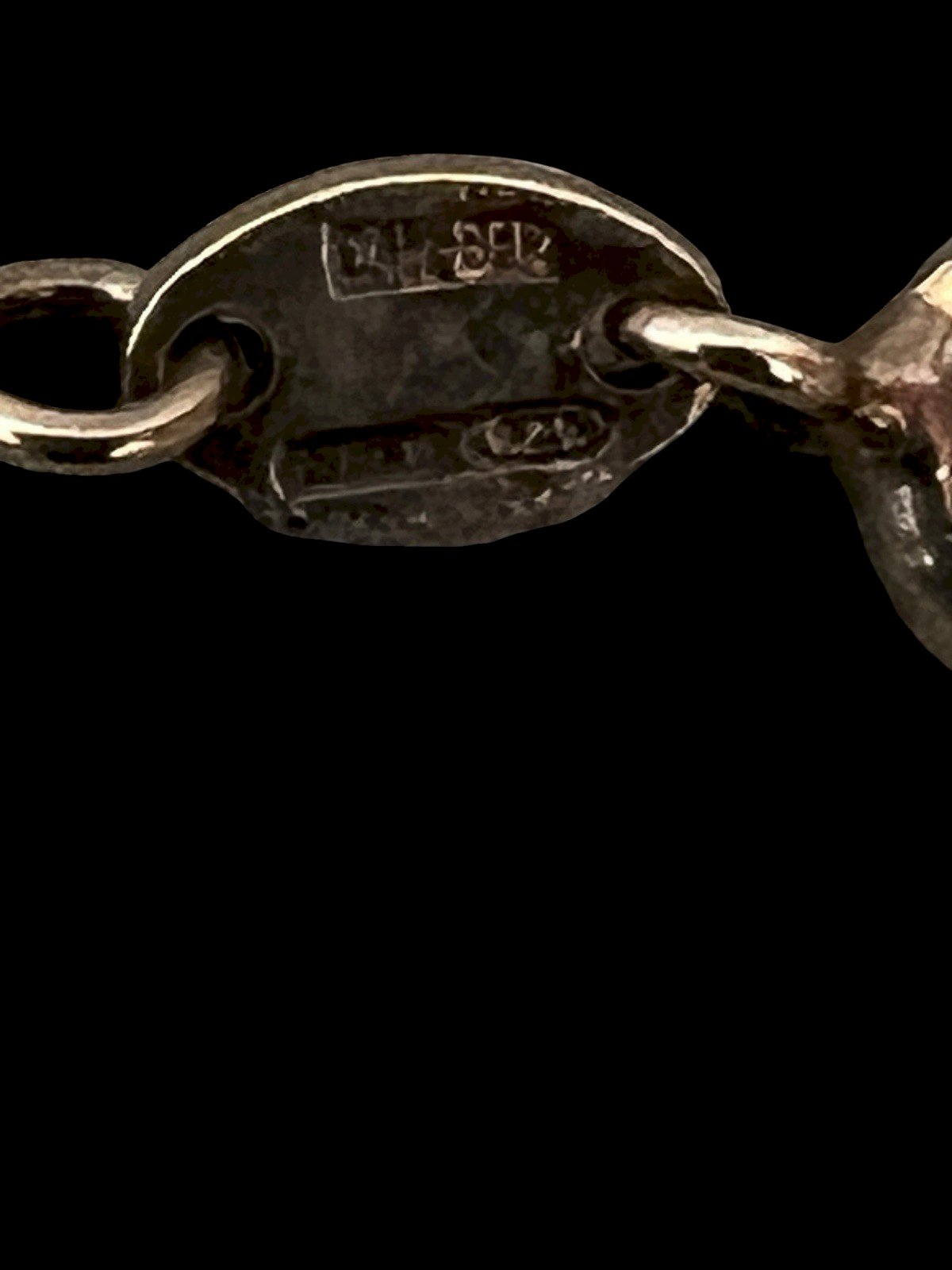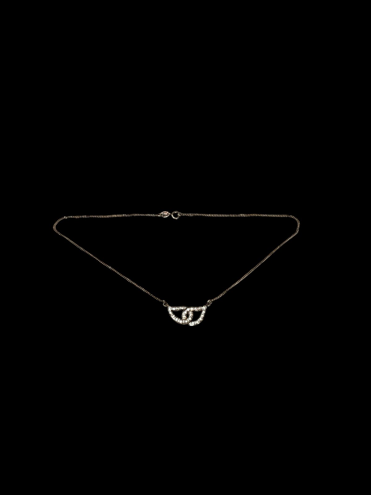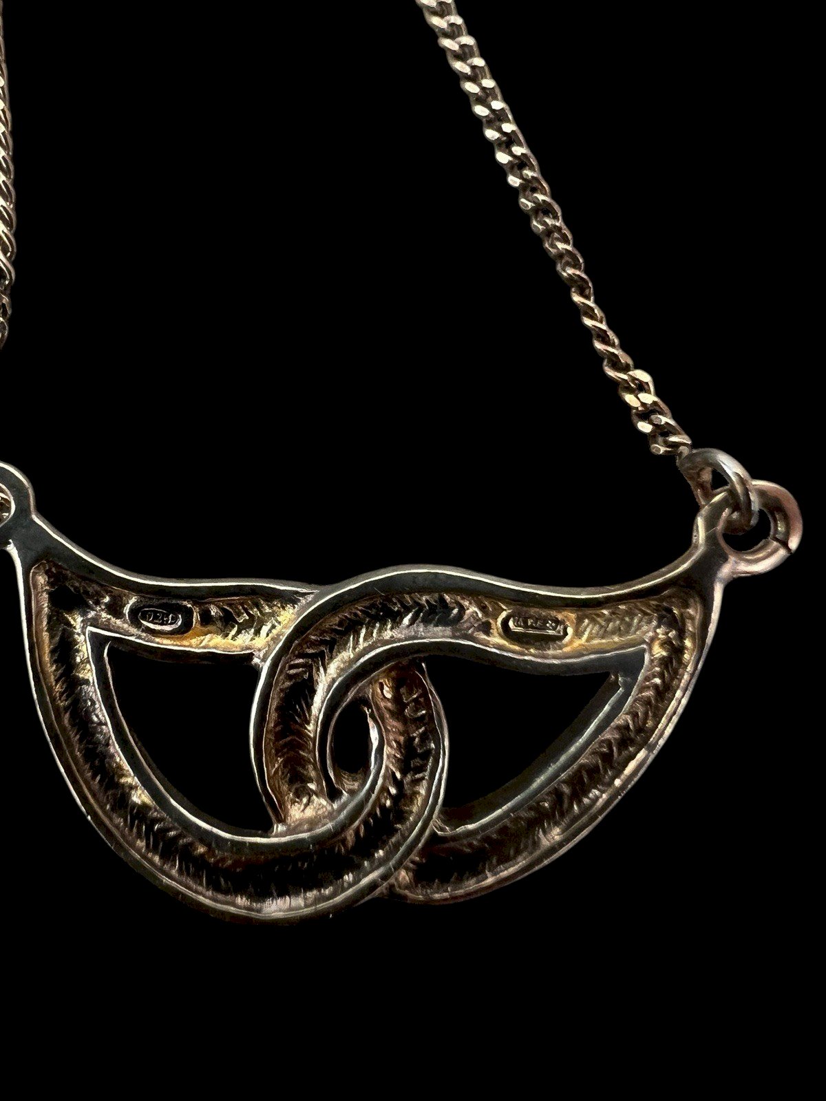 Interlaced pattern silver necklace, 925 - Vintage Vermeil Swarovski - Airoldi Brand "You and Me" necklace in solid silver covered with vermeil, 925 hallmark from Airoldi Brand. Dimension approximately 40 cm in total length. Dimension of the interlaced pattern approximately 3 cm by 1.5 cm. Weight of the necklace approximately 6.5 g. Old patina, good vintage condition. Condition: Used: Item that has been worn. ... Used: Item that has been worn. Any imperfections may exist. Dominant stone: Crystal. Brand: Airoldi. Type: Pendant necklace. Dominant color: Gold. Material: Crystal. Length: 36-40 cm. Theme: Love, heart. Shape of the pendant: Interlaced pattern.
