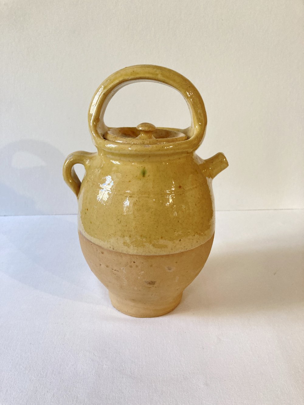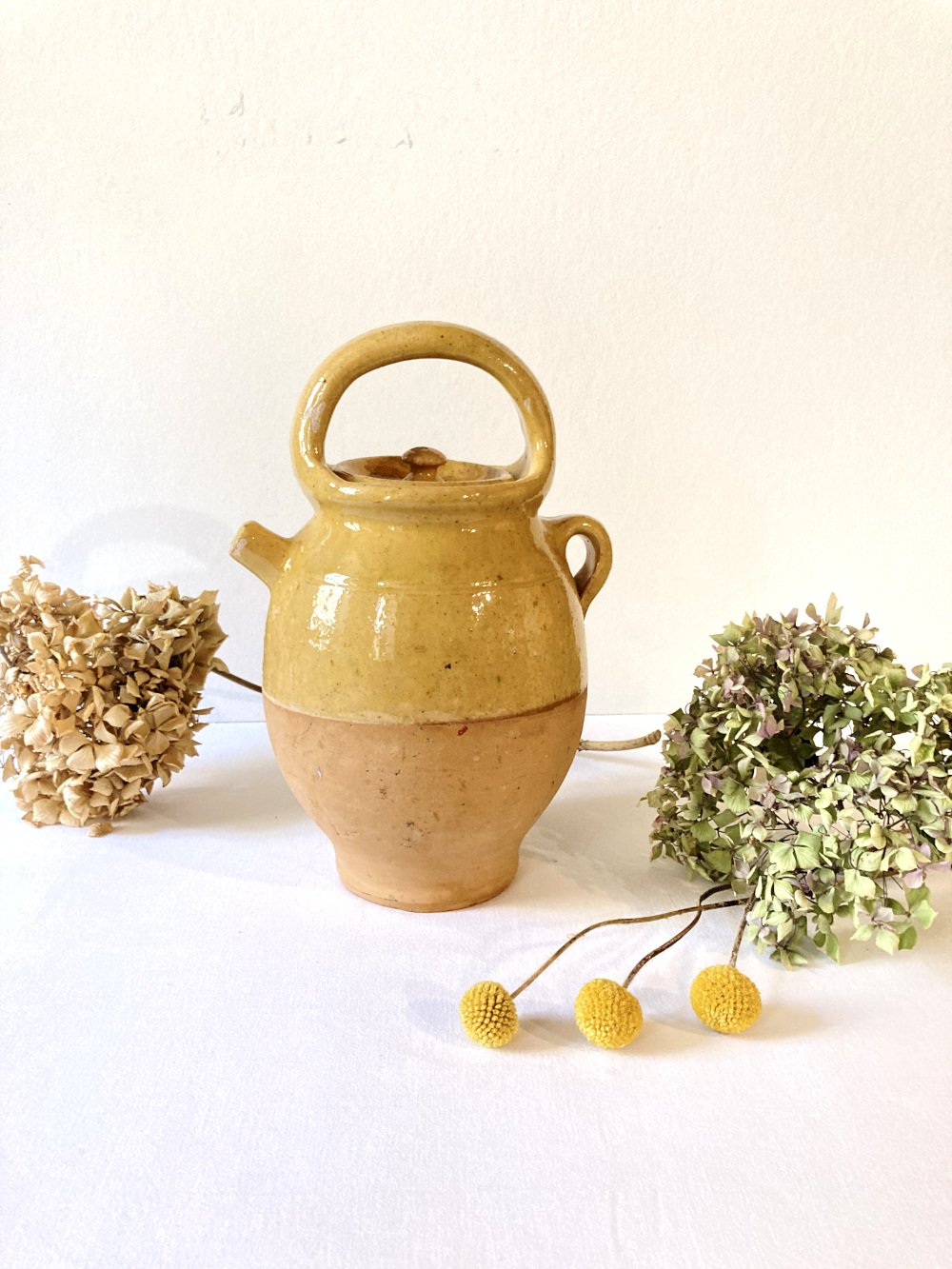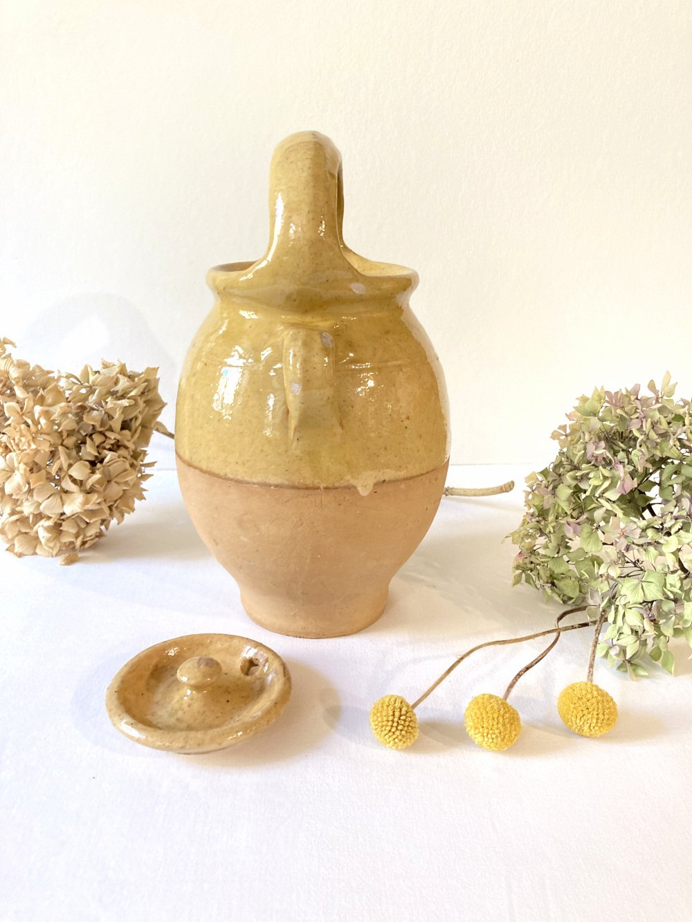 Old pitcher or Provençal chevrettes in yellow glazed stoneware, complete with its lid. 1960s. Very good overall condition, with a few small chips in the glaze, without aesthetic damage. Suitable for outdoor or indoor decoration, for receiving bouquets or dried plants, for example. In combination with other similar materials, it has a beautiful effect.