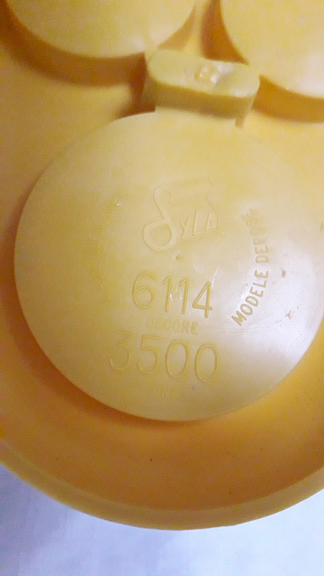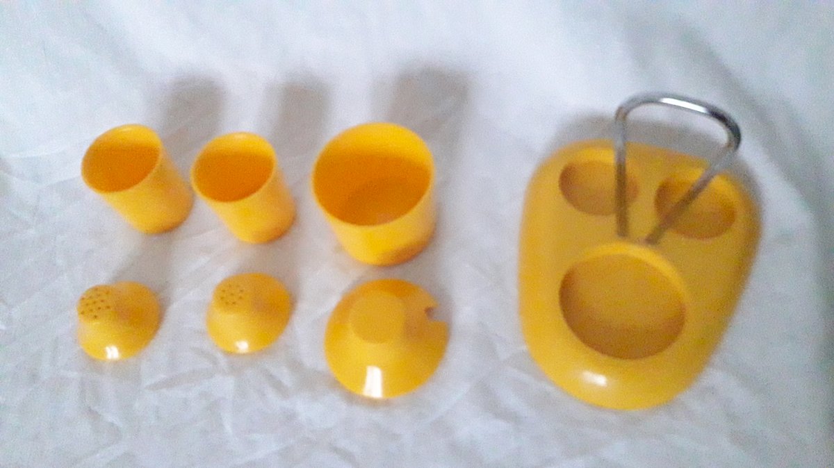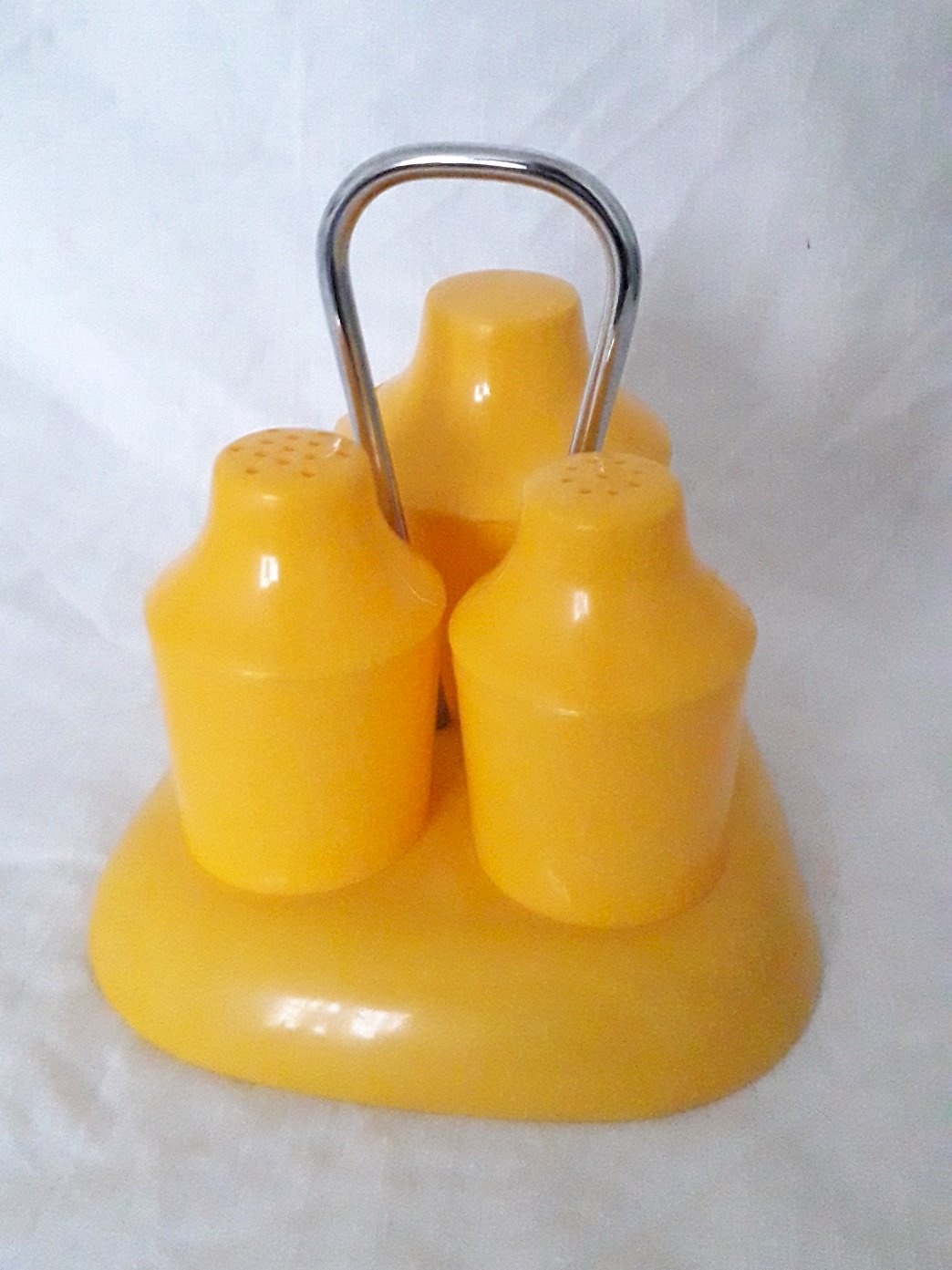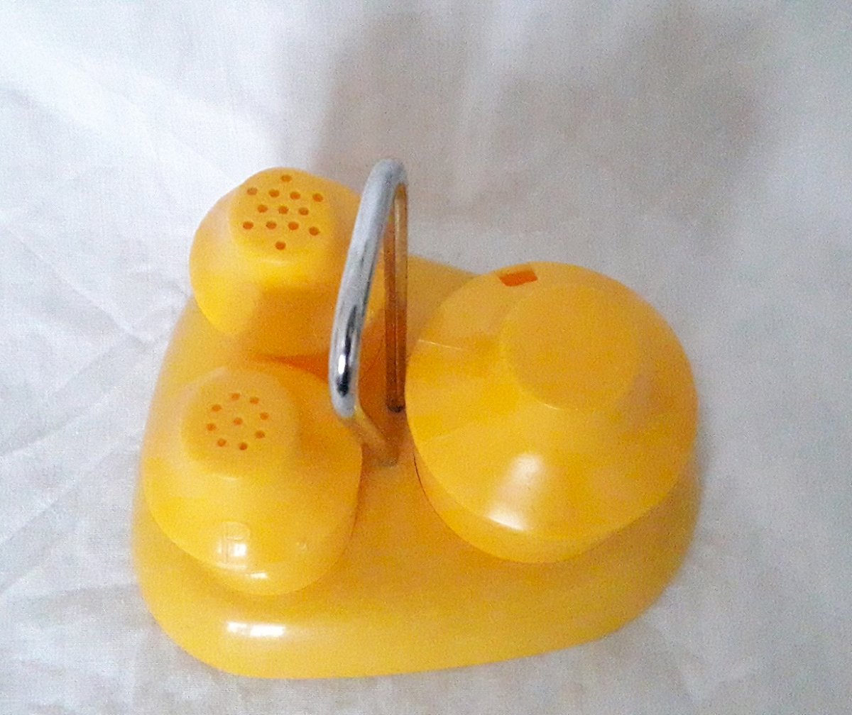 Set including a display stand, a salt shaker, a pepper shaker, and a mustard pot, made of yellow plastic, from the 1970s, by the brand "Syla."