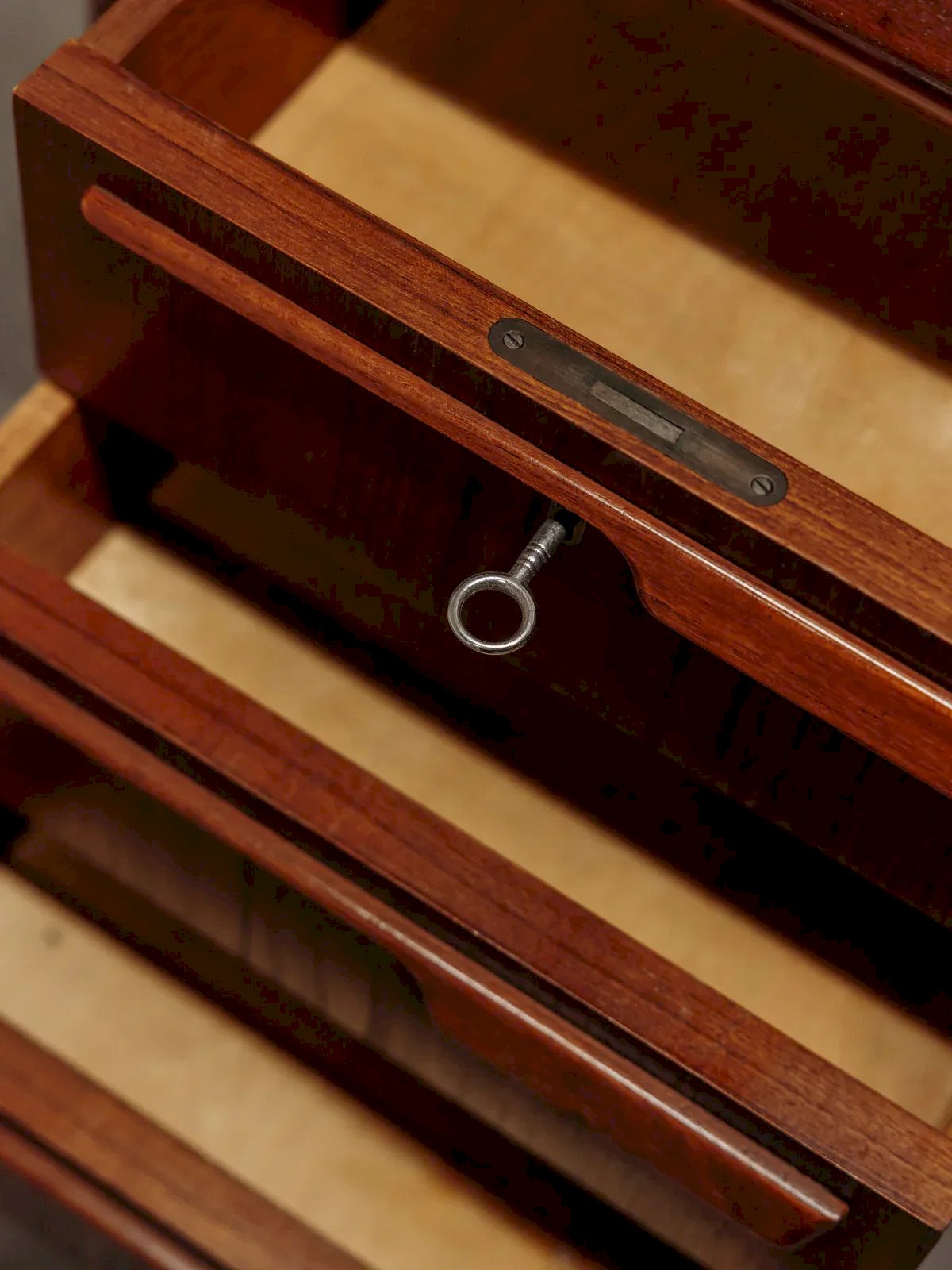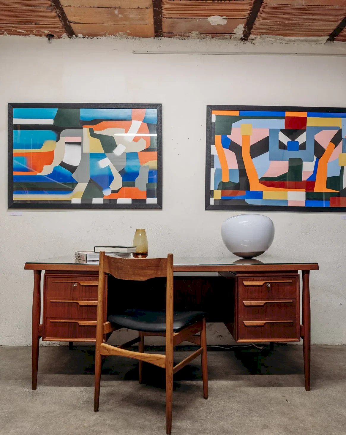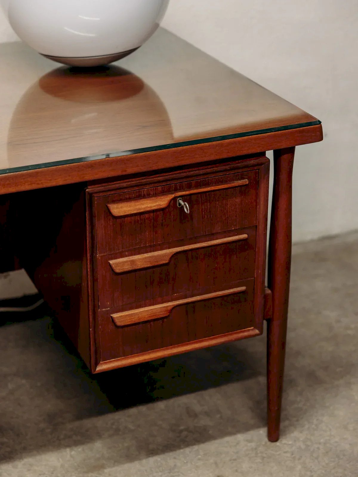 Discover this great Danish double-sided teak desk from the 1960s, featuring elegant and airy lines. It has two rows of three drawers at the front, with the top ones locking, and at the back, two cabinets with doors and a large central niche, providing multiple storage options for books, documents, or a mini-bar. The curved legs and the top protected by glass give it the look of an executive piece, ideal for an office or living room. Light signs of wear and a small impact under the edge of the glass top. Length: 169 cm Width: 82 cm Width for legs: 74 cm Height: 72.5 cm Drawer height: 9 cm Condition: Used: Item has been used. Item shows some superficial signs of wear, ...Used: Item has been used. Item shows some superficial signs of wear, fully operational and functioning correctly. It may be a demonstration model or an item returned to the store after a short period of use. any imperfections. Brand: Debongout Type: Thrifted product Material: Wood, Teak Style: Contemporary Customized: Desks