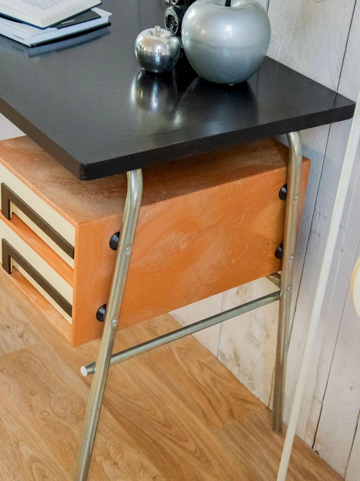 Adopt this desk in the style of Pierre Garriche, produced for the Prisunic capsule in 1977, which marries retro spirit and contemporary functionality. Its dark brown lacquered MDF top rests on a lightweight tubular metal frame, creating a clean and balanced silhouette. Two beige and brown resin drawers provide discreet storage and a nice contrast of materials, ideal for organizing your workspace or creating a writing nook. Its compact size fits easily into measured spaces. Length: 85 cm Width: 52 cm Height: 71 cm Height under the top: 71 cm Drawer height: 8.5 cm Niche height: 10 cm Condition: Used: An item that has been used. The item shows some superficial wear marks,... Used: An item that has been used. The item shows some superficial wear marks, fully operational and functioning correctly. It may be a demonstration model or an item returned to the store after a short period of use. Possible imperfections. Brand: Debongout Type: Curated product Material: Metal, Wood, Resin Style: Contemporary Customized: Desks