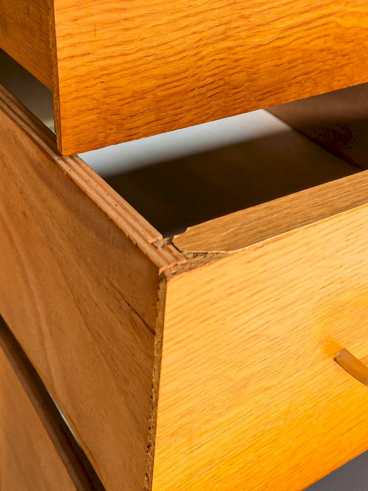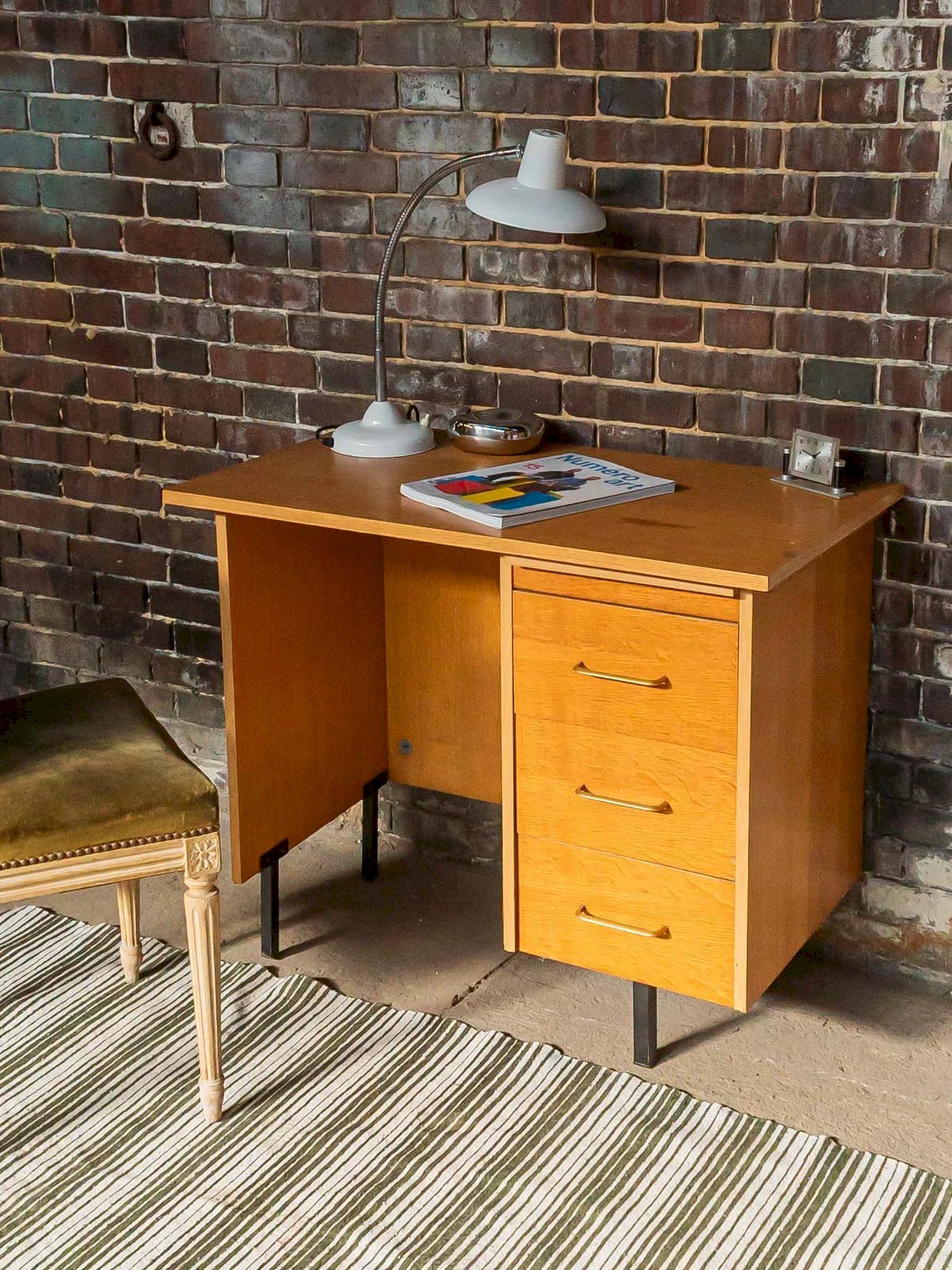 Add a touch of elegance to your workspace with this modernist desk. Featuring three practical drawers, it subtly combines light oak veneer with black metal legs, creating a harmonious and contemporary contrast. The brass handles add a note of sophistication to the whole. Ideal for optimizing space while adding a refined style to your interior, this desk will appeal to lovers of chic and functional design. Length: 90 cm Width: 50 cm Height: 76 cm Drawer height: 13 cm Chair space: 44 cm Height under the top: 74 cm Condition: Used: Item has been used. Item shows some signs of superficial wear, ...Used: Item has been used. Item shows some signs of superficial wear, fully operational and functioning correctly. It may be a display model or an item returned to the store after a short period of use. any imperfections. Brand: Debongout Type: Vintage Product Material: Wood, Oak Style: Contemporary Custom: Desks