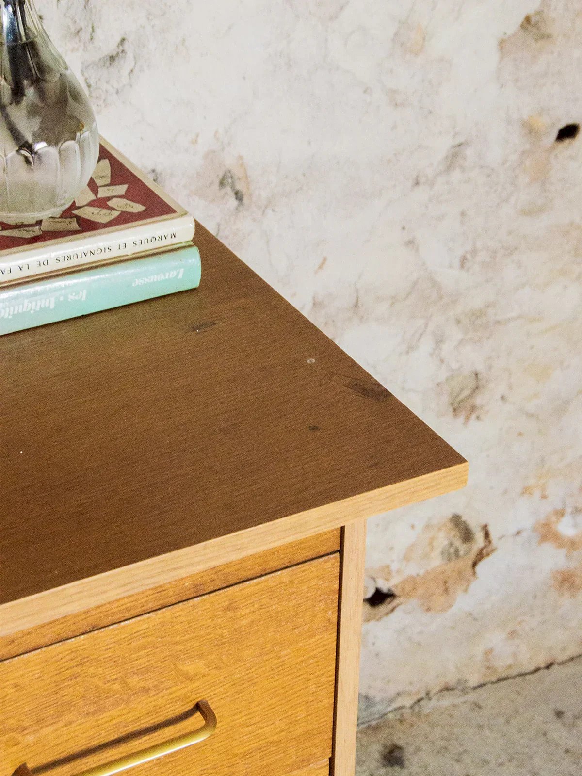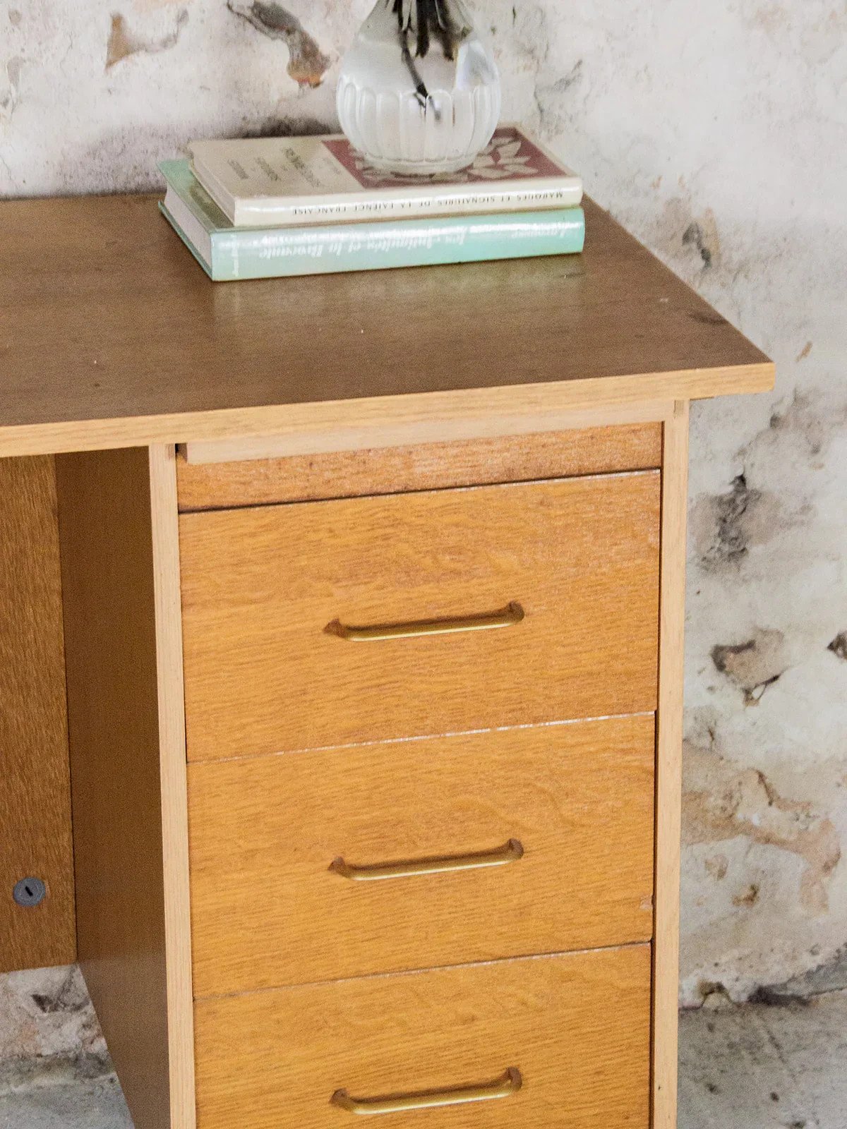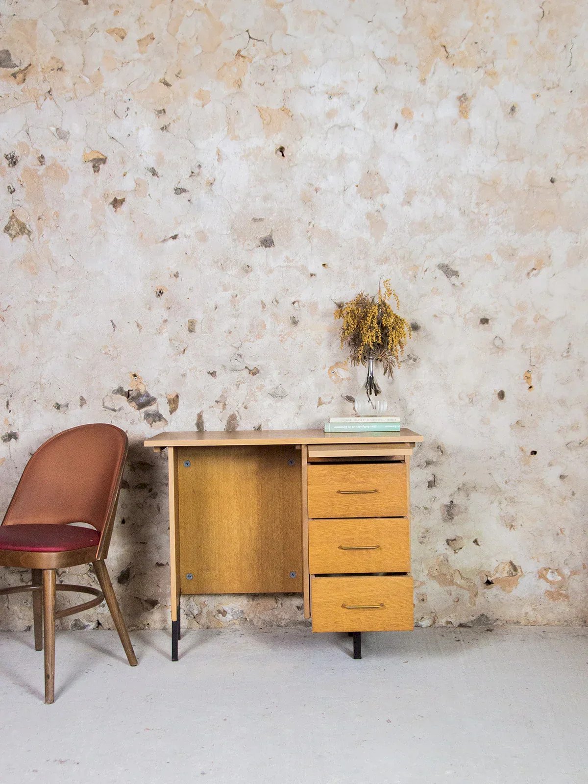Discover this charming little light wood desk, perfect for maximizing space while adding a touch of elegance to your interior. It is equipped with three large drawers, ideal for organizing your belongings, and features a pull-out board that transforms it into a functional secretary. Practical and aesthetic, this desk combines modern design and functionality, making it an essential piece of furniture for your workspace. Online exclusive, the meeting will take place at your home! Length: 91 cm Width: 50.5 cm Height: 76 cm Condition: Used: Item that has been used. Item showing some superficial signs of wear, fully operational and functioning correctly. It may be a demonstration model or a returned item after a short period of use. Possible imperfections. Brand: Debongout Type: Vintage product Material: Wood Style: Contemporary Custom: Desks
