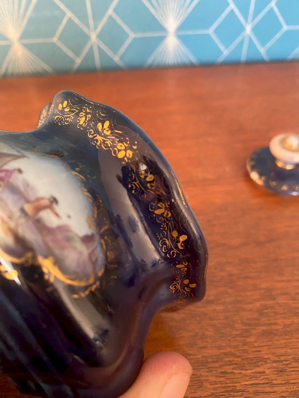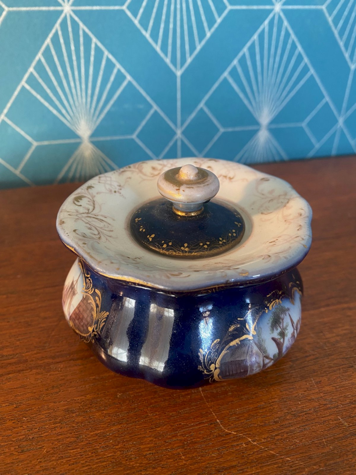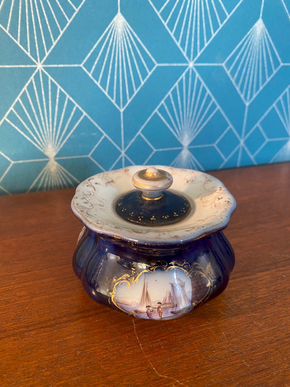 Charmant petit encrier du XIXème siècle, en porcelaine blanche de Paris, très finement peint de 3 marines dans des cartouches sur fond bleu marine, réhaussé d'or. A noter un mini choc sur le couvercle et usure du temps à la dorure. 6cm de haut par 10 de diamètre.