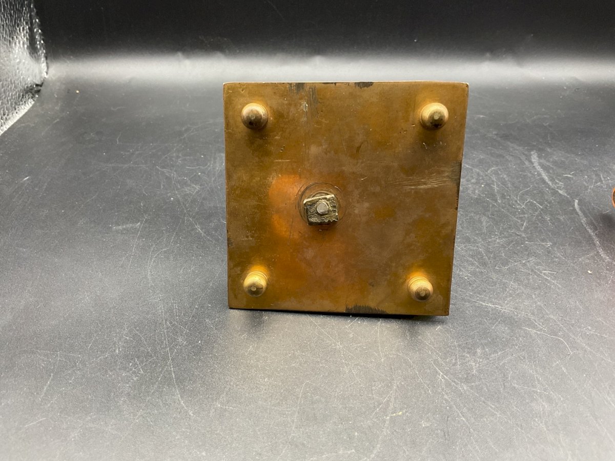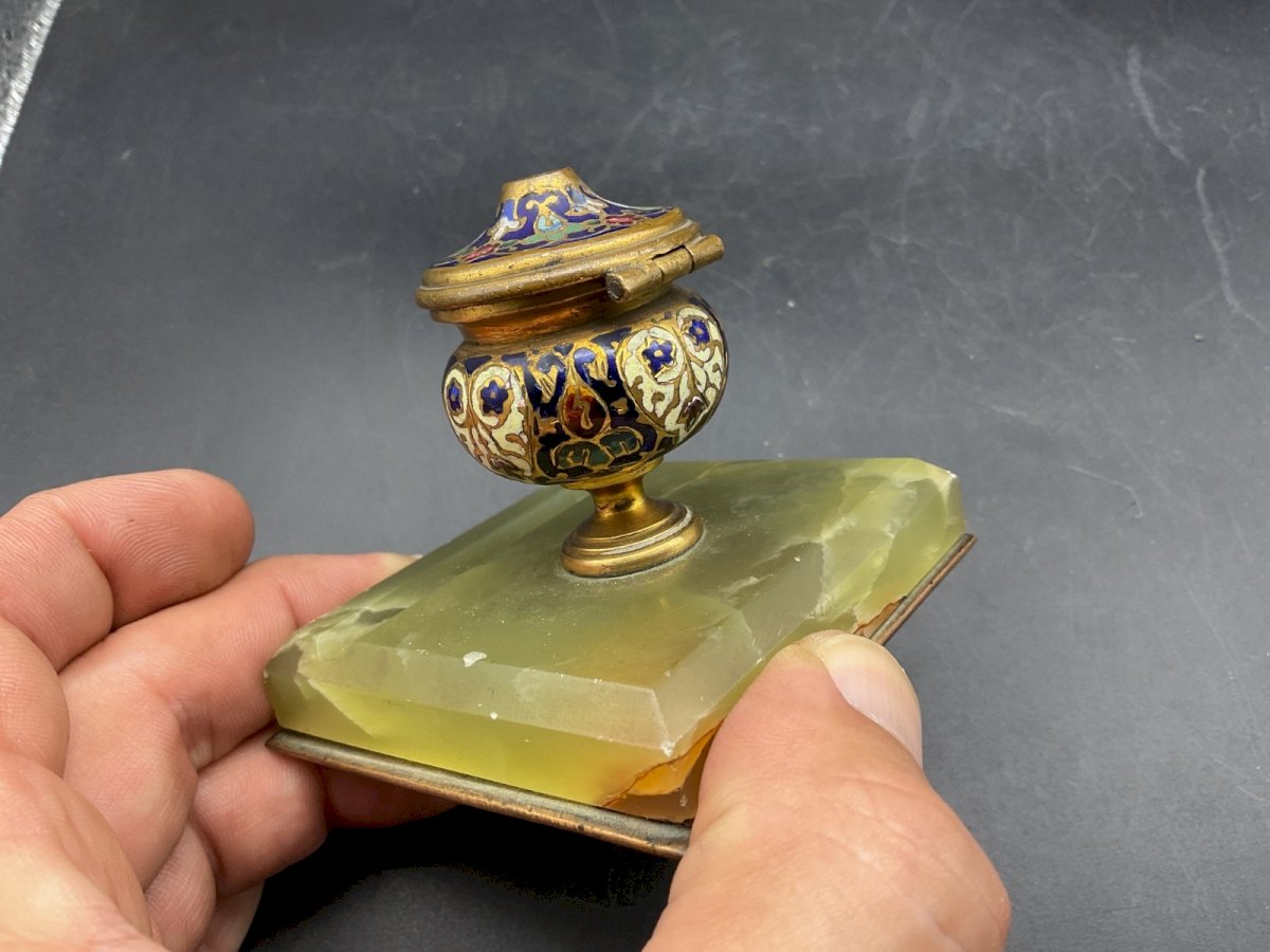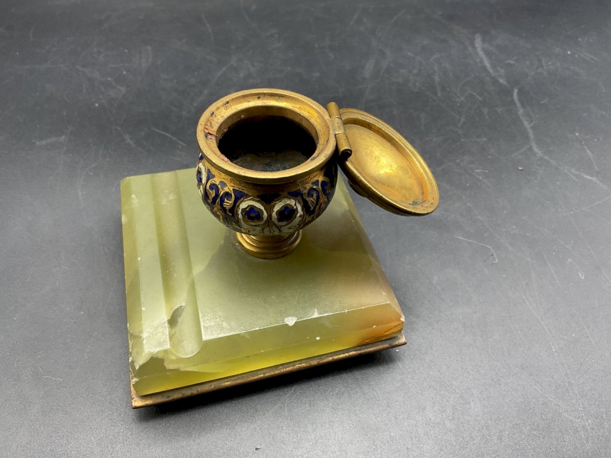 ENCRIER-PORTE PLUME, BRONZE ET ONYX,  EMAUX CLOISONNES, XIXeme  Hauteur : 7 cm Dimension : 7,5 x 7,5 cm Authenticité:Original Epoque:XIXe siècle Type:Objet de vitrine, Décoratif Origine:France Sous-type:Encrier, Plumier Matière:Bronze, onyx, émail Style:Napoléon III