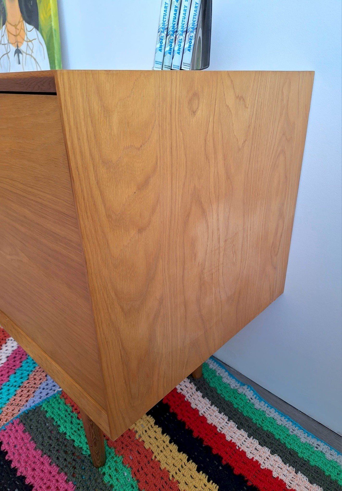 Merci de m’écrire si vous souhaitez me faire une offre. Enfilade Quilda La Redoute Interieurs, meuble sous vasque A noter ce meuble comporte une fêlure coté droit bas arrière et décoloration du bois à ce même endroit (cf photo), quelques griffes très discrètes. 1 étagère manquante. Couleur chêne moyen. Design vintage scandinave. Initialement meuble double vasque pour une salle de bains (percement à effectuer par vos soins) mais tout à fait adapté également en meuble TV ou buffet. Description • 2 portes avec étagère ajustable en hauteur à l'intérieur • 3 tiroirs avec coulisses en acier • Caisson et étagères en chêne massif FSC® et MDF plaqué chêne FSC® , finition vernis polyuréthane et nitrocellulosique • Piètement et poignées en chêne massif FSC® , finition vernis polyuréthane et nitrocellulosique • Meuble adapté pour recevoir jusqu'à 2 vasques Dimensions Totales • Largeur : 140 cm • Hauteur : 80 cm • Profondeur : 50 cm Utiles • Tiroirs : L39 x H8,5 x P37 cm • Hauteur des pieds : 33 cm Remise à mon domicile ou livraison possible via transporteur (ex 80€ sur le trottoir vers Paris et région parisienne, me contacter pour d’autres destinations). Les délais de livraison de 2 à 4 jours sont imposés par et sont donc donnés à titre purement indicatif. Télévision ampm vaisselier commode armoire