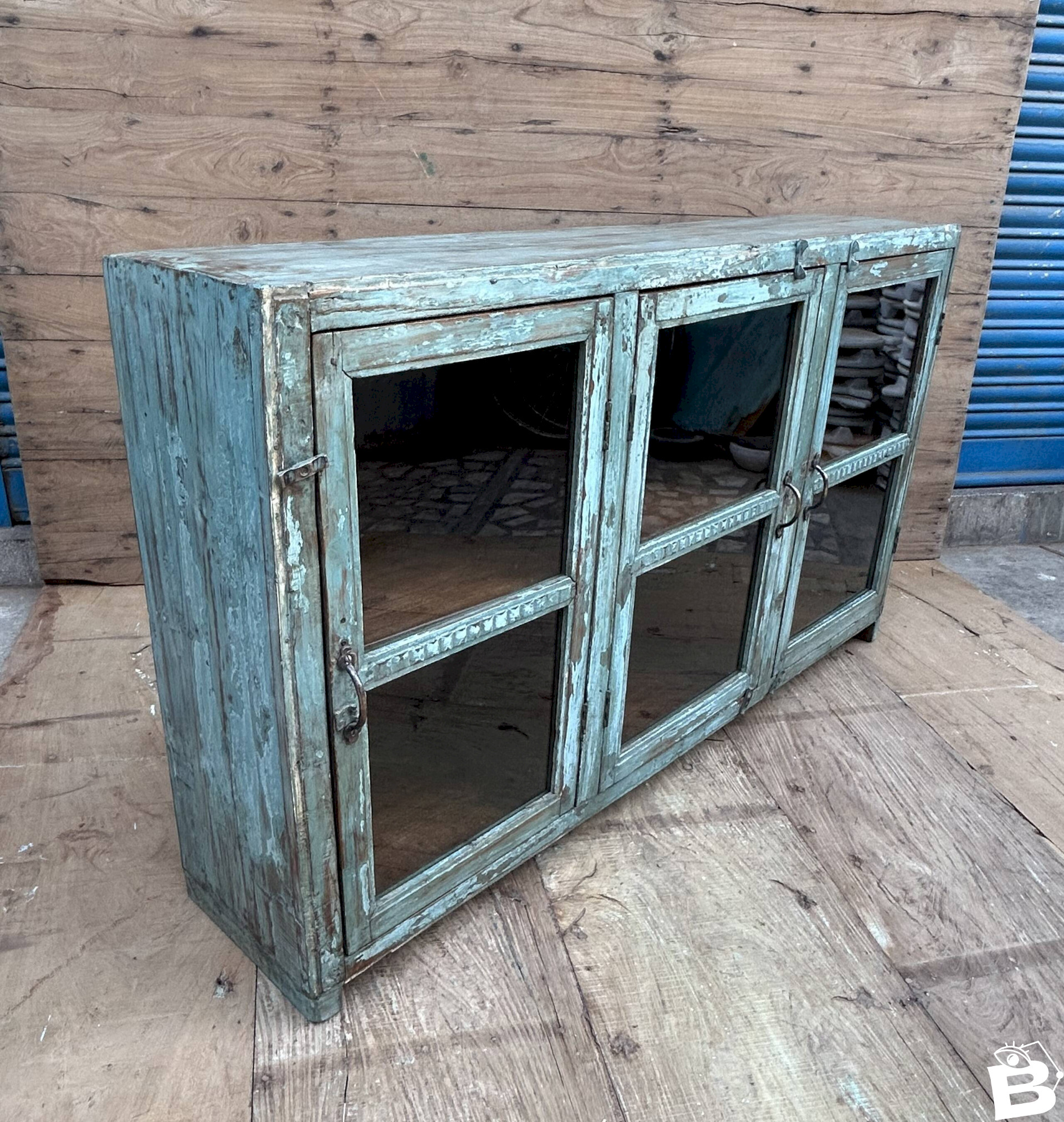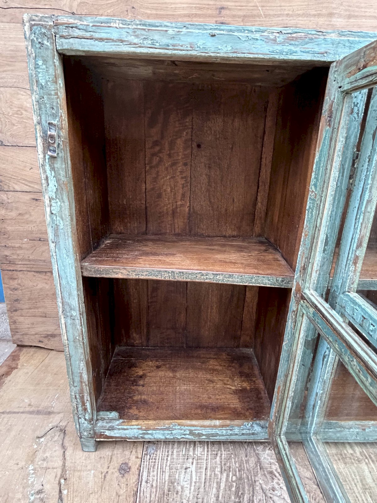Enfilade vitrée en teck birman avec patine turquoise dorigine Ethnique Bleu Bois