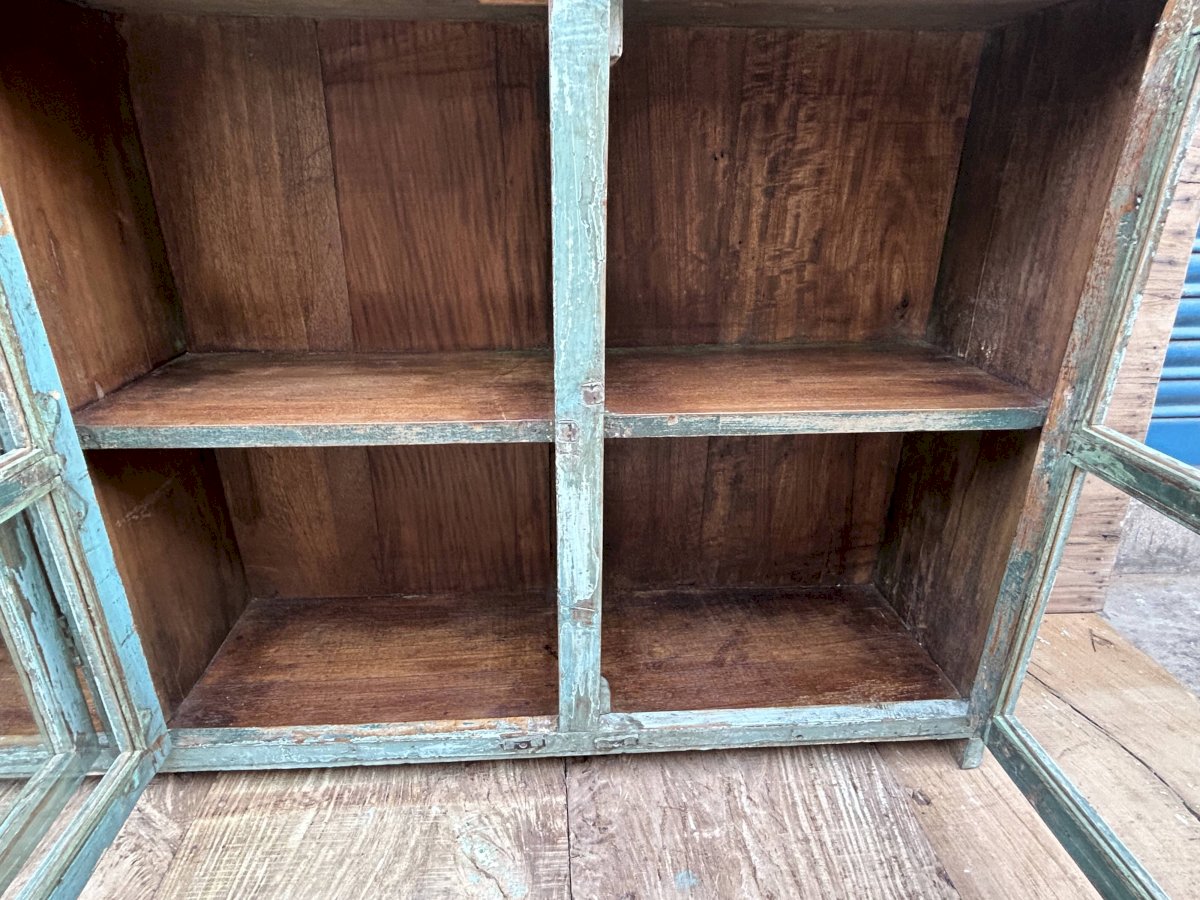 Enfilade vitrée en teck birman avec patine turquoise dorigine