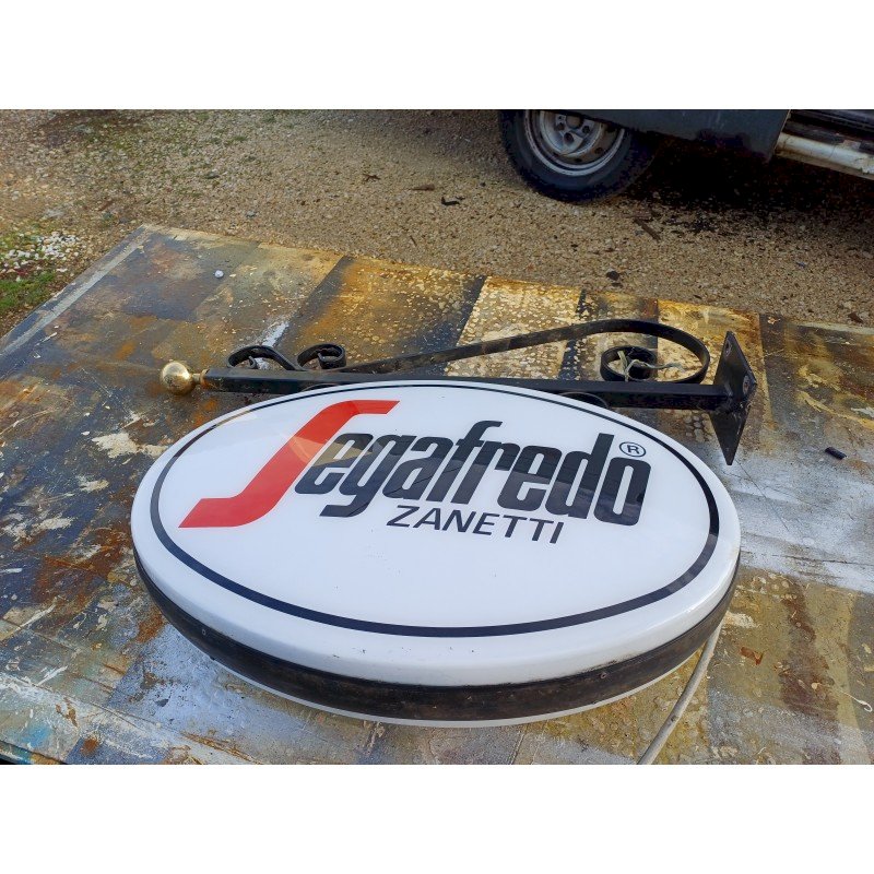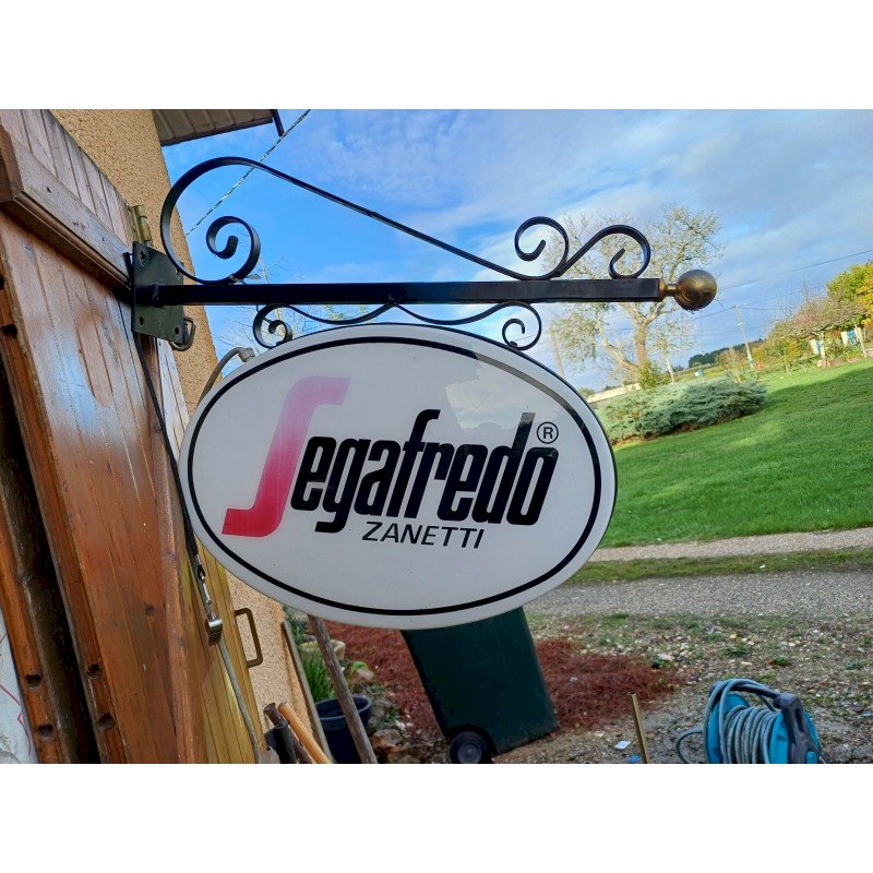 Enseigne Lumineuse Double Façe " Segafredo " Armature Fer Forgé , Globe Plastic ,   Haut : 60 cm , dimensions Globe : 40 cm sur 59 cm , poids : 6,3 Kg , trés bon ètat