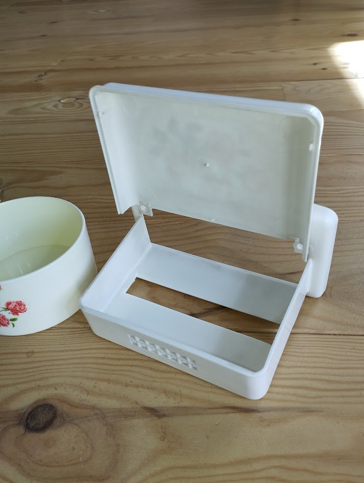 Charmant ensemble de salle de bain vintage de la marque française SYLA, comprenant un distributeur de papier toilette (modèle 6003) et une boîte assortie.