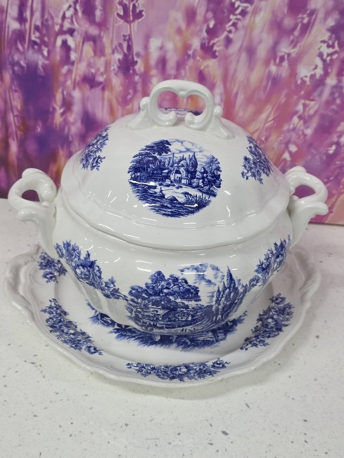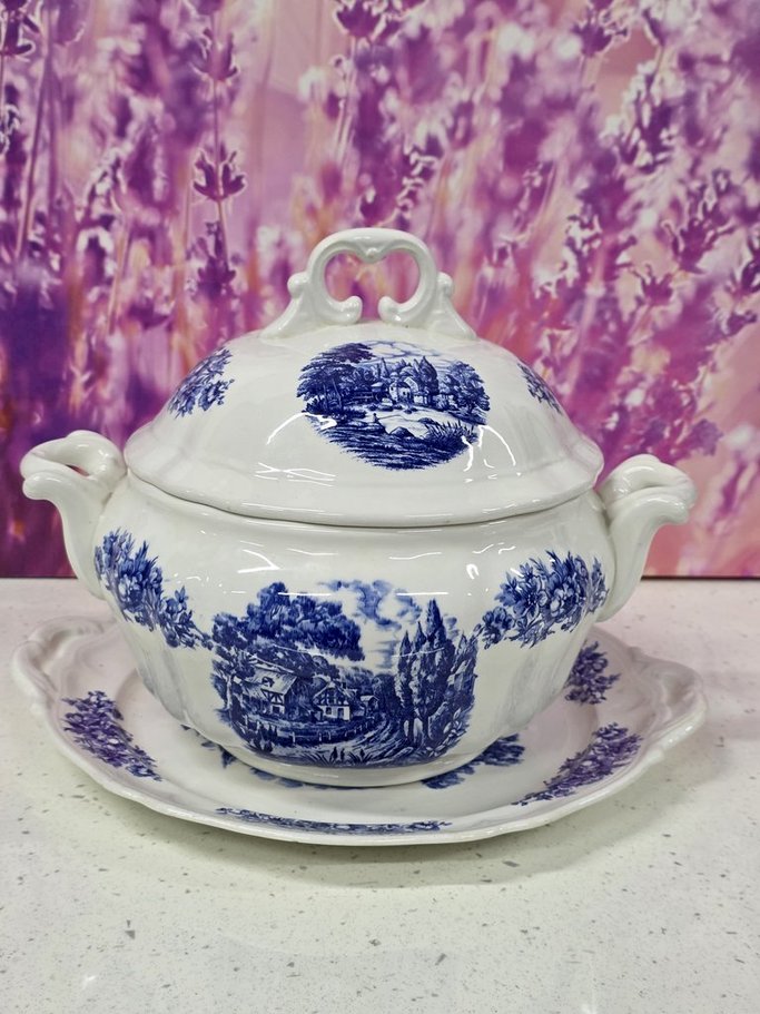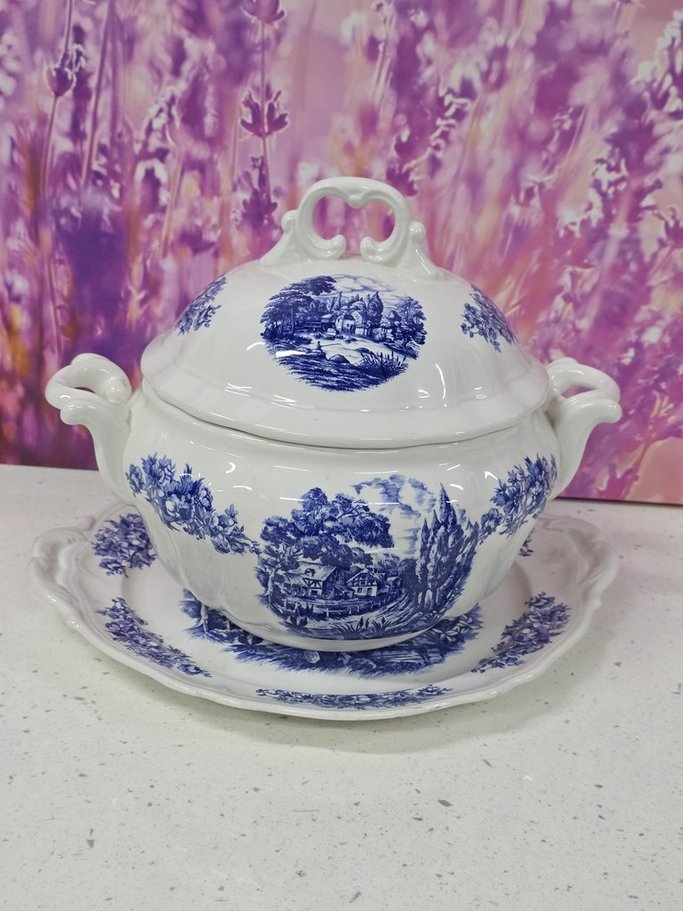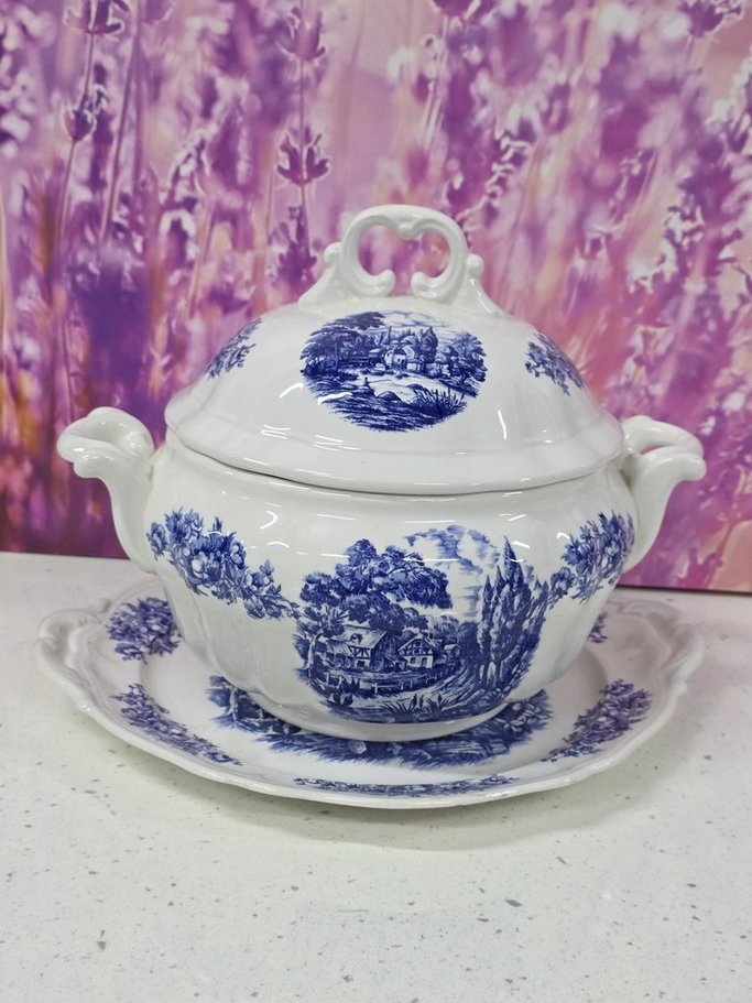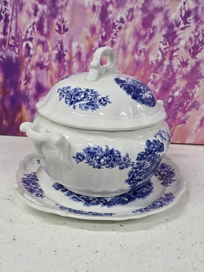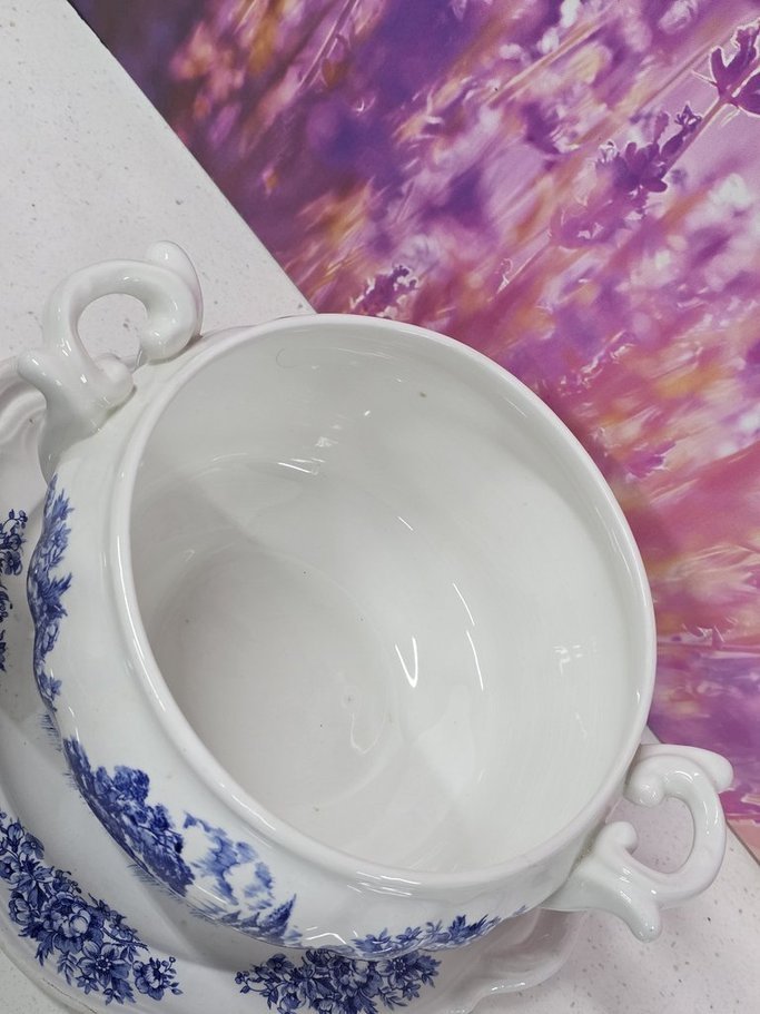 ensemble soupière décorative et plat orchies moulin des loups santiago Blanc/Bleu Faïence