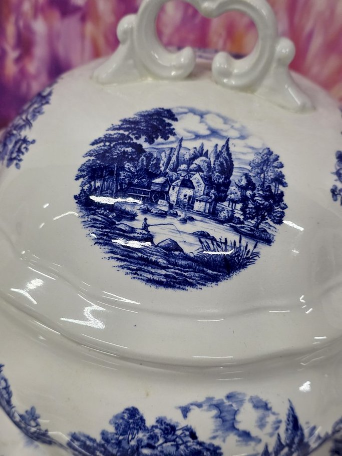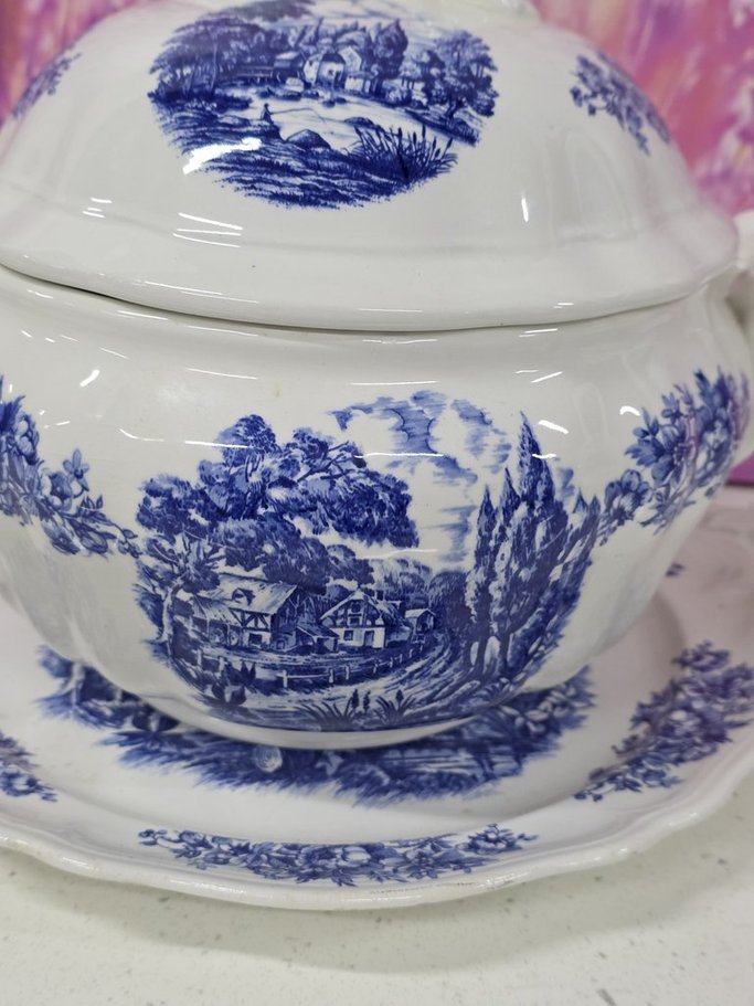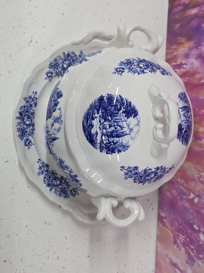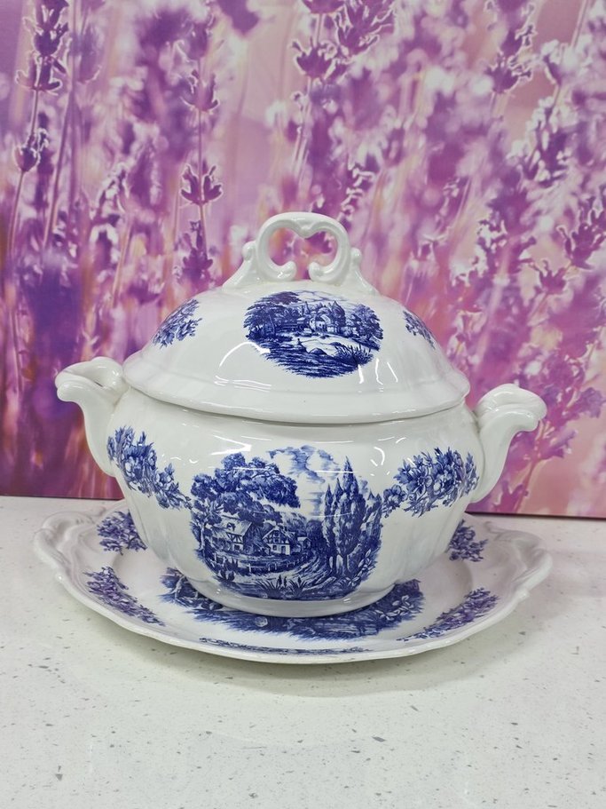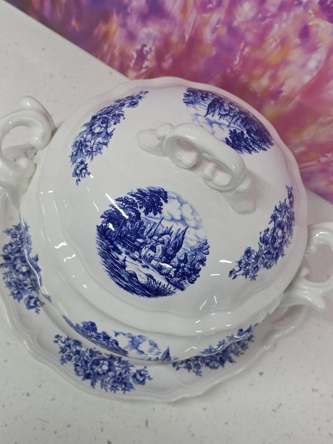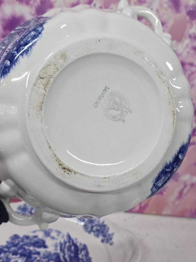 ensemble soupière décorative et plat orchies moulin des loups santiago Blanc/Bleu Faïence
