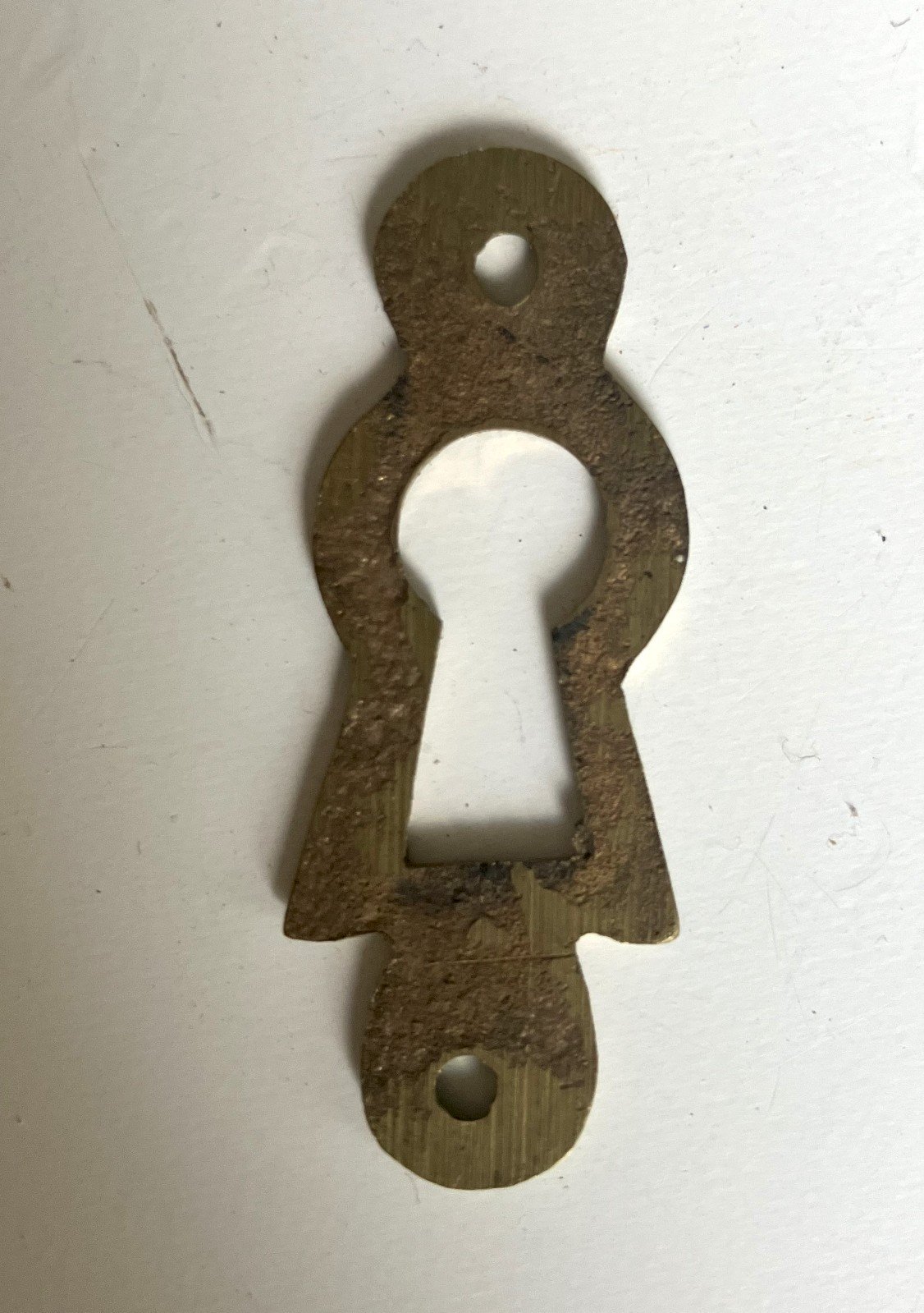 entree de serrure en laiton hauteur 44 mm largeur 17 mm epaisseur 2 mm hauteur totale du trou de serrure 18 mm diametre trou superieur 8 mm bon etat general - petites marques d' usage expedition en lettre suivie Matière:Laiton