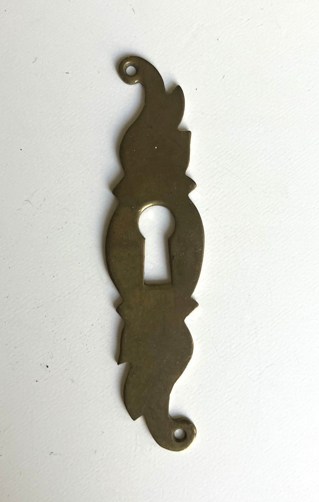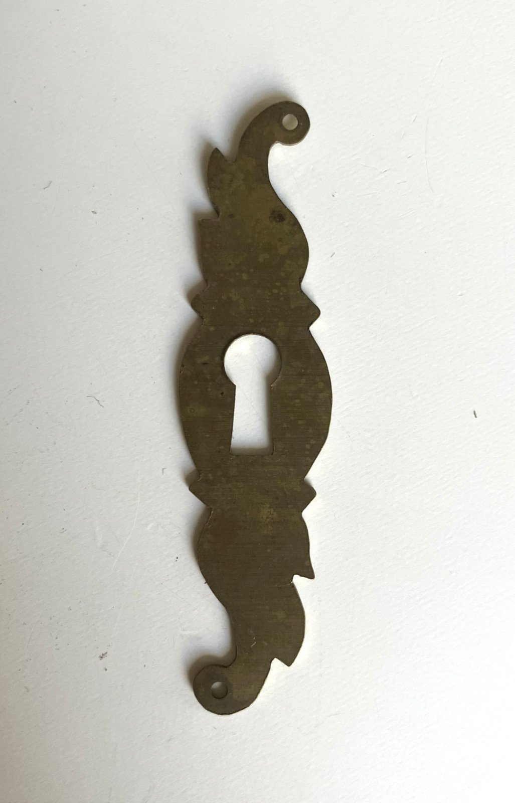 entree de serrure en laiton hauteur 74 mm largeur 19 mm epaisseur 1 mm hauteur totale du trou de serrure 14 mm diametre trou superieur 7 mm bon etat general - petites marques d' usage expedition en lettre suivie Matière:Laiton
