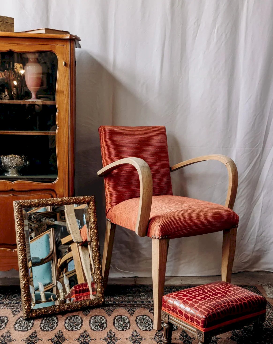 Adoptez ce fauteuil bridge en bois clair retapissé d'un tissu rouge chaleureux, dont le dossier et l'assise offrent une assise accueillante et structurée. La structure en bois souligne des lignes simples et élégantes tandis que les petits clous apportent une finition soignée, entre tradition et modernité. Sa proportion compacte le rend idéal pour un coin lecture, un bureau ou une entrée, apportant une touche de couleur et de caractère à votre intérieur. Largeur : 53 cm Profondeur : 53 cm Hauteur : 80 cm Hauteur d'assise : 49 cm Profondeur de l'assise : 41 cm Largeur de l'assise : 43 cm État:Occasion: Objet ayant été utilisé. Objet présentant quelques marques d'usure superficielle, ...Occasion: Objet ayant été utilisé. Objet présentant quelques marques d'usure superficielle, entièrement opérationnel et fonctionnant correctement. Il peut s'agir d'un modèle de démonstration ou d'un objet retourné en magasin après une courte période d'utilisation. les éventuelles imperfections. Couleur:Multicouleur Hauteur:Bois, Tissu Largeur:Fauteuils et chauffeuses Marque:Debongout Type:Produit chiné Matériau:Bois, Tissu Style:Campagne