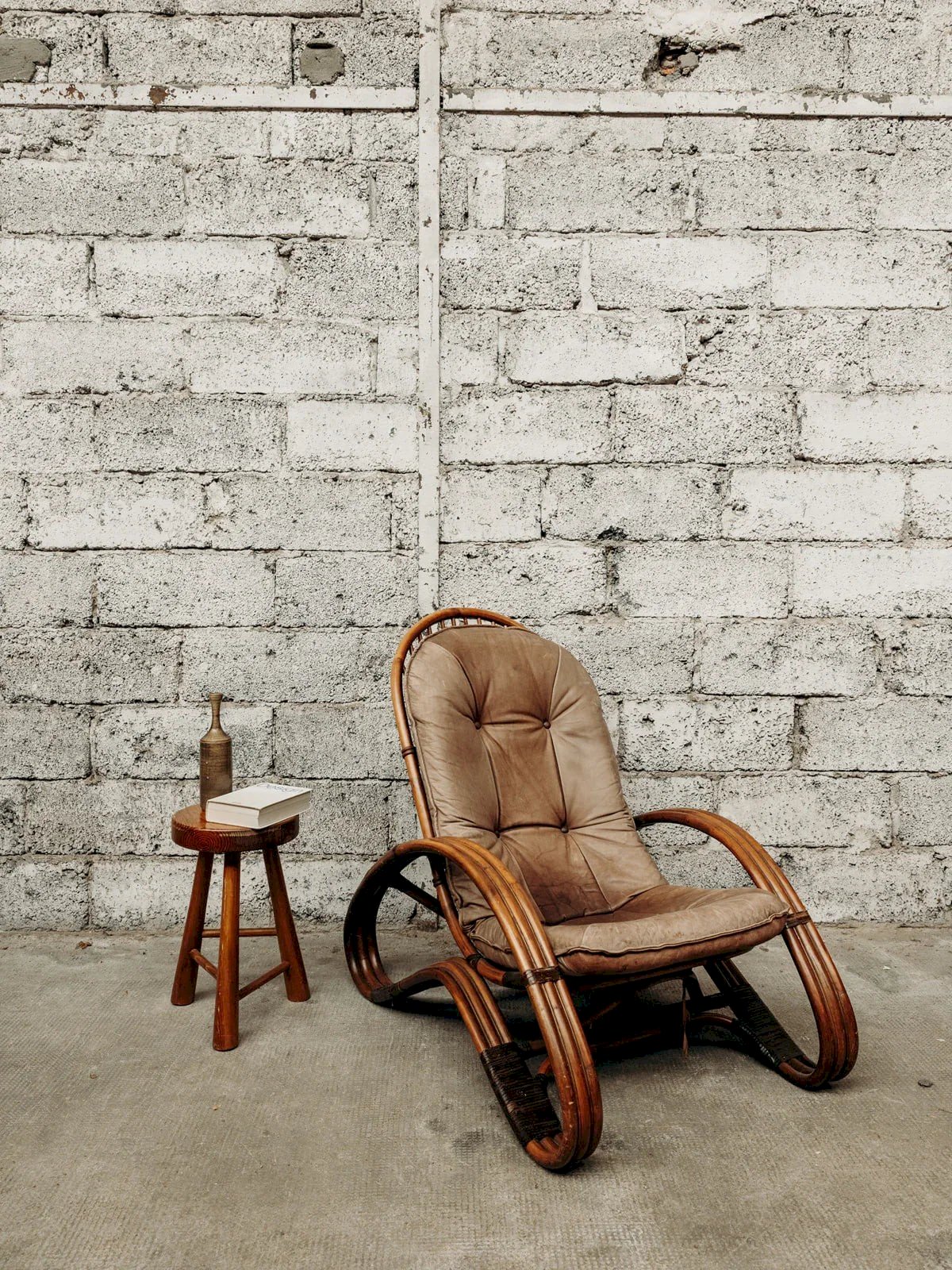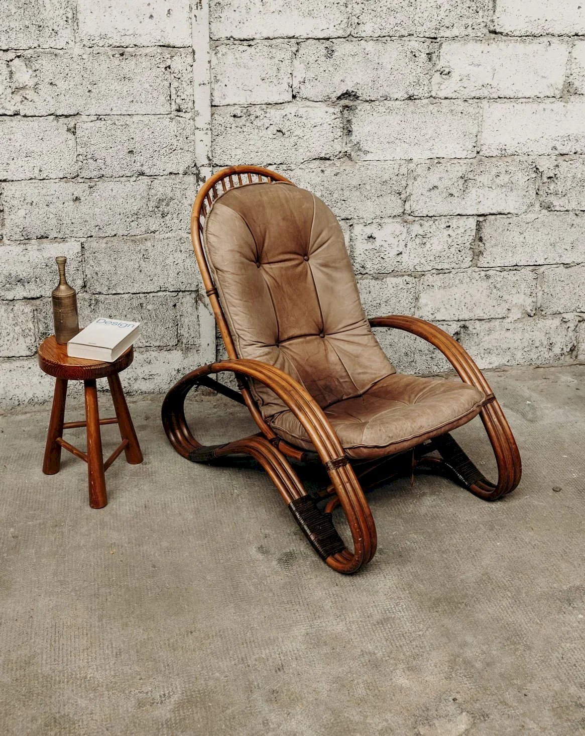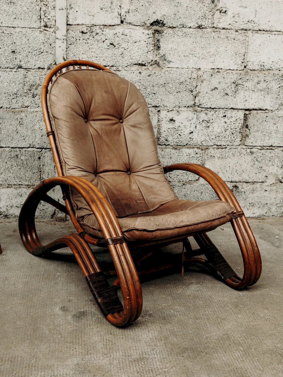 Découvrez ce fauteuil dans le style Paul Frankl des années 60, alliant élégance et confort. Son cadre en bambou, associé à des pieds en rotin foncé, lui confère un charme exotique et une allure rétro. Le coussin en cuir marron épais, bien que légèrement abîmé, reste très confortable et ajoute du caractère à la pièce. Les accoudoirs en forme de L apportent une touche unique à son design. Parfait pour ceux qui recherchent un fauteuil à la fois esthétique et très agréable à utiliser. Longueur : 69 cm Hauteur : 97 cm Hauteur d'assise : 37 cm Profondeur : 100 cm État:Occasion: Objet ayant été utilisé. Objet présentant quelques marques d'usure superficielle, ...Occasion: Objet ayant été utilisé. Objet présentant quelques marques d'usure superficielle, entièrement opérationnel et fonctionnant correctement. Il peut s'agir d'un modèle de démonstration ou d'un objet retourné en magasin après une courte période d'utilisation. les éventuelles imperfections. Couleur:Multicouleur Hauteur:Bambou, Cuir Largeur:Fauteuils et chauffeuses Marque:Debongout Type:Produit chiné Matériau:Bambou, Cuir Style:Campagne