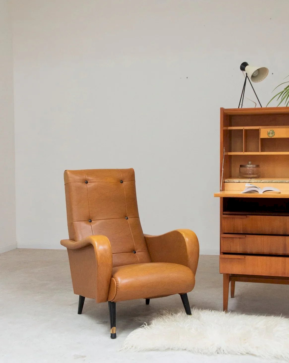 Adoptez ce fauteuil en skaï marron au charme rétro, où le simili-cuir enveloppe une assise généreuse et confortable, invitant à la pause. Ses accotoirs incurvés et ses petits clous raffinés lui apportent une silhouette élégante, tandis que les pieds compas noirs et dorés soulignent un style mid-century sophistiqué. Compact et bien proportionné, il trouve sa place dans un salon intime, un coin lecture ou une chambre, pour une atmosphère chaleureuse et contemporaine. Largeur : 67 cm Hauteur : 93 cm Hauteur d'assise : 37 cm Profondeur : 80 cm Profondeur de l'assise : 53 cm Largeur de l'assise : 50 cm État:Occasion: Objet ayant été utilisé. Objet présentant quelques marques d'usure superficielle, ...Occasion: Objet ayant été utilisé. Objet présentant quelques marques d'usure superficielle, entièrement opérationnel et fonctionnant correctement. Il peut s'agir d'un modèle de démonstration ou d'un objet retourné en magasin après une courte période d'utilisation. les éventuelles imperfections. Couleur:Multicouleur Hauteur:Skaï, Simili cuir, Métal Largeur:Fauteuils et chauffeuses Marque:Debongout Type:Produit chiné Matériau:Skaï, Simili cuir, Métal Style:Campagne