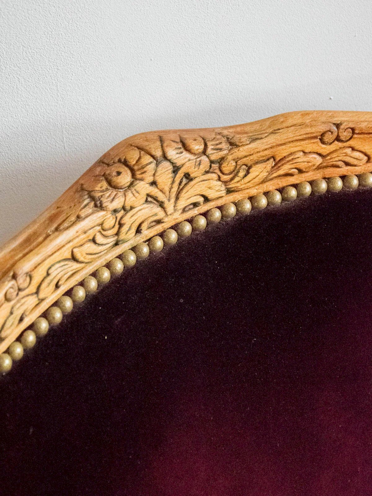 Adoptez ce fauteuil en bois clair habillé d'un velours violet, dont le dessin d'inspiration ancienne évoque une élégance discrète. Les accoudoirs sculptés et la silhouette compacte offrent une assise confortable, idéale pour un coin lecture ou pour apporter une touche de caractère au salon ou à la chambre. Le mariage du bois clair et du velours crée une ambiance chaleureuse et raffinée, où texture et couleur se répondent avec délicatesse. Longueur : 55 cm Largeur : 51 cm Hauteur : 87 cm Hauteur d'assise : 42 cm Largeur de l'assise : 45 cm État:Occasion: Objet ayant été utilisé. Objet présentant quelques marques d'usure superficielle, ...Occasion: Objet ayant été utilisé. Objet présentant quelques marques d'usure superficielle, entièrement opérationnel et fonctionnant correctement. Il peut s'agir d'un modèle de démonstration ou d'un objet retourné en magasin après une courte période d'utilisation. les éventuelles imperfections. Couleur:Multicouleur Hauteur:Bois, Velours Largeur:Fauteuils et chauffeuses Marque:Debongout Type:Produit chiné Matériau:Bois, Velours Style:Campagne