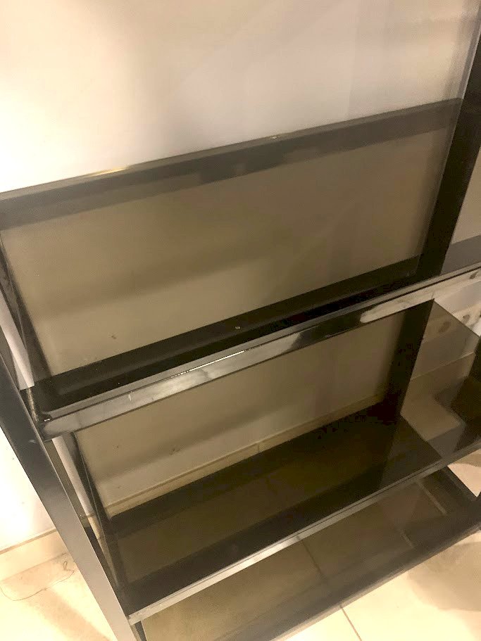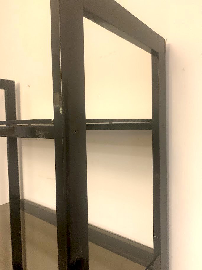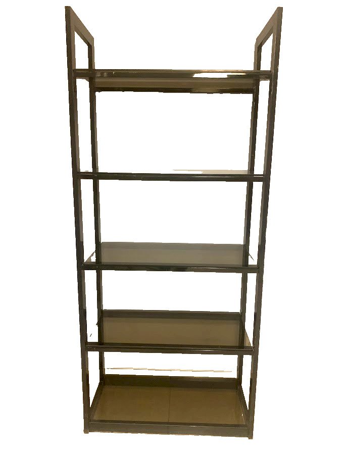 Etagère en métal chromé et verre fumé Ossature en rectangle chromé Cinq étagère en verre épais fumé Bon état Dimension H 196 x L 84 x 40 cm XX siècle Type:Rangement Période:Design du XXème Origine:France Pays d'origine:Etagère Hauteur:196 Longueur:84 Largeur:40