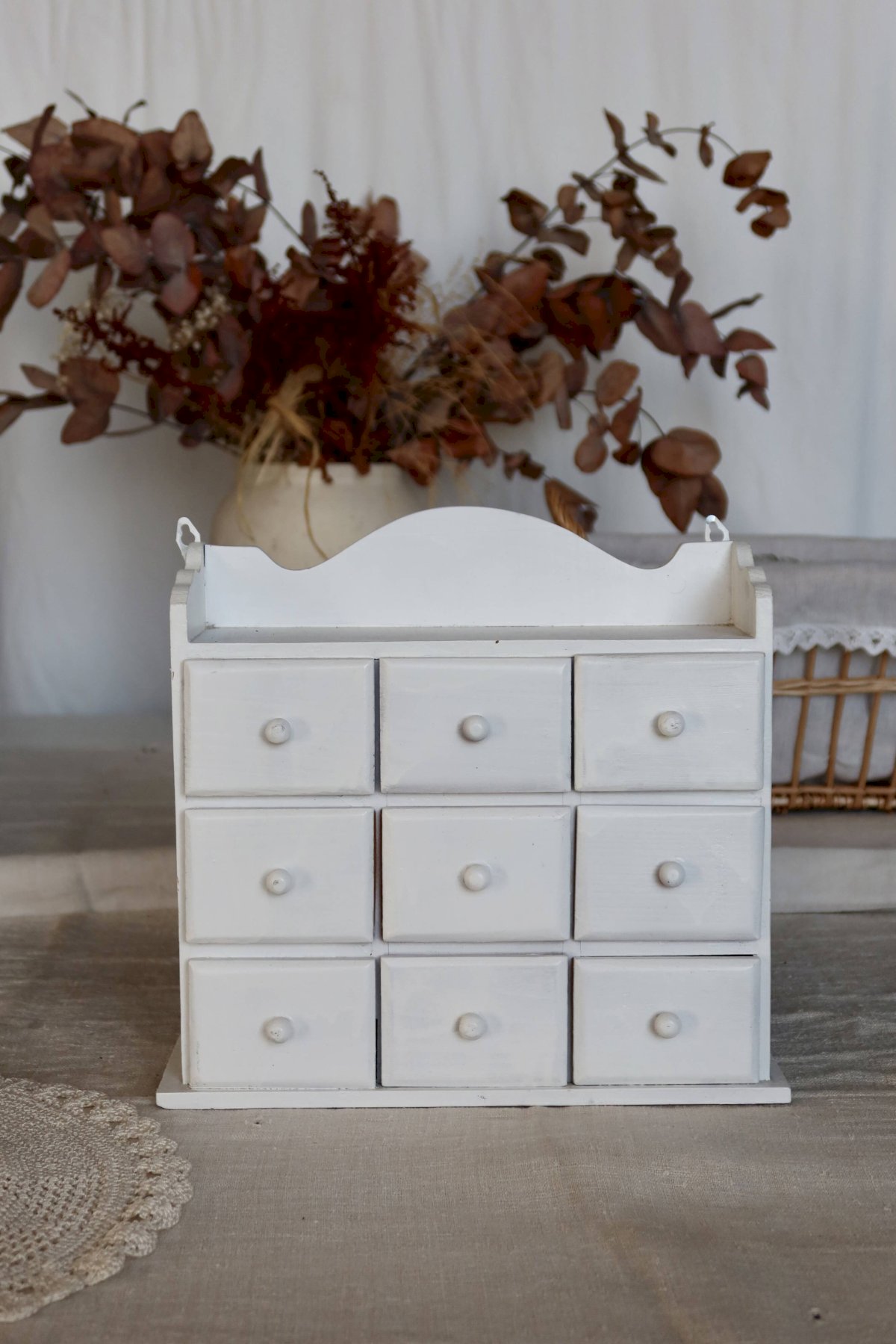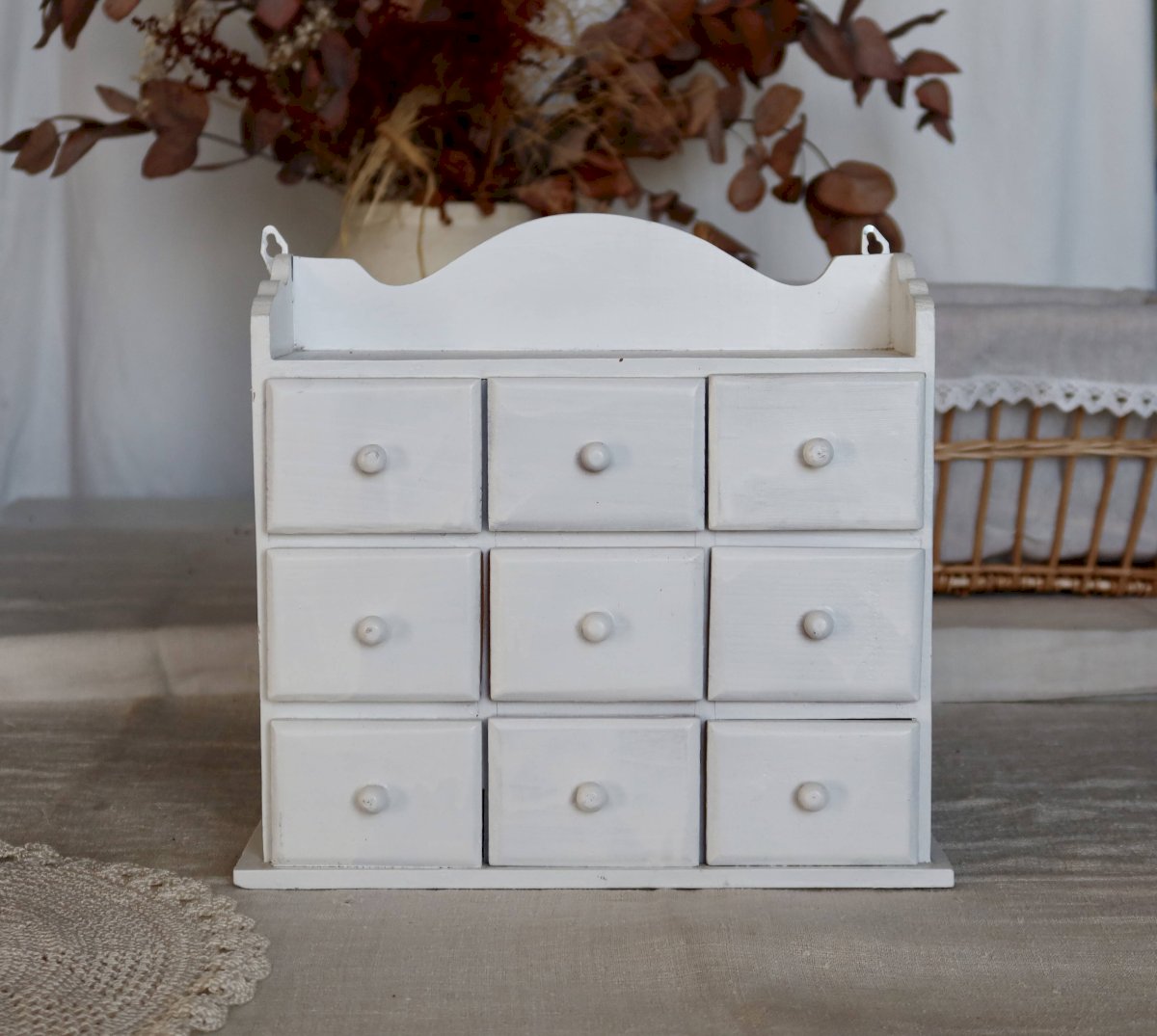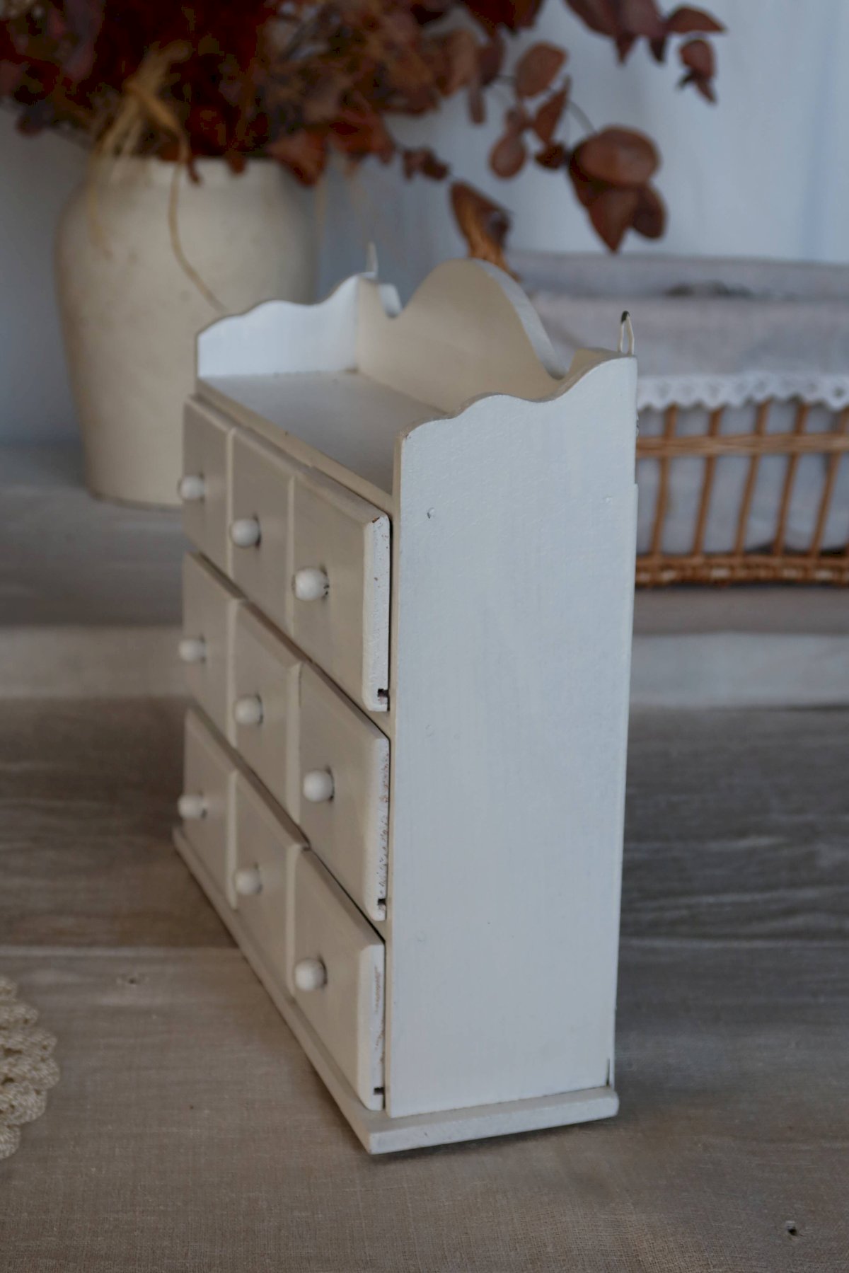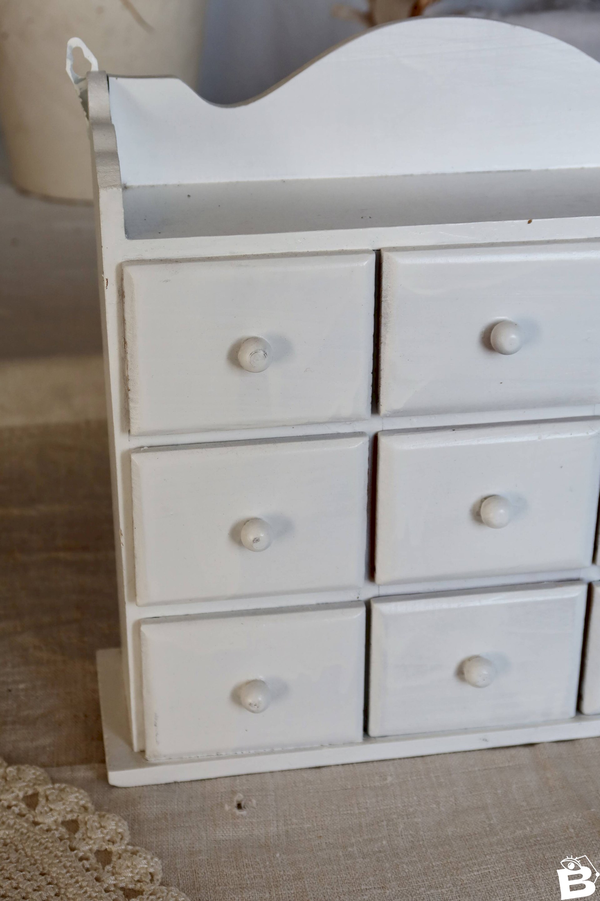 Étagère murale vintage bois blanc (pin) 9 tiroirs