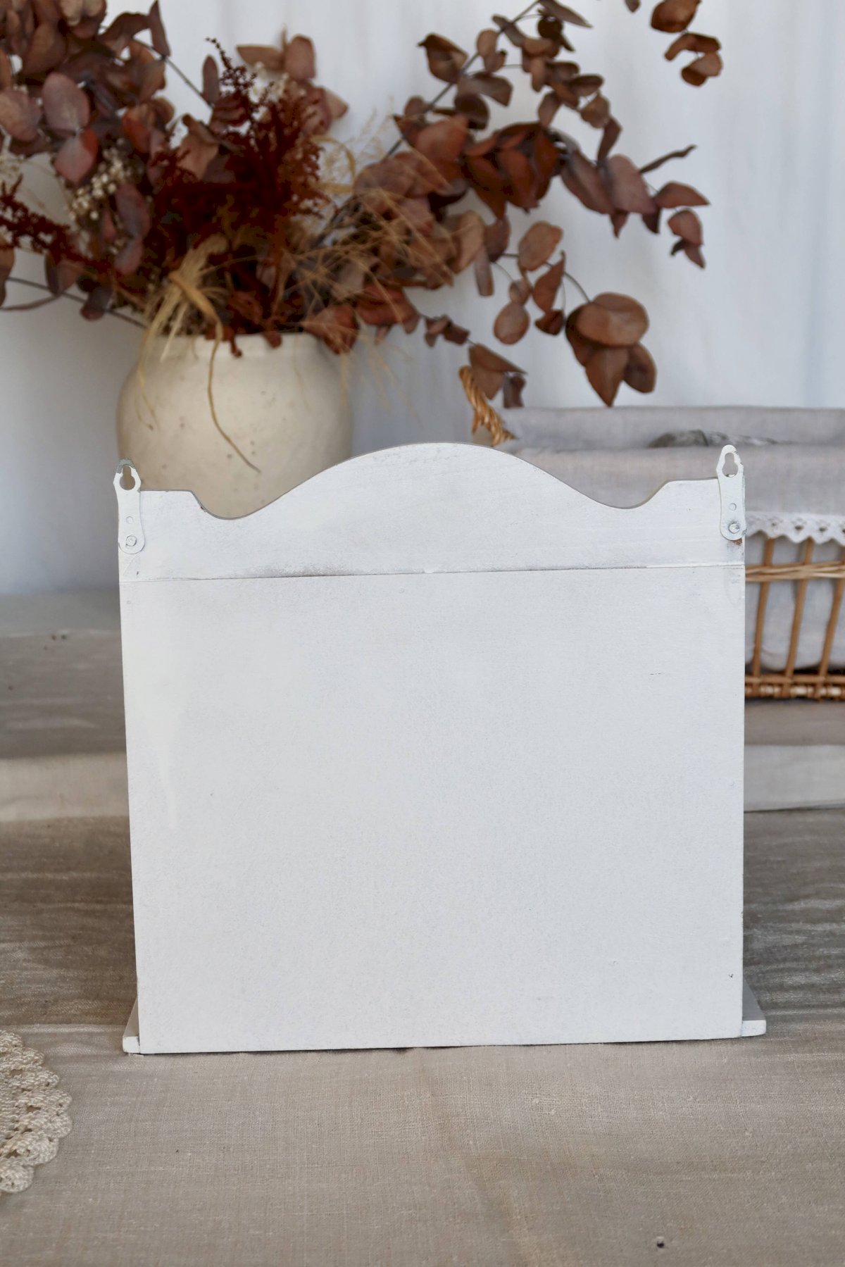 Se fixe au mur grâce aux deux œillets métalliques en haut (peut aussi se poser).Dimensions (approx.): 29 X 26 X 19 cm.Couleur: blanc mat cassé.Matière: bois de pin.État: très bon, minimes traces d’usage/cohérentes avec le style peint.