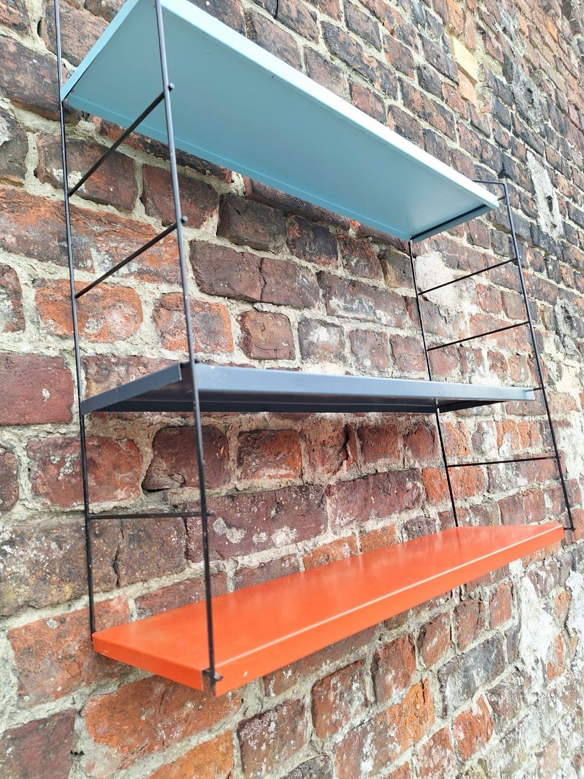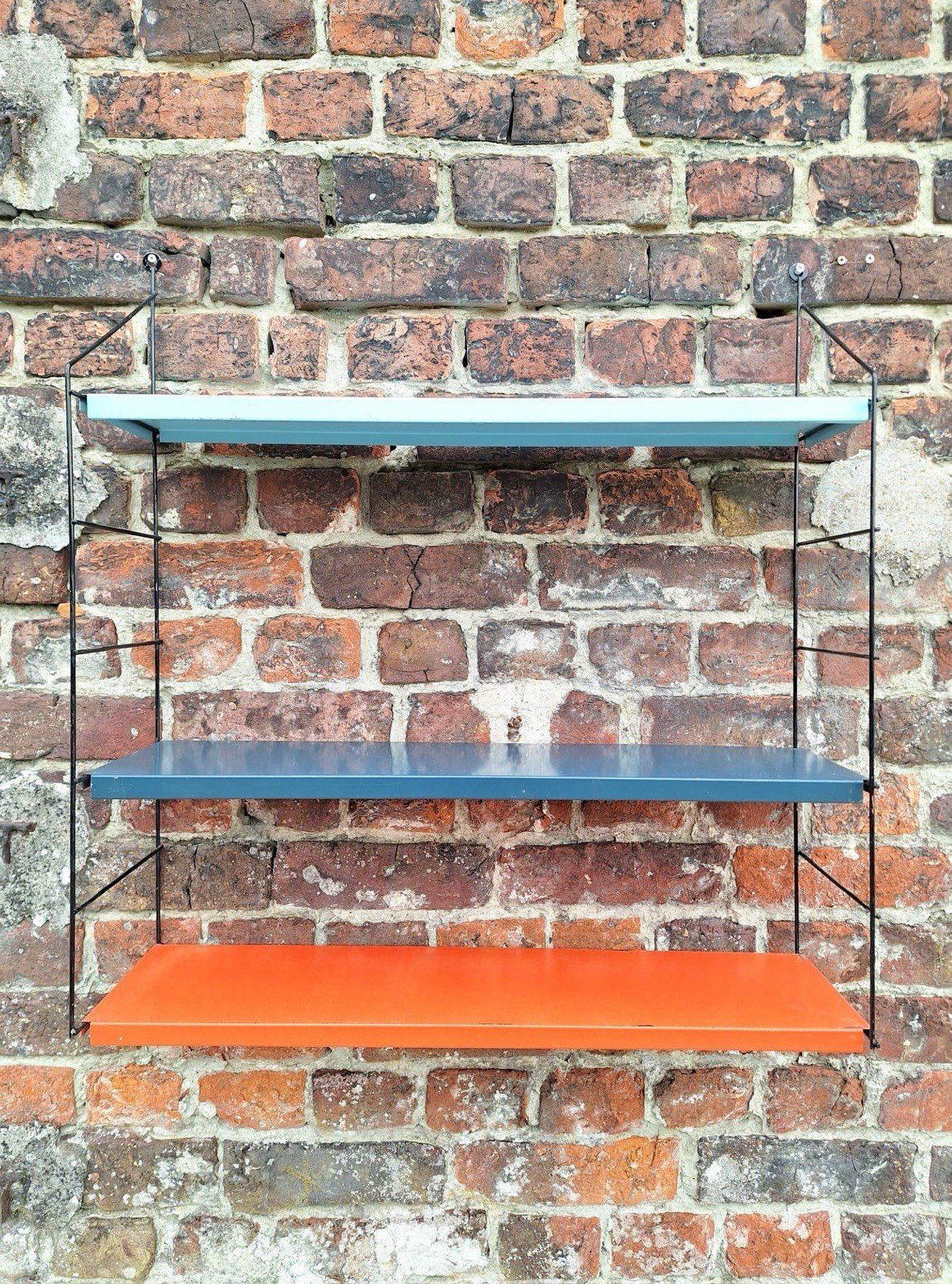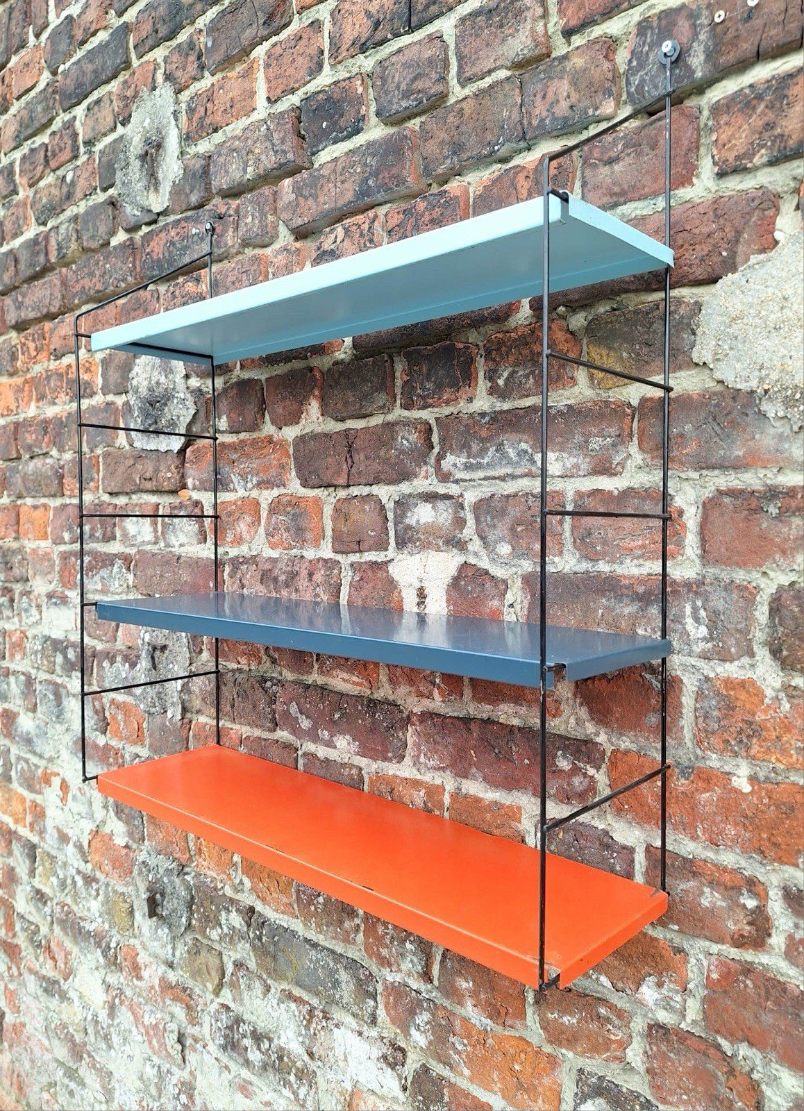 Merci de m’écrire si vous souhaitez me faire une offre. Étagères vintage métal, rangement design Dimensions totales : longueur 64cm, profondeur 19cm , hauteur (réglable) 70cm. Les 2 montants sont en métal noir et les 3 plateaux en métal coloré (bleu clair, bleu foncé et corail). Traces d’usage normales au regard de leur âge : coups, éclats, oxydations, tâches, cf photos. Style Tomado ou String. Remise à mon domicile ou envoi possible en relais colis pour 9,35€. Meuble bibliothèque industriel pop scandinave. Sous-type:Etagère Type:Rangement Matière:Métal