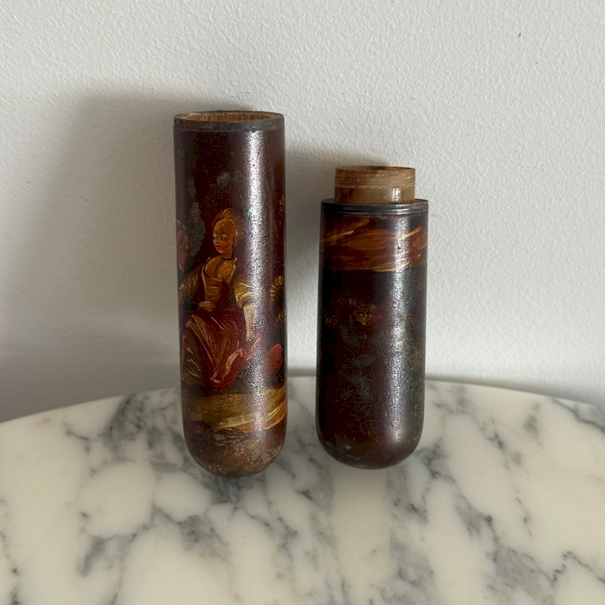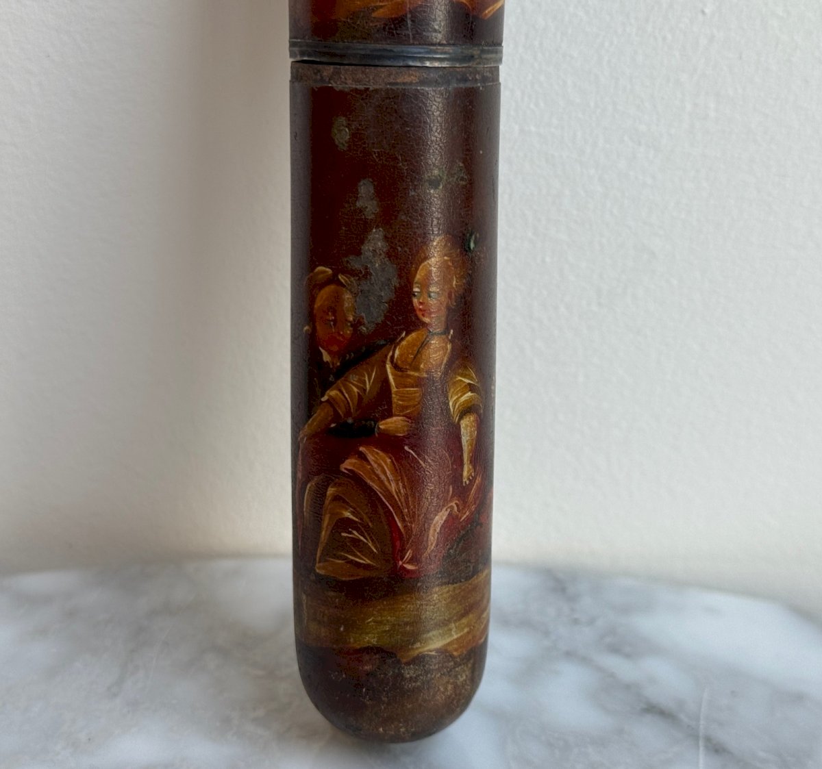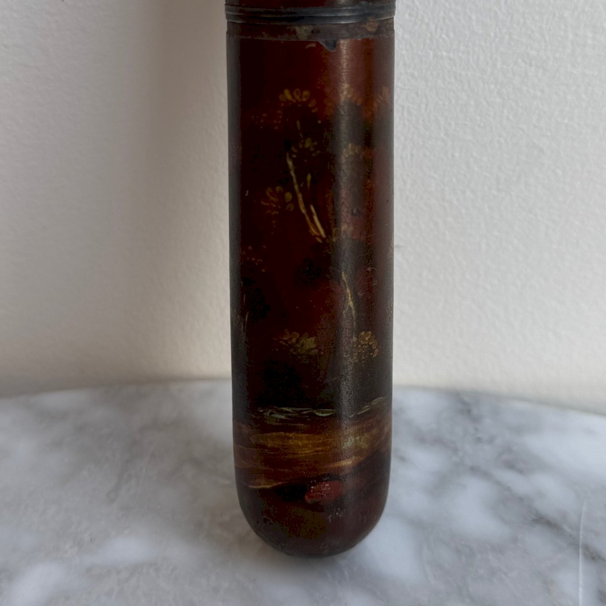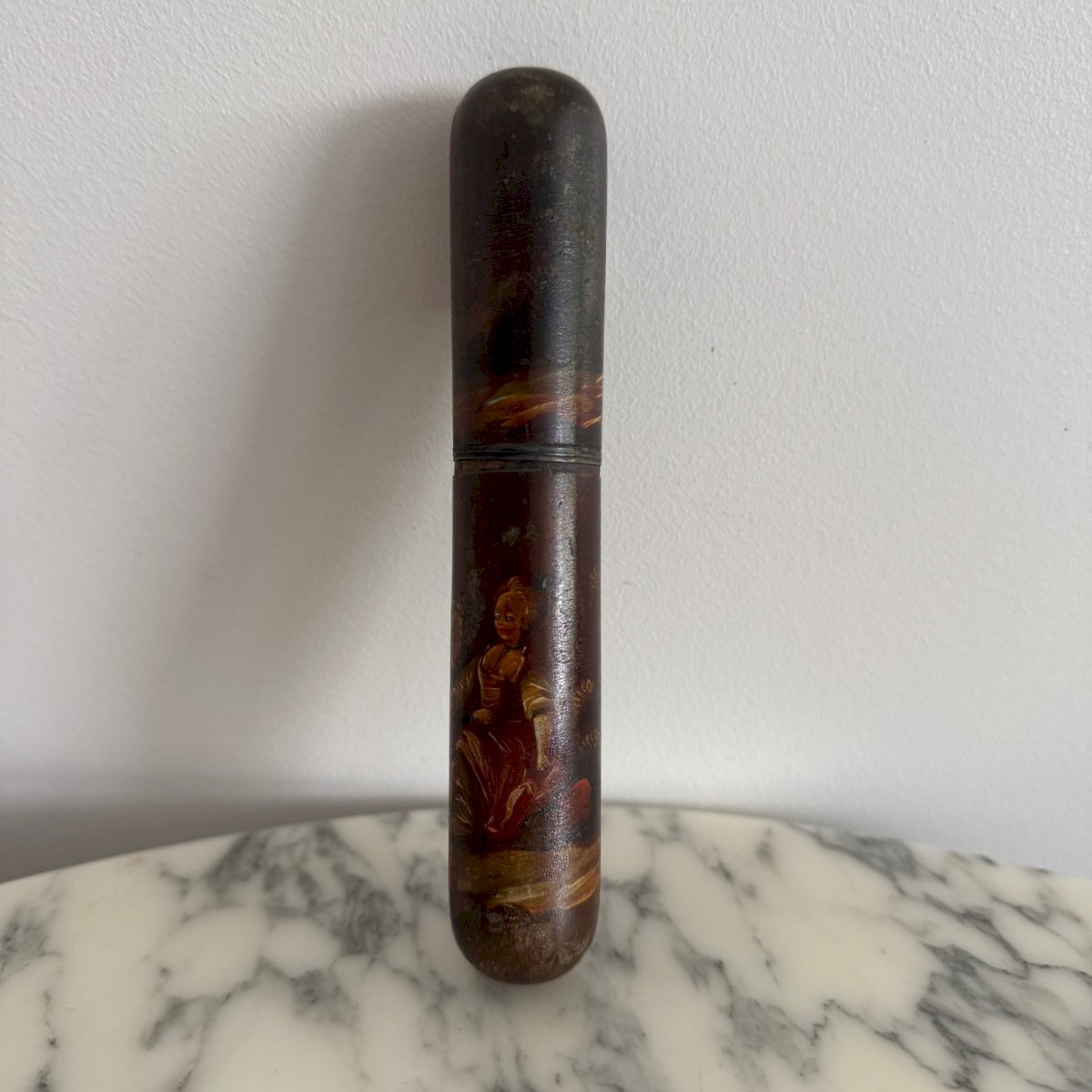 Étui à messages en vernis Martin XVIIIe M3711 Cet étui à messages est ornementé d'une femme en costume et d'un décor paysager sur l'arrière. Pour l'état, notons des traces d'usure classique sur ce type d'objet, nous signalons qu'il manque une bague. L'étui reste cependant dans un état général présentable. Nos photos vous permettent d'apprécier la qualité de l'objet. Merci de bien détailler les photos. N'hésitez pas à zoomer . Les photos font partie intégrante de la description. Dimensions : Hauteur : 14,1 cm Diamètre : 2,5 cm P :  1633756   Je reste à votre disposition pour toute question. Type:Objet de vitrine, Décoratif Origine:France Sous-type:Étui à messages Matériaux provenant de:France Hauteur:14,1 cm Longueur:cm Largeur:2,5 cm