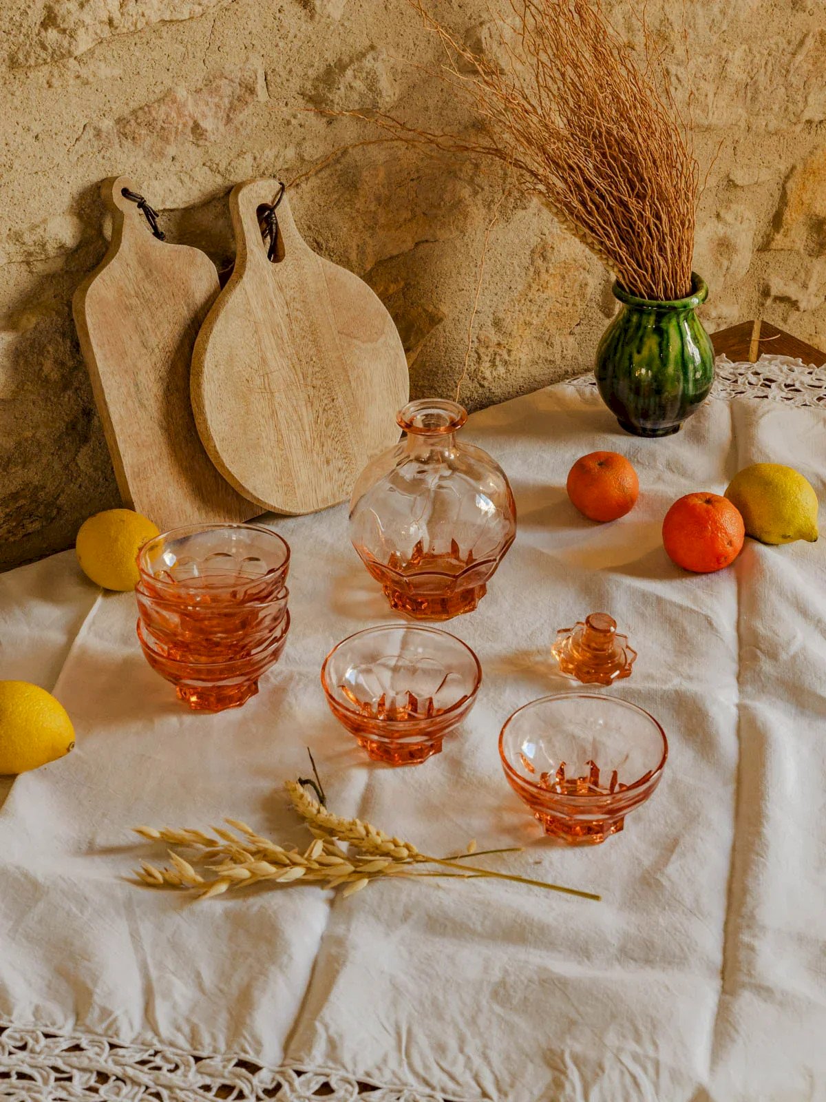 Invitez une douceur vintage à votre table avec ce lot de cinq coupelles à champagne et sa carafe à liqueur en verre rosaline. Le verre fin et lumineux diffuse une teinte rose délicate qui sublime bulles et nectars, tandis que les proportions discrètes des coupelles et le goulot précis de la carafe favorisent un service raffiné. Idéal pour apéritifs intimistes, desserts en petites portions ou mises en scène élégantes, cet ensemble apporte une note rétro et poétique à vos moments partagés. Coupelle Hauteur : 5 cm Diamètre : 9 cm Carafe Hauteur : 14 cm État:Occasion: Objet ayant été utilisé. Objet présentant quelques marques d'usure superficielle, ...Occasion: Objet ayant été utilisé. Objet présentant quelques marques d'usure superficielle, entièrement opérationnel et fonctionnant correctement. Il peut s'agir d'un modèle de démonstration ou d'un objet retourné en magasin après une courte période d'utilisation. les éventuelles imperfections. Marque:Debongout Type:Produit chiné Matériau:Verre Style:Campagne