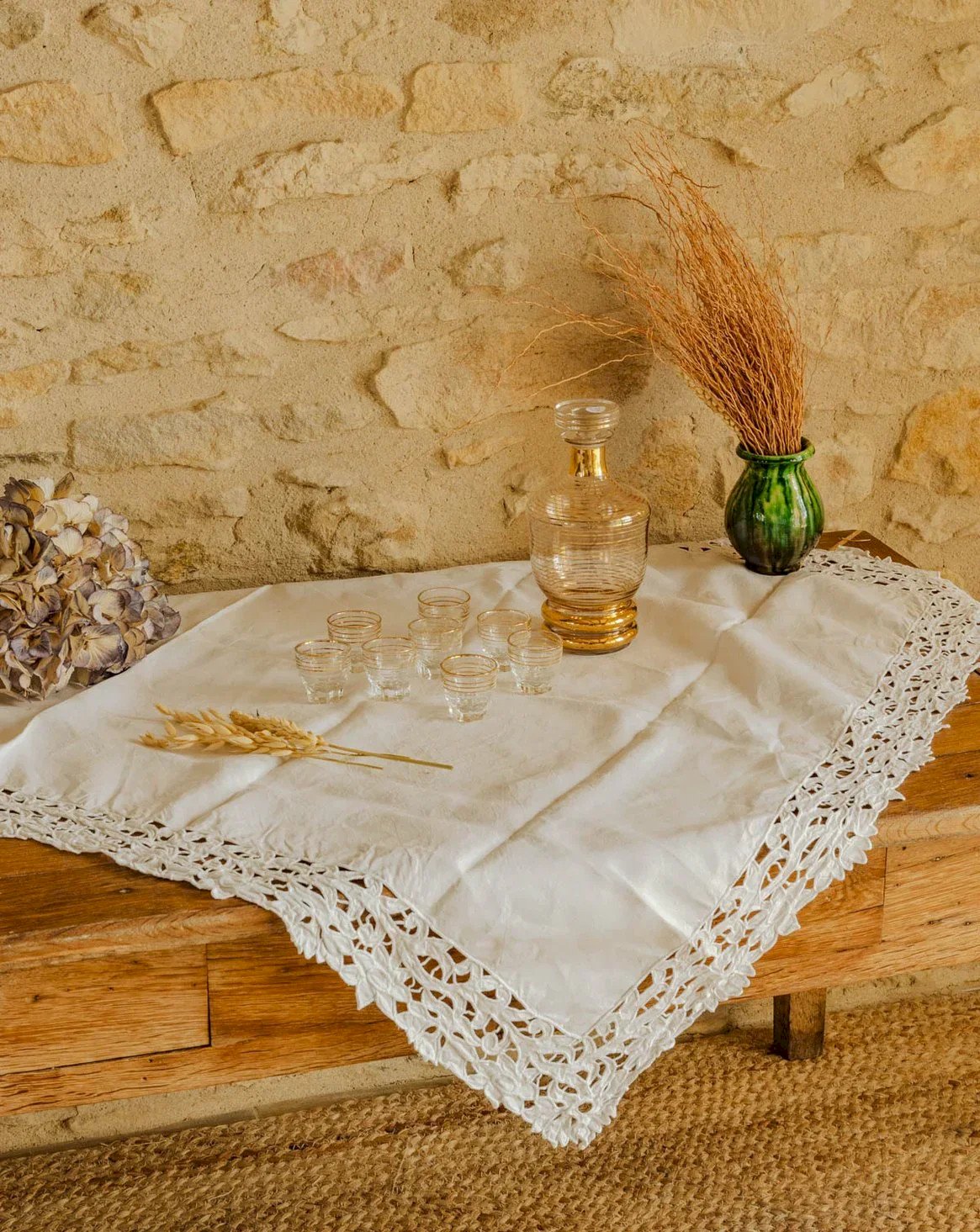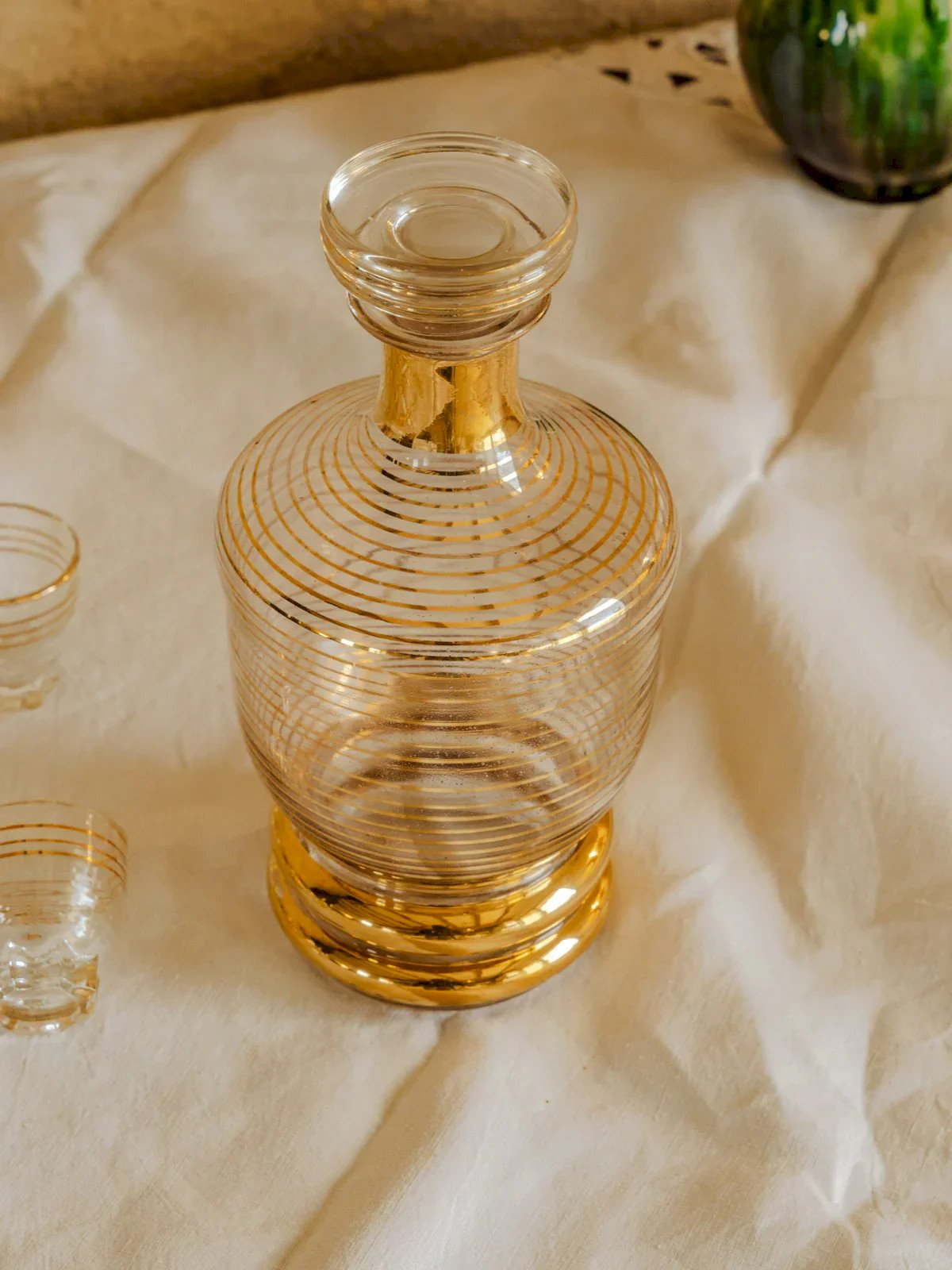 Offrez un ensemble à liqueur composé d'une carafe et de huit petits verres en verre fin, délicatement cerclés de dorures. La carafe, d'une contenance d'environ 500 ml, facilite le service pour plusieurs dégustations tandis que les verres, aux proportions justes, concentrent les arômes pour un instant convivial. Le contraste entre la transparence du verre et l'éclat doré apporte une élégance discrète, parfaite pour sublimer un apéritif intimiste ou accompagner un moment de partage. Carafe Hauteur : 18 cm Diamètre : 1 cm Verre Hauteur : 4 cm Diamètre : 4 cm État:Occasion: Objet ayant été utilisé. Objet présentant quelques marques d'usure superficielle, ...Occasion: Objet ayant été utilisé. Objet présentant quelques marques d'usure superficielle, entièrement opérationnel et fonctionnant correctement. Il peut s'agir d'un modèle de démonstration ou d'un objet retourné en magasin après une courte période d'utilisation. les éventuelles imperfections. Marque:Debongout Type:Produit chiné Matériau:Verre Style:Campagne