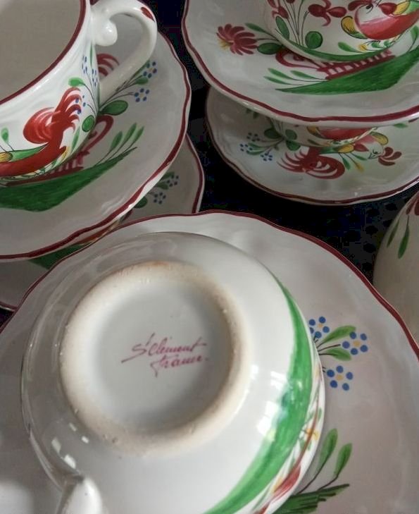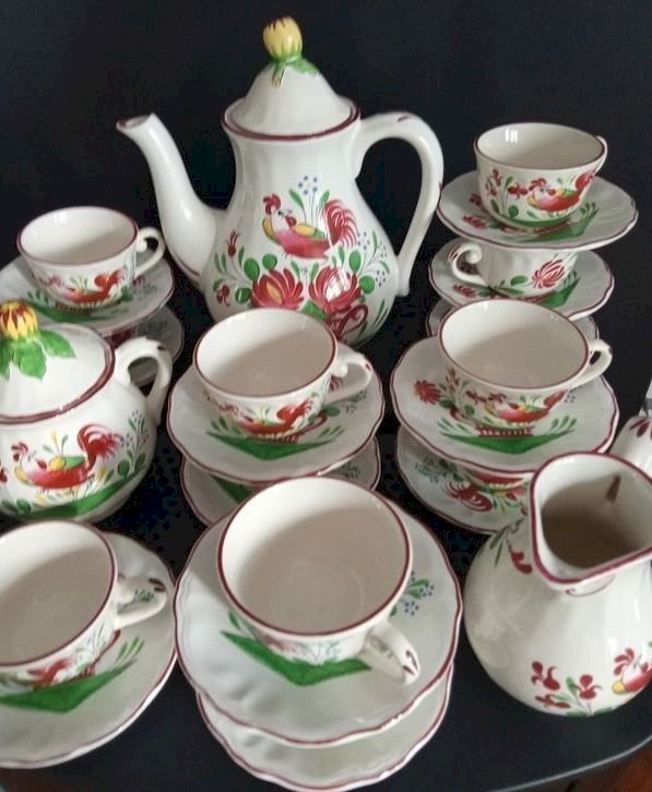 Exceptionnel service à café de la faïencerie de St Clément au motif COQ. EXCELLENT ETAT : aucune fêlure, aucune égratignure, ...
