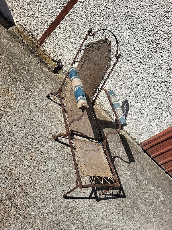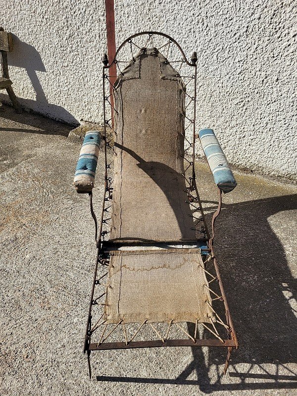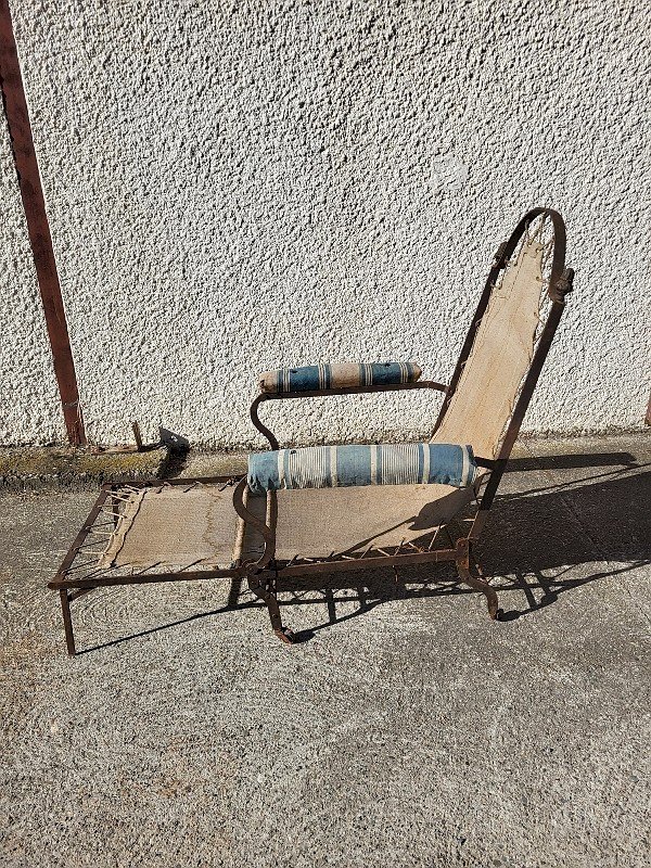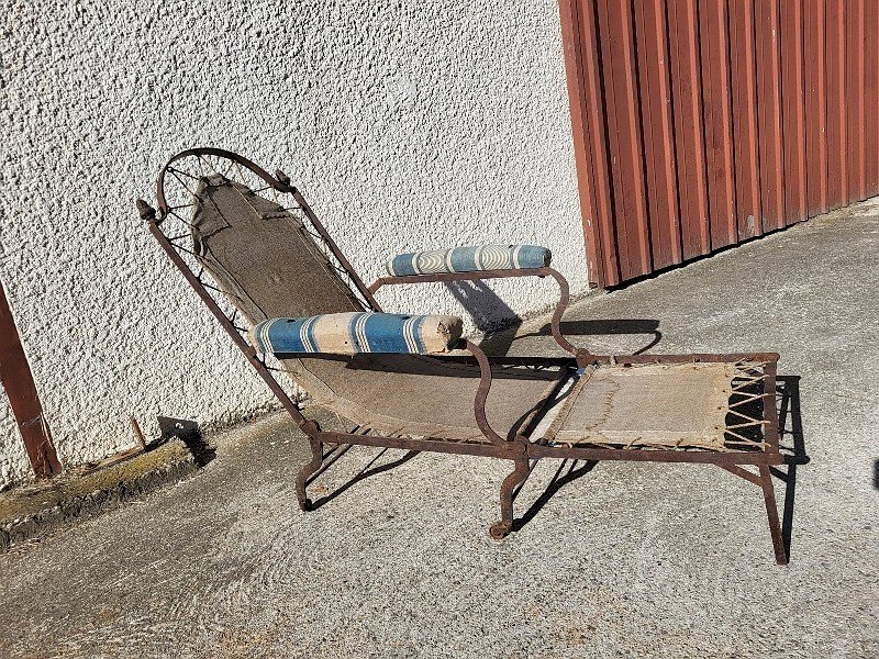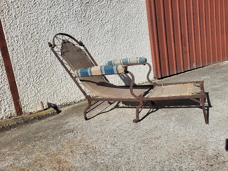 superbe fauteuil chaise longue pliante de campagne avec son repose pied Empire du XIX ème siècle il est en fer forgé il est sur roulettes le dossier est garni de 2 glands en laiton il y a sa toile écrue qui est tendue par un cordage tressé il manque les coussins c'est une très belle pièce dans son jus il mesure 200 cm de long sur 78 cm de large et 130 cm de hauteur max du dossier la hauteur d'assise est de 30 cm  Je reste à votre disposition pour toutes vos questions ou par email ou par téléphone : . pour d'autres photos plus grandes envoyez moi votre email. pour une livraison entre le sud et paris demandez  le prix a JM TRANSPORTS au 06.12.25.48.48. pour une autre destination contactez moi. Type:Fauteuil Sous-type:Pliante