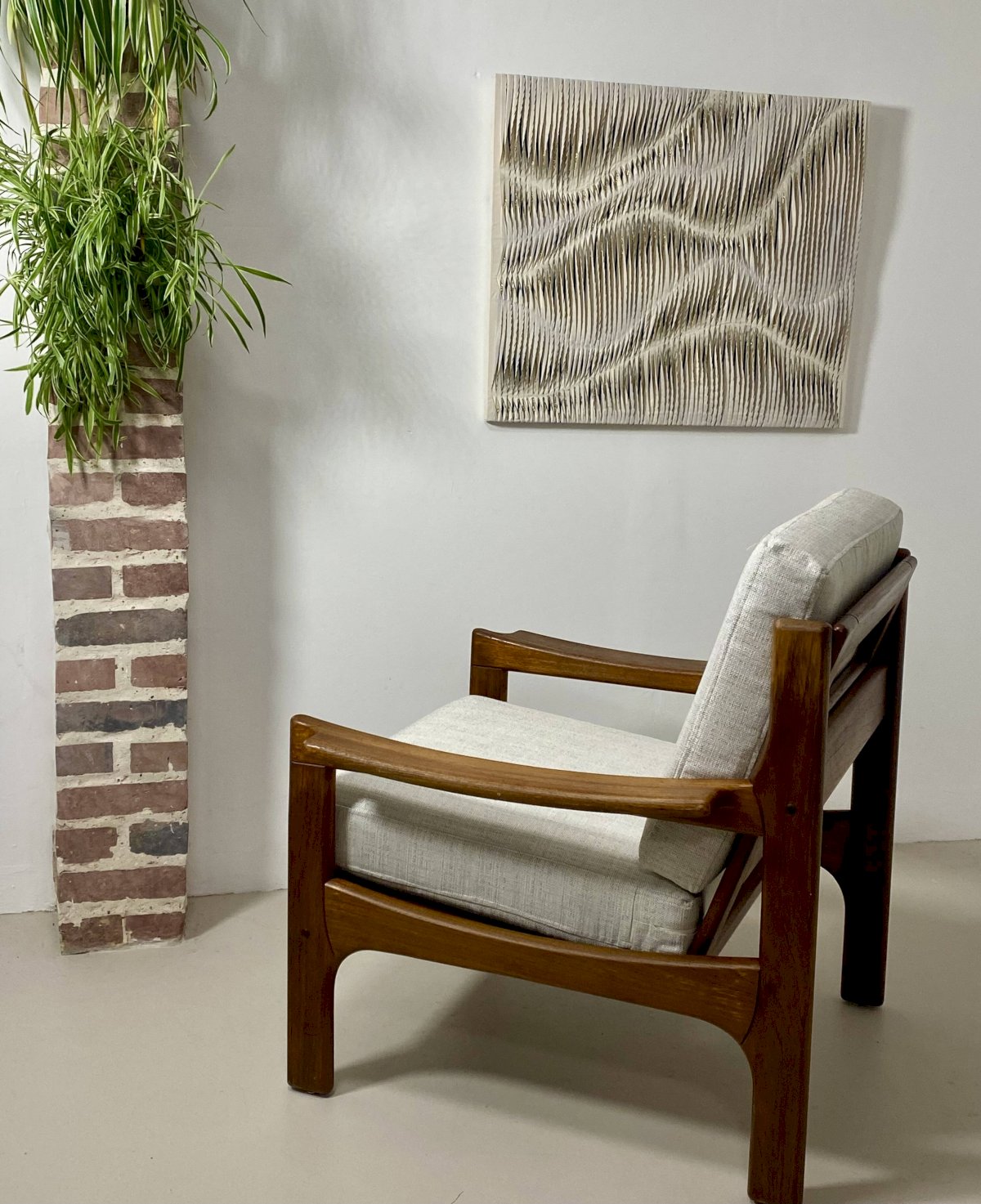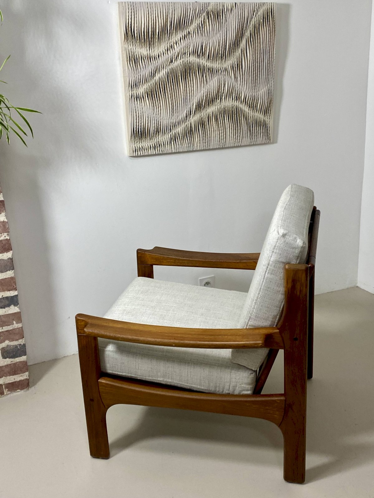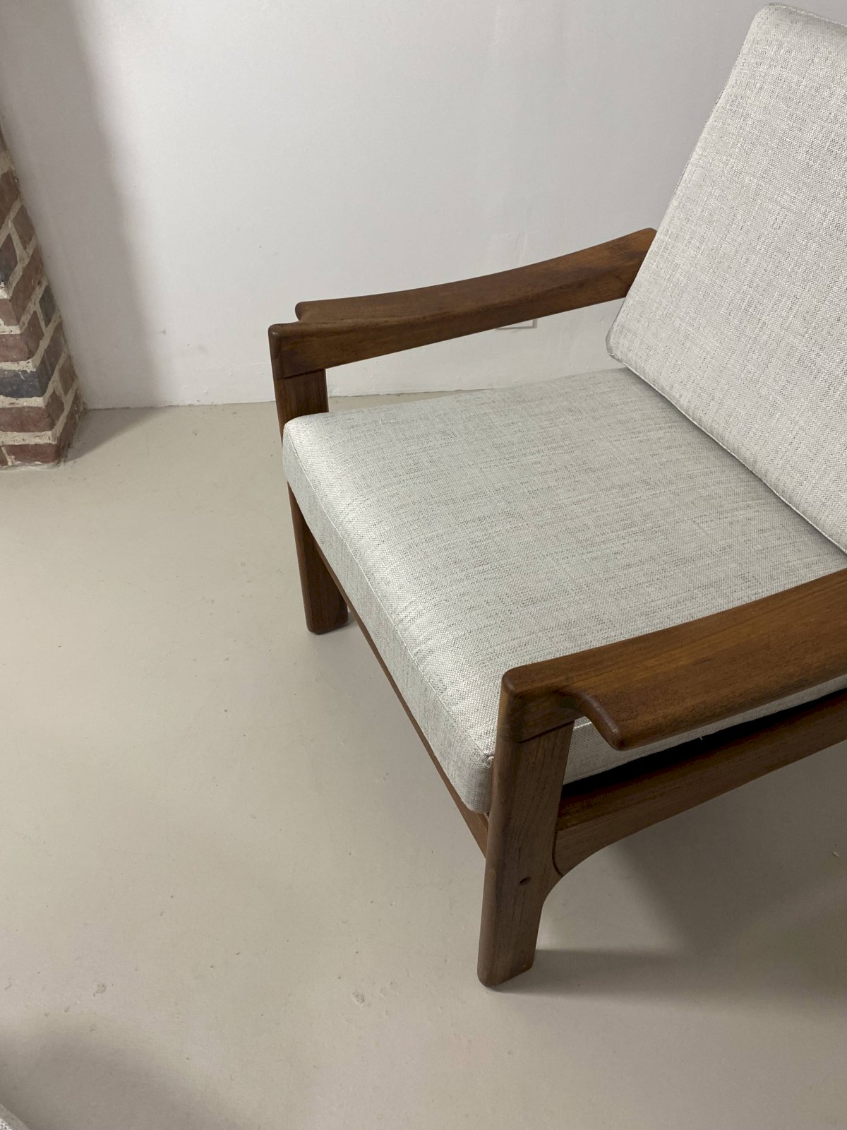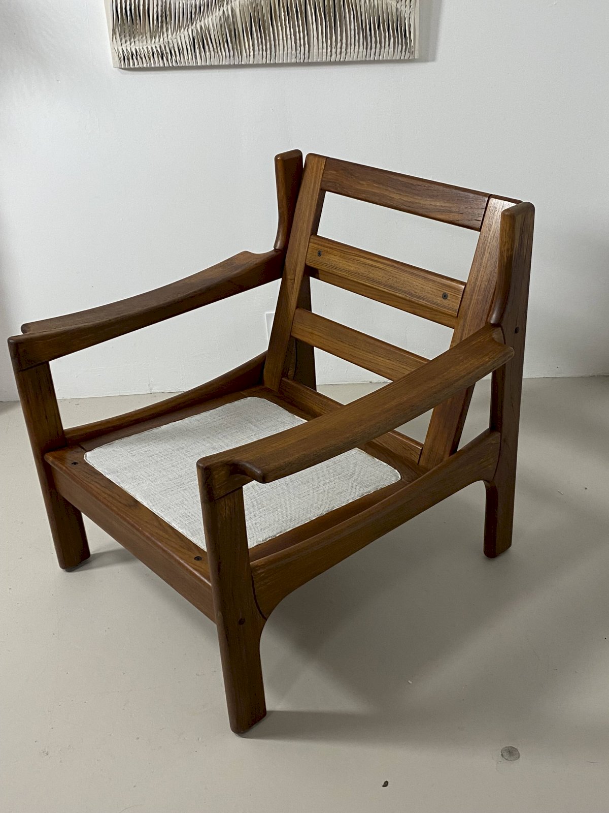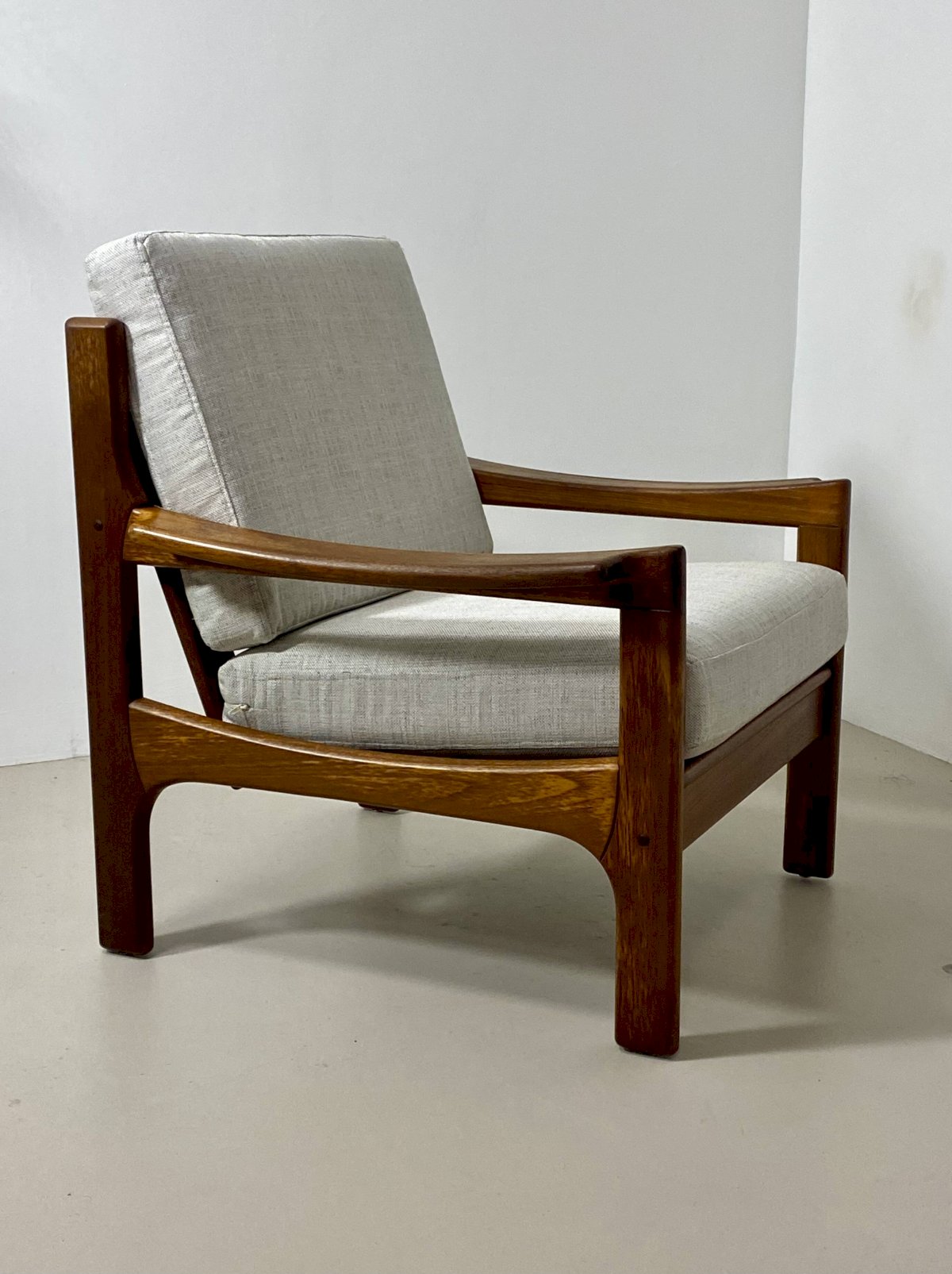 Le cadre en teck d’origine est en parfait état, mettant en valeur la chaleur et la noblesse du bois.L’assise et le dossier sont habillés d’un tissu chiné de couleur blanc cassé, entièrement déhoussable, offrant à la fois praticité et élégance.Dimensions:Largeur: 78 cm.Hauteur totale: 84 cm.Profondeur: 82 cm.