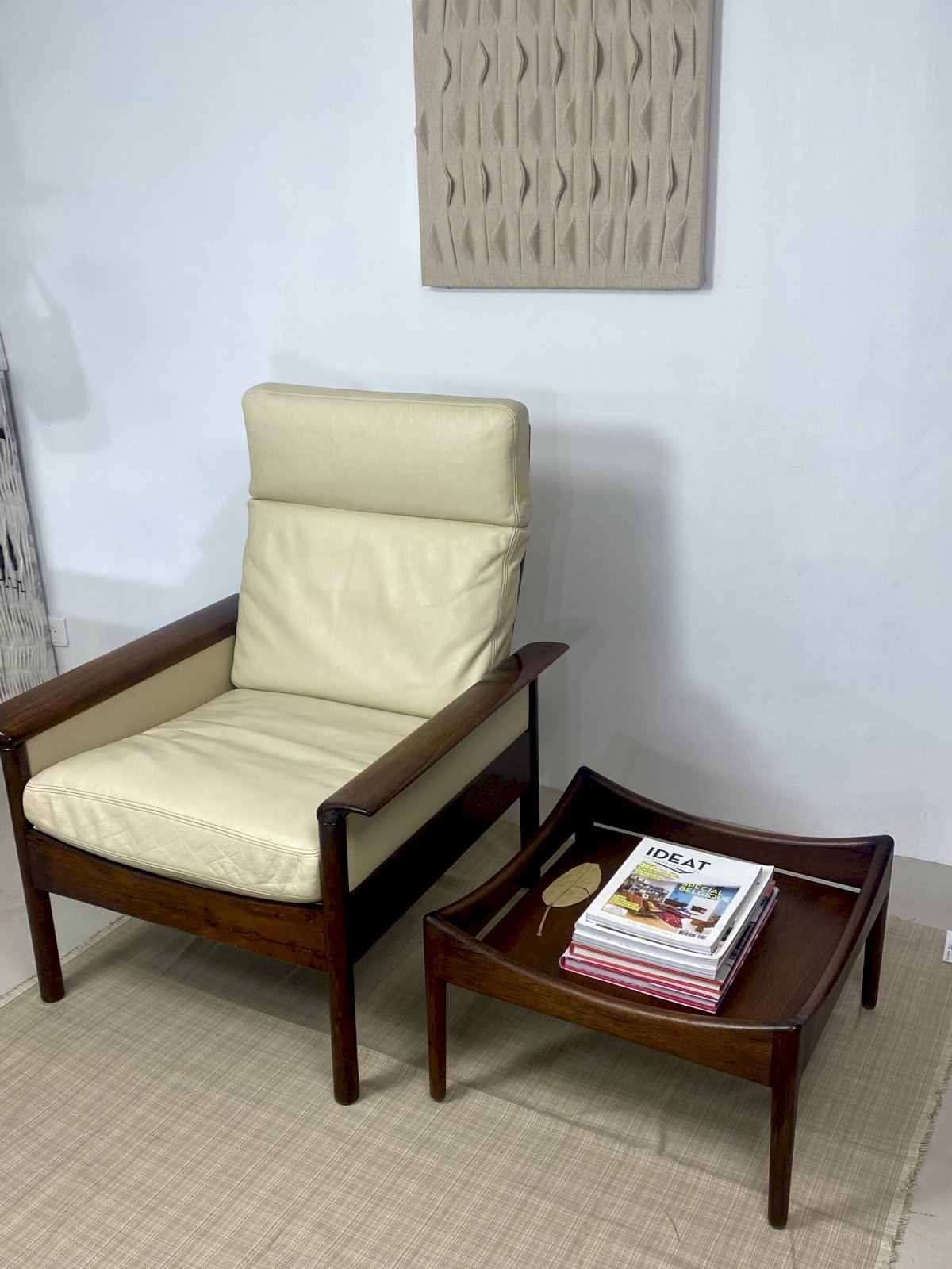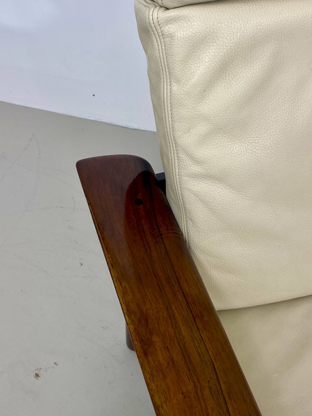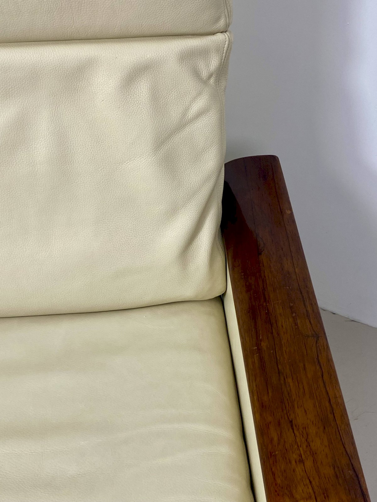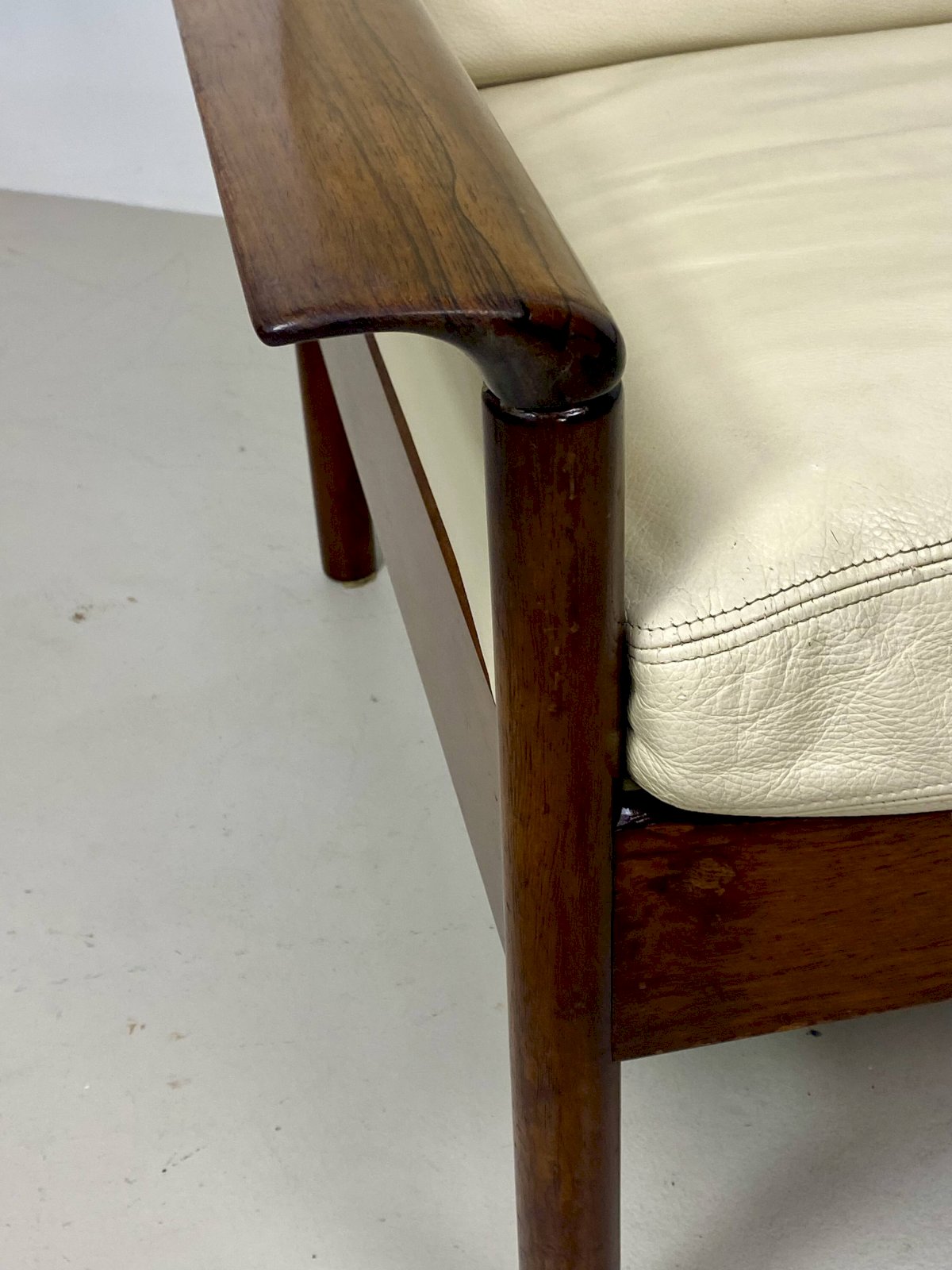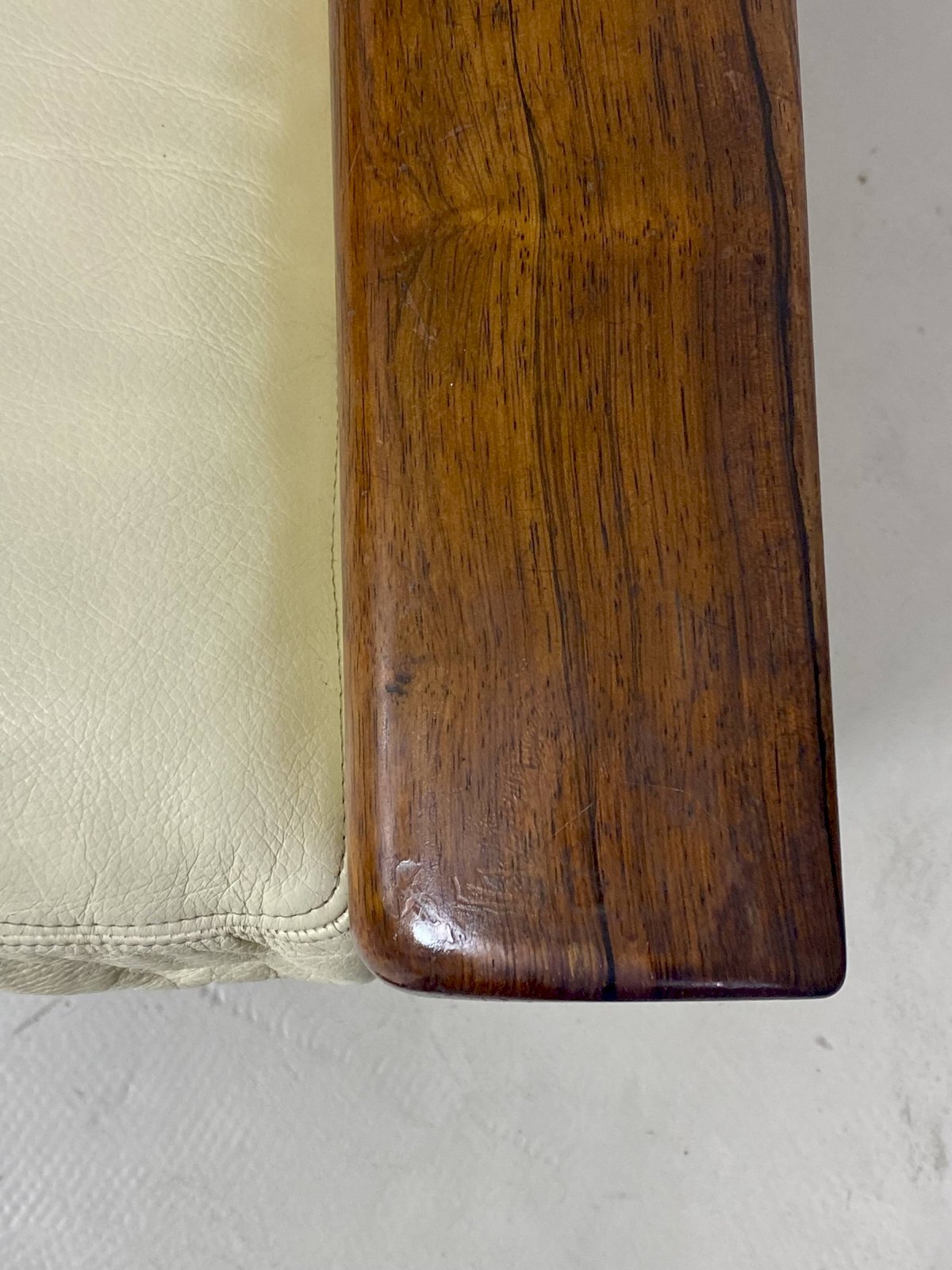 Sa structure en palissandre, essence précieuse et très recherchée, présente une patine profonde et chaleureuse qui souligne la qualité du travail artisanal.Les coussins en cuir crème, d’origine et en excellent état, apportent une touche de douceur tout en offrant un confort remarquable.