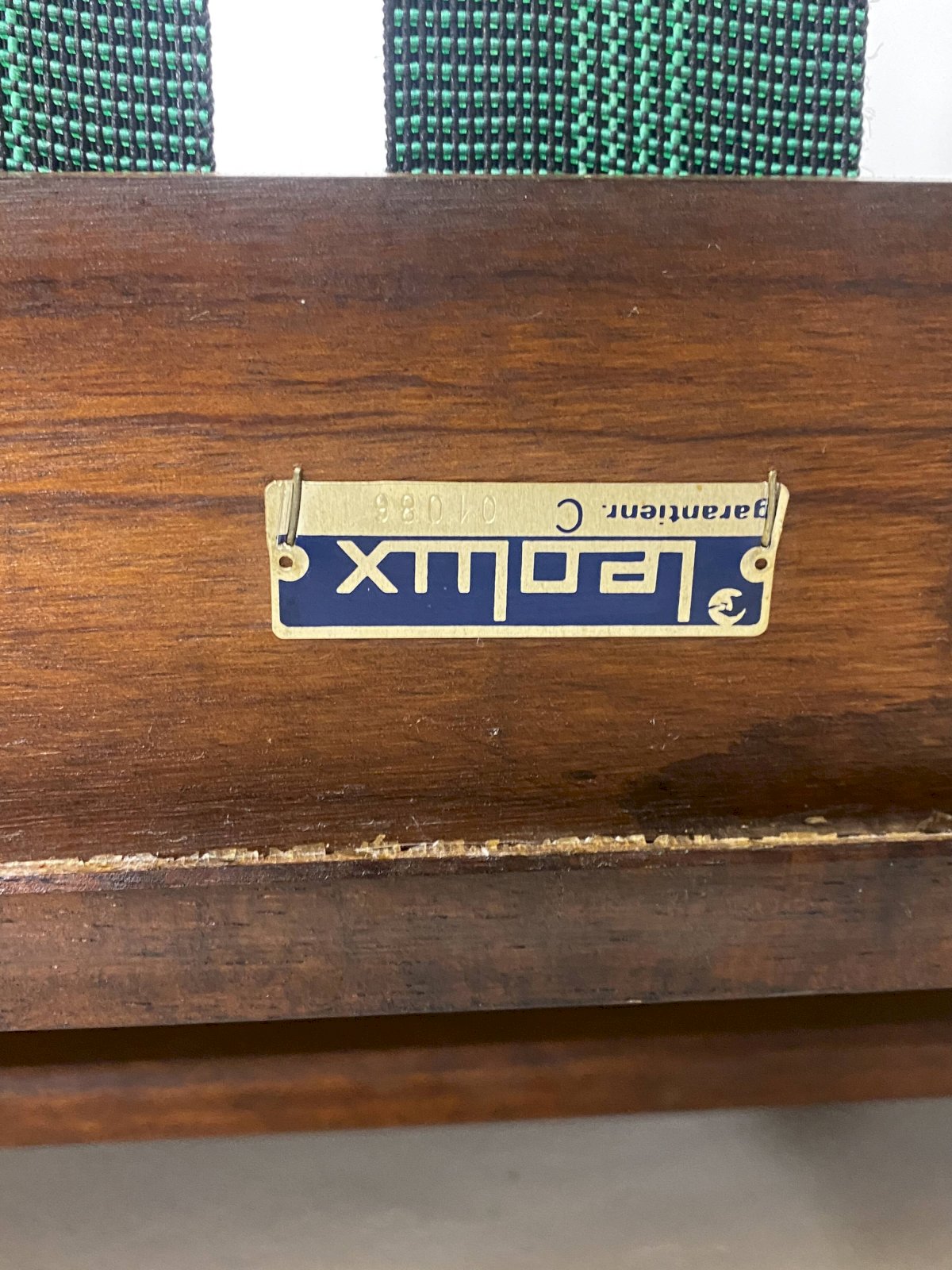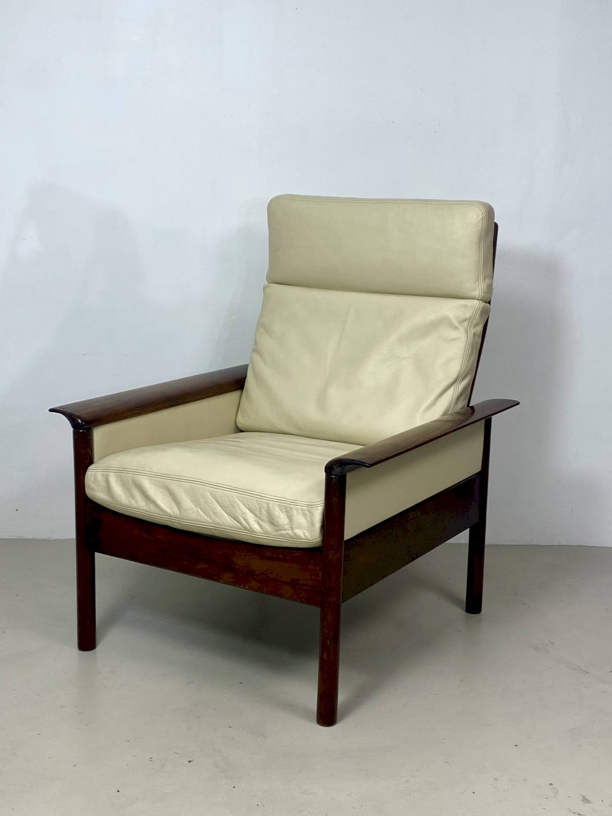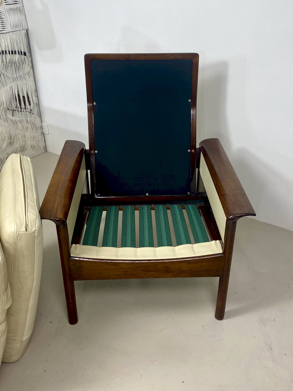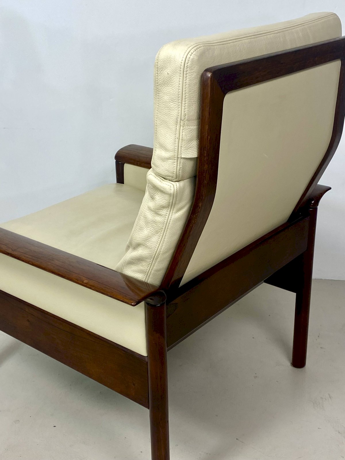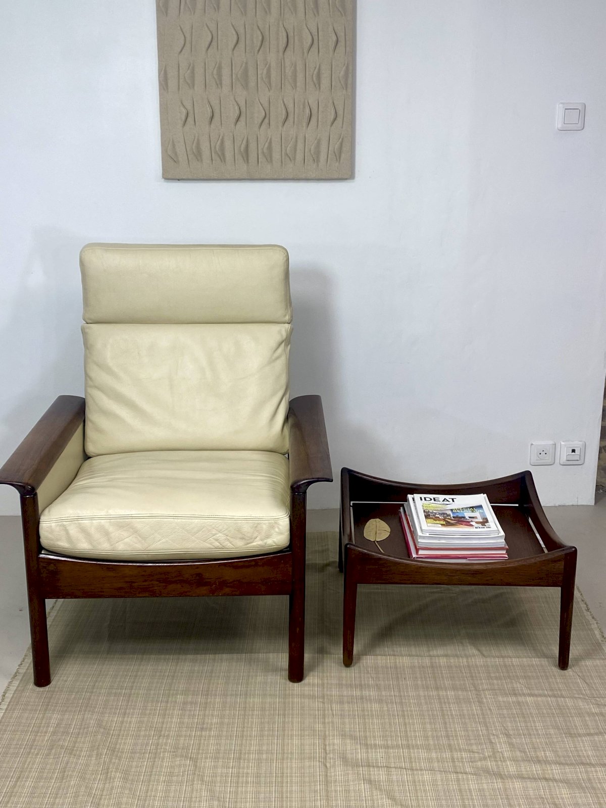 Sa structure en palissandre, essence précieuse et très recherchée, présente une patine profonde et chaleureuse qui souligne la qualité du travail artisanal.Les coussins en cuir crème, d’origine et en excellent état, apportent une touche de douceur tout en offrant un confort remarquable.