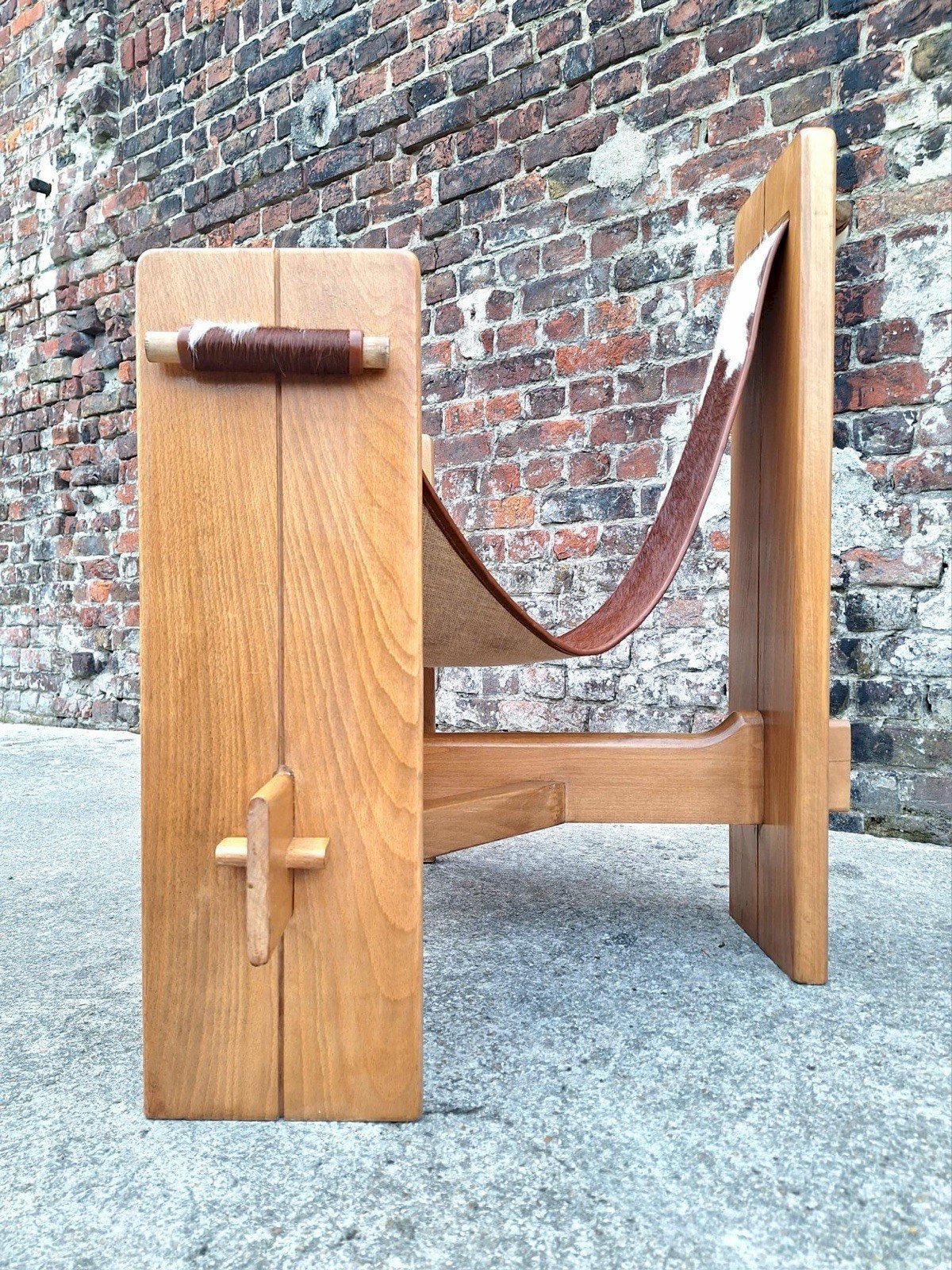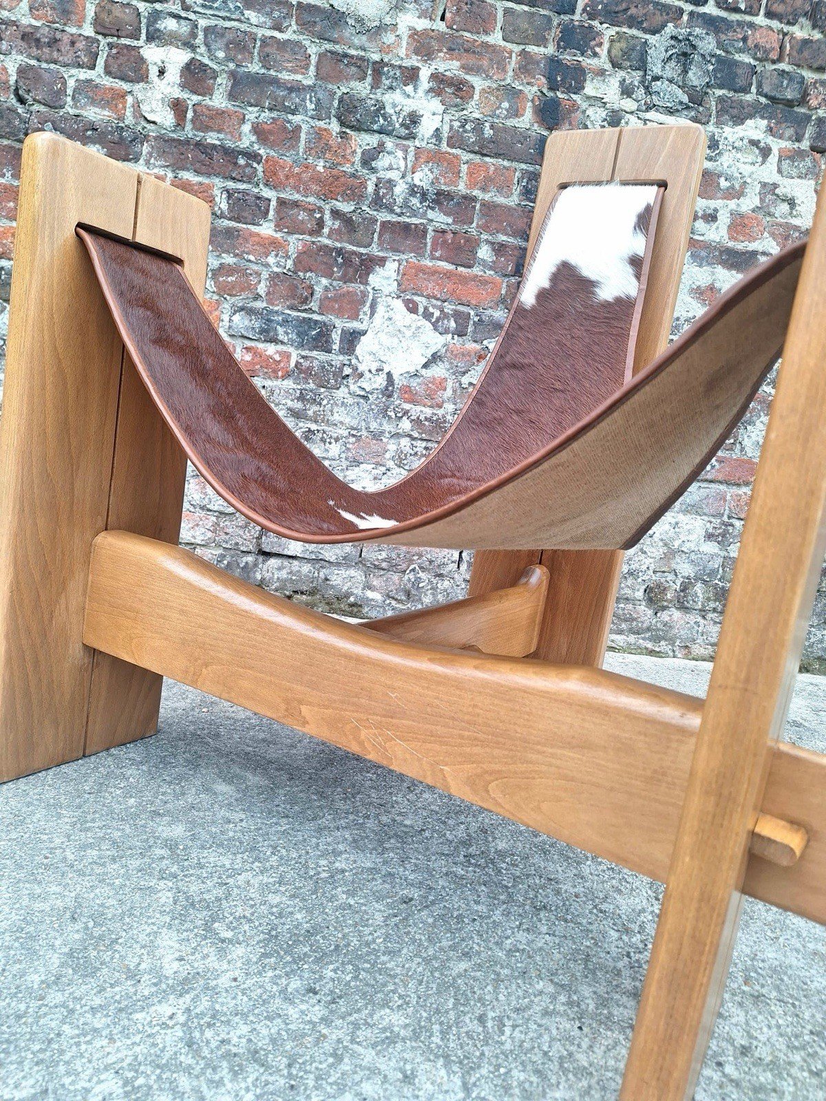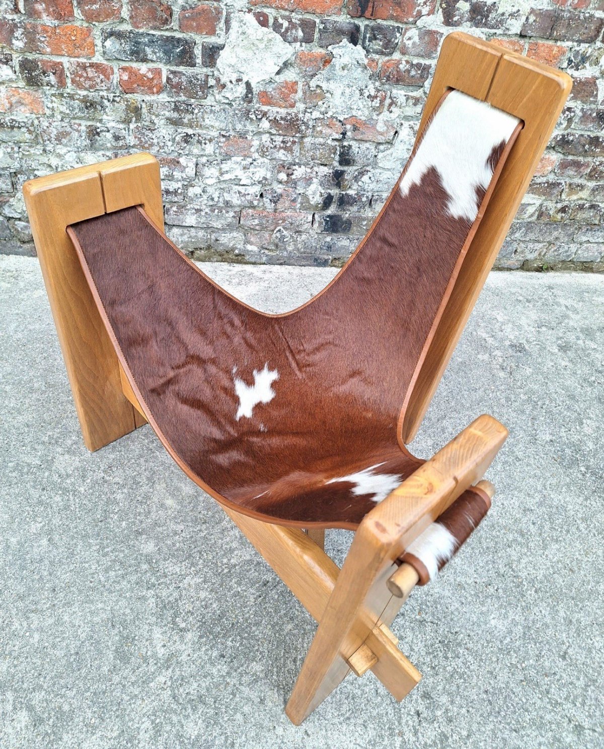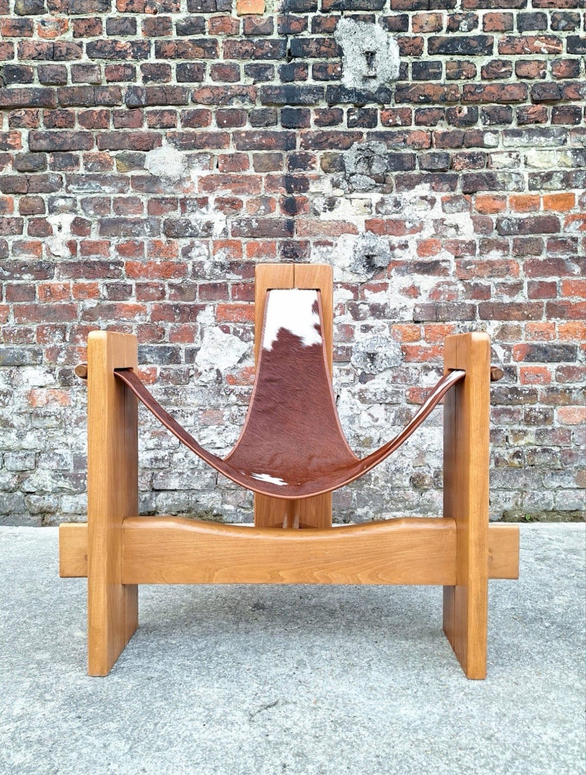 Merci de m’écrire si vous souhaitez me faire une offre. Fauteuil tripode vintage, siège design Années 60/70. Dimensions 90x72xh86,5cm, assise 35cm. Bois massif (orme). Assise suspendue en peau de vache. Très confortable. Quelques traces d’usage discrètes, cf photos. Design épuré et minimaliste, parfait pour un intérieur scandinave ou brutaliste. Remise à mon domicile ou livraison possible via transporteur (ex 70€ vers Paris et région parisienne, me contacter pour d’autres destinations). Les délais de livraison de 2 à 4 jours sont imposés par et sont donc donnés à titre purement indicatif. Chaise original unique meuble Type:Fauteuil