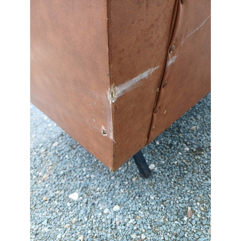 Fauteuil Vintage des Années 50/60 Skai Marron , Haut : 80 cm , Haut d'assise : 37 cm , long et larg : 79 cm sur 69 cm , Trés bon ètat a part un accroc au dérriére voir dernière photo