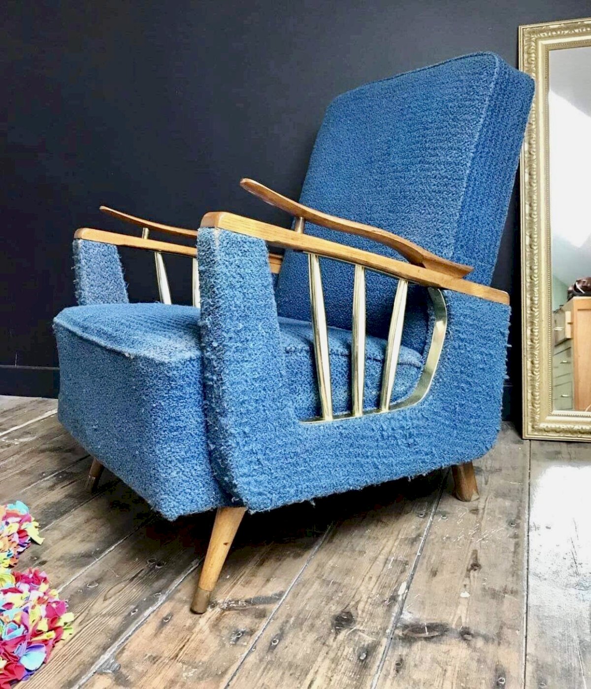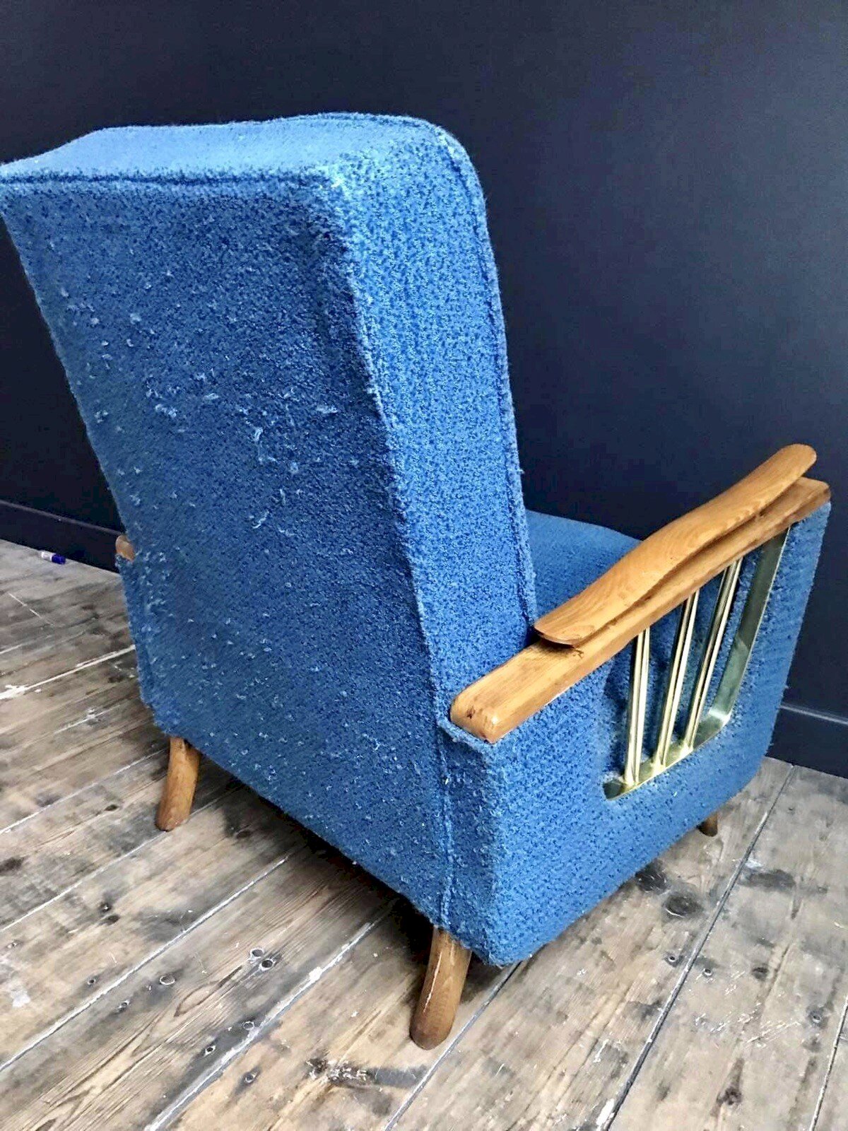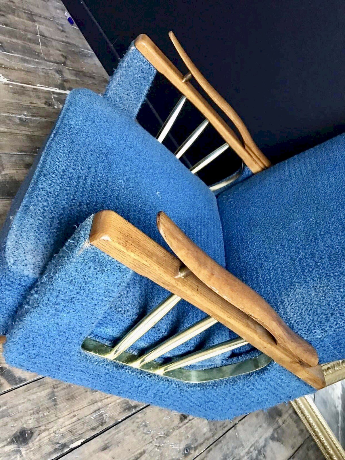 Fauteuil vintage, meuble siège ancien Accoudoirs spectaculaires, en bois massif, avec leur design scandinave. Ils surmontent des barreaux dorés (forme arc, lyre). Pieds compas. Traces normales d’usage, notamment sur les extrémités des accoudoirs (cf photos) et le tissu qui présente une usure, particulièrement aux zones de frottements. Tout à fait fonctionnel et esthétique en l’état. Très très confortable (assise avec ressorts). Tout est d’origine. Remise à mon domicile ou livraison possible via transporteur (ex 50€ vers Paris et région parisienne, me contacter pour d’autres destinations). Les délais de livraison de 2 à 4 jours sont imposés par et sont donc donnés à titre purement indicatif. Mc club ancien rétro rockabilly Type:Fauteuil