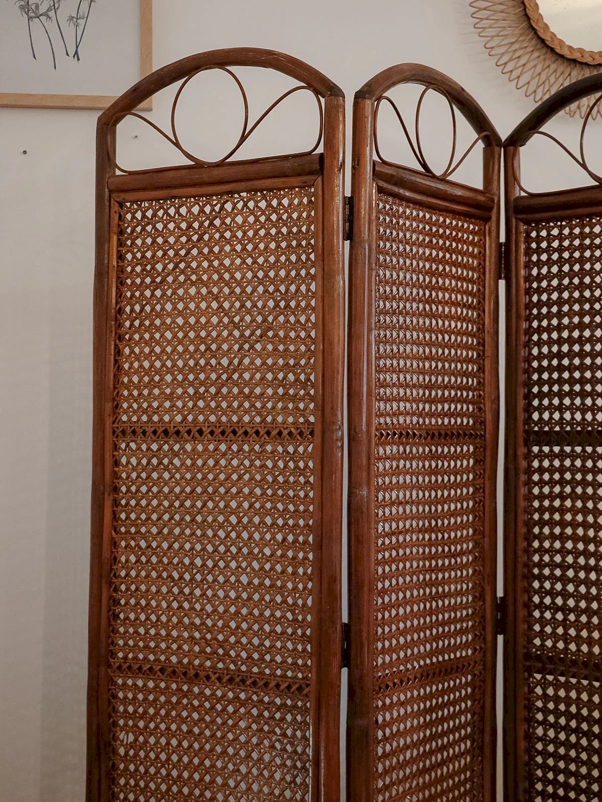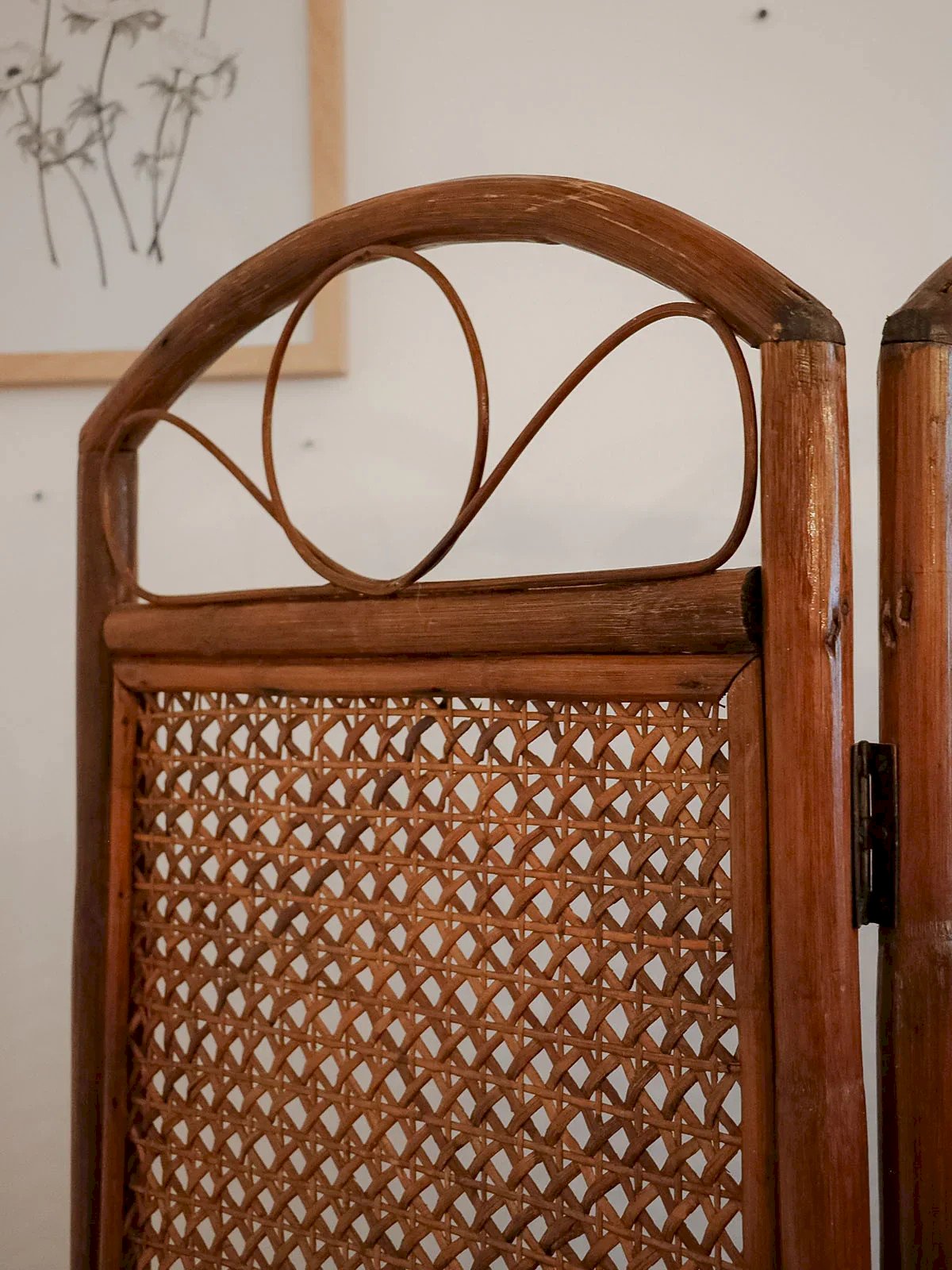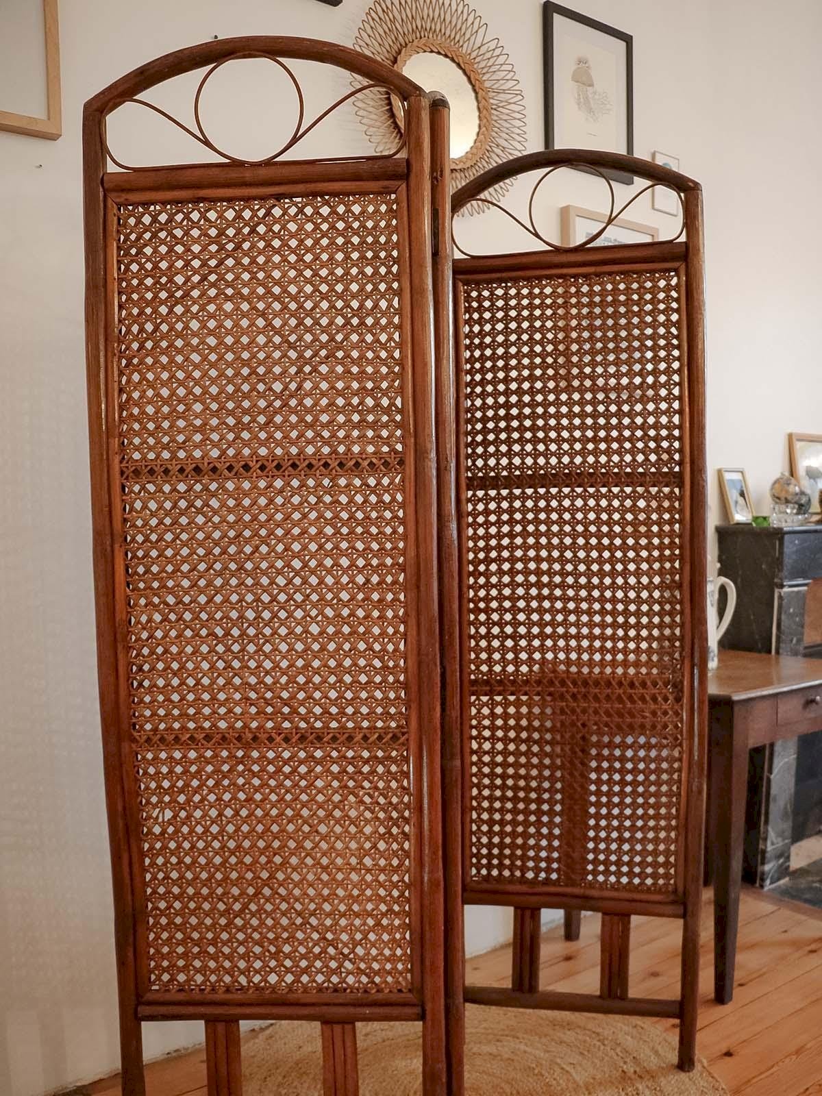 Invitez ce paravent en rotin et cannage au style années 60/70, qui apporte une note chaleureuse et naturelle à votre intérieur. Ses trois vantaux articulés offrent une séparation modulable, idéale pour créer une alcôve intime ou délimiter un coin bureau sans alourdir l'espace, tandis que le cannage laisse filtrer la lumière pour une ambiance douce. Son allure vintage insuffle caractère et équilibre à une décoration contemporaine. Longueur : 135 cm Largeur : 3 cm Hauteur : 165 cm Largeur des vantaux : 45 cm État:Occasion: Objet ayant été utilisé. Objet présentant quelques marques d'usure superficielle, ...Occasion: Objet ayant été utilisé. Objet présentant quelques marques d'usure superficielle, entièrement opérationnel et fonctionnant correctement. Il peut s'agir d'un modèle de démonstration ou d'un objet retourné en magasin après une courte période d'utilisation. les éventuelles imperfections. Marque:Debongout Type:Produit chiné Matériau:Rotin Style:Campagne