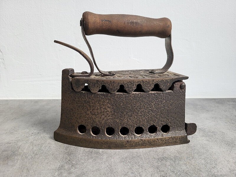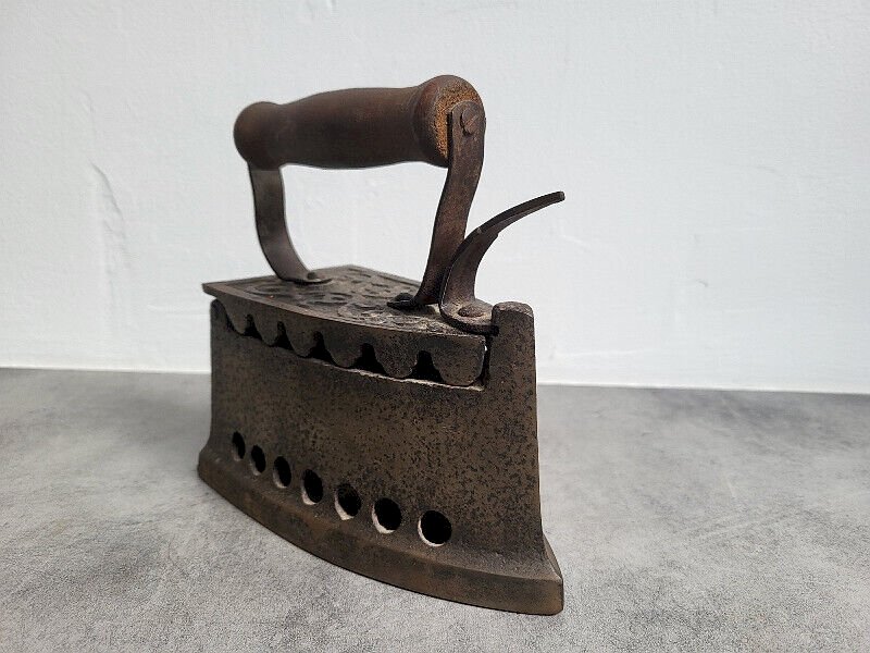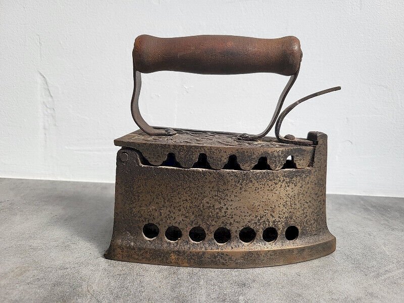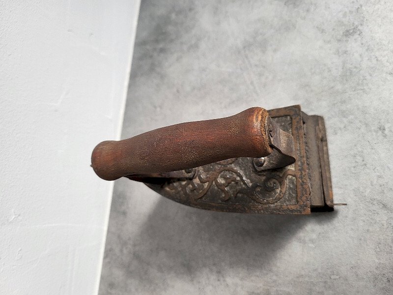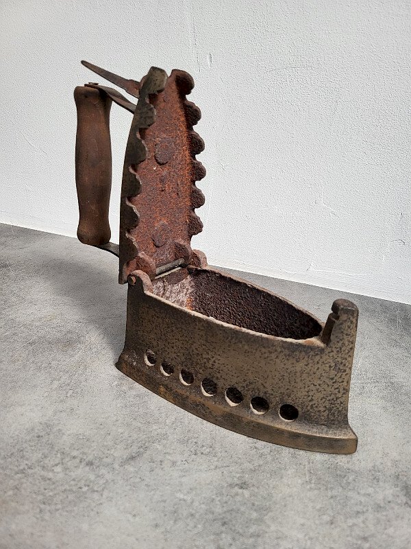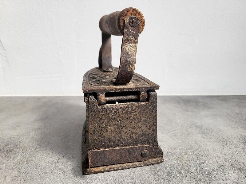 joli fer à repasser ancien réservoir à cendres il est en bon état il a juste quelques traces d'oxydation la poignée est en bois il mesure 18 cm de large sur 9.5 cm de large et 17.2 cm de haut   Type:Fer à repasser