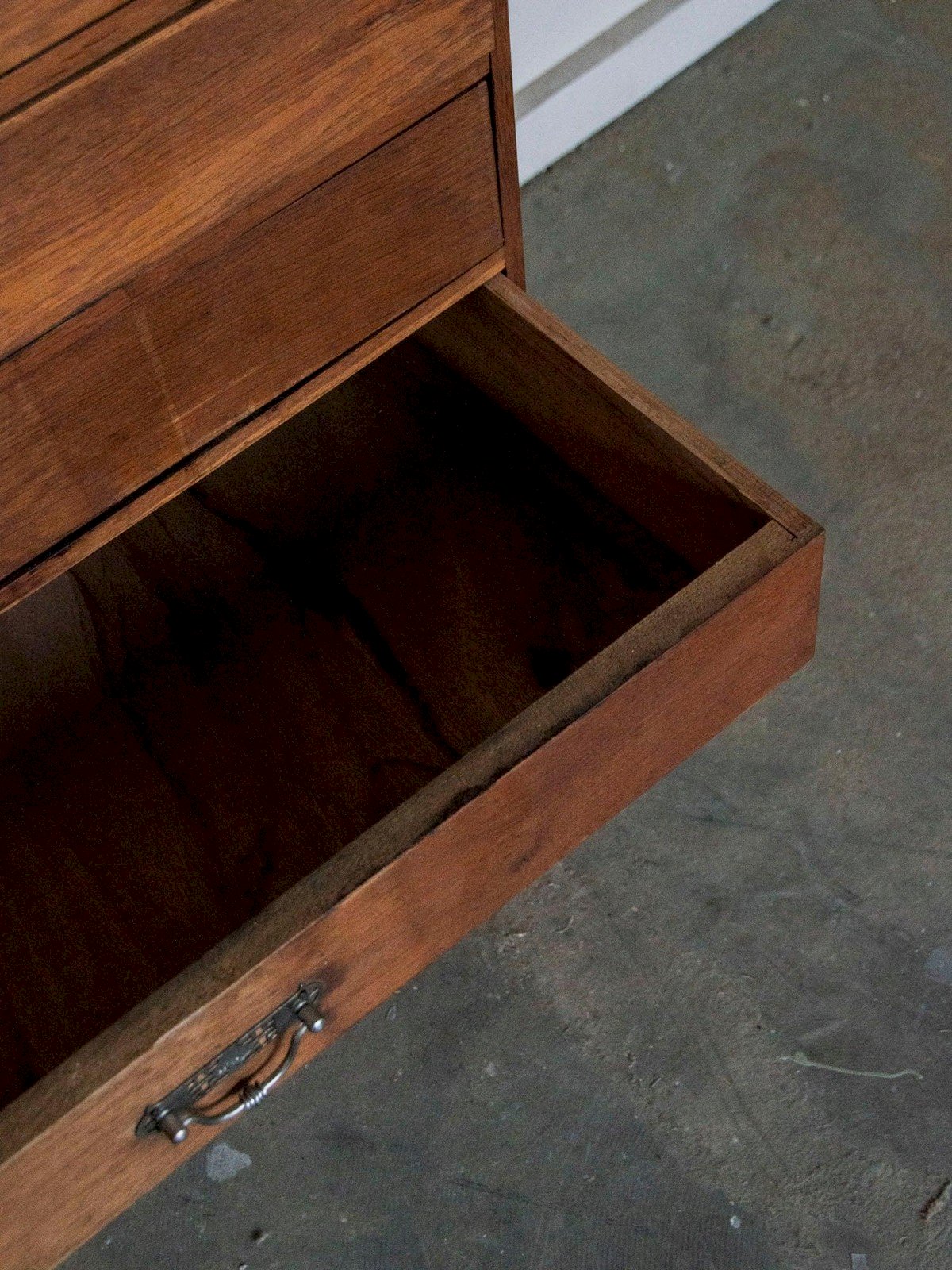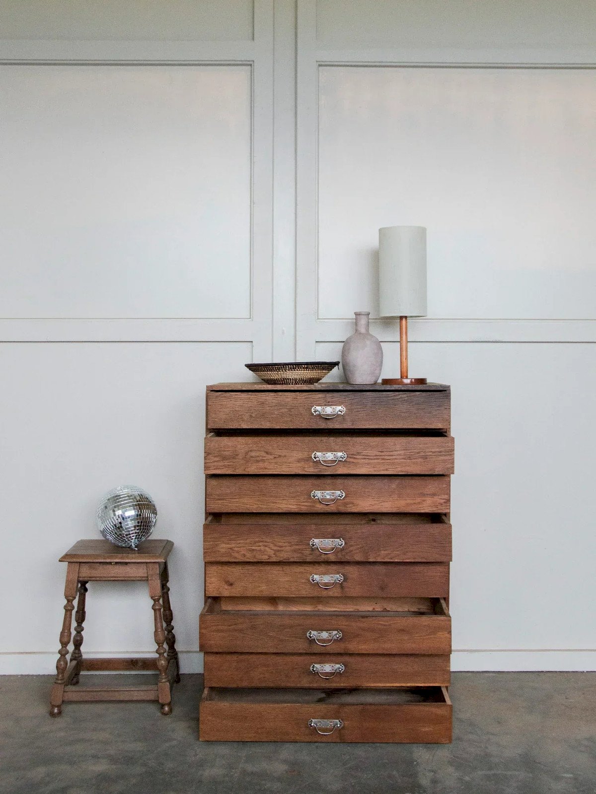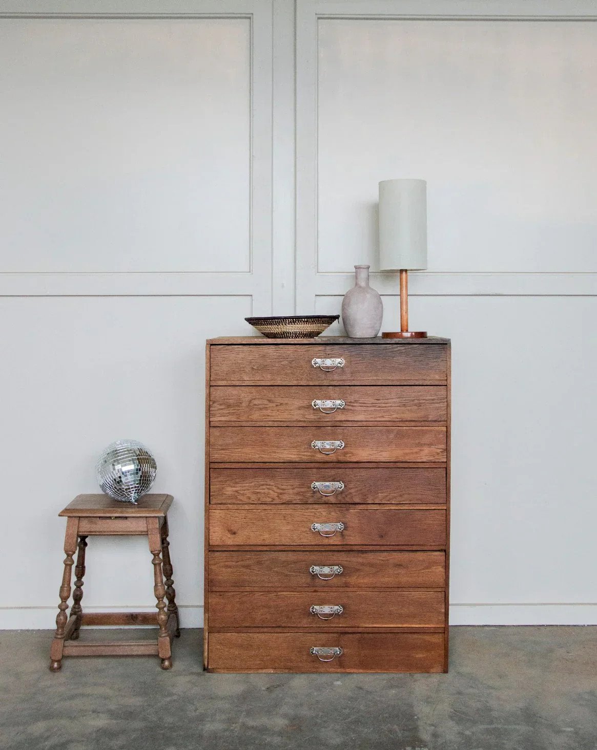 Découvrez cette commode de métier au caractère pratique, conçue pour accueillir vos photos et dessins au format A3 ou 1/2 raisin grâce à ses proportions adaptées. La façade des tiroirs en chêne révèle un beau veinage et une chaleur naturelle, rehaussée par des poignées en métal au style industriel discret. Idéale en bureau ou en atelier, elle combine rangement fonctionnel et esthétique sobre. Légères traces d'humidité dans les tiroirs. Longueur : 74 cm Largeur : 41,5 cm Hauteur : 101 cm Hauteur des tiroirs : 9 cm État:Occasion: Objet ayant été utilisé. Objet présentant quelques marques d'usure superficielle, ...Occasion: Objet ayant été utilisé. Objet présentant quelques marques d'usure superficielle, entièrement opérationnel et fonctionnant correctement. Il peut s'agir d'un modèle de démonstration ou d'un objet retourné en magasin après une courte période d'utilisation. les éventuelles imperfections. Marque:Debongout Type:Produit chiné Matériau:Bois Style:Campagne Personnalisé:Meubles de métier