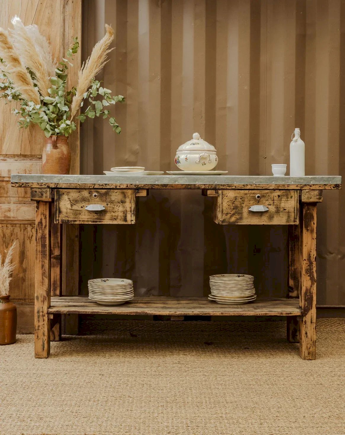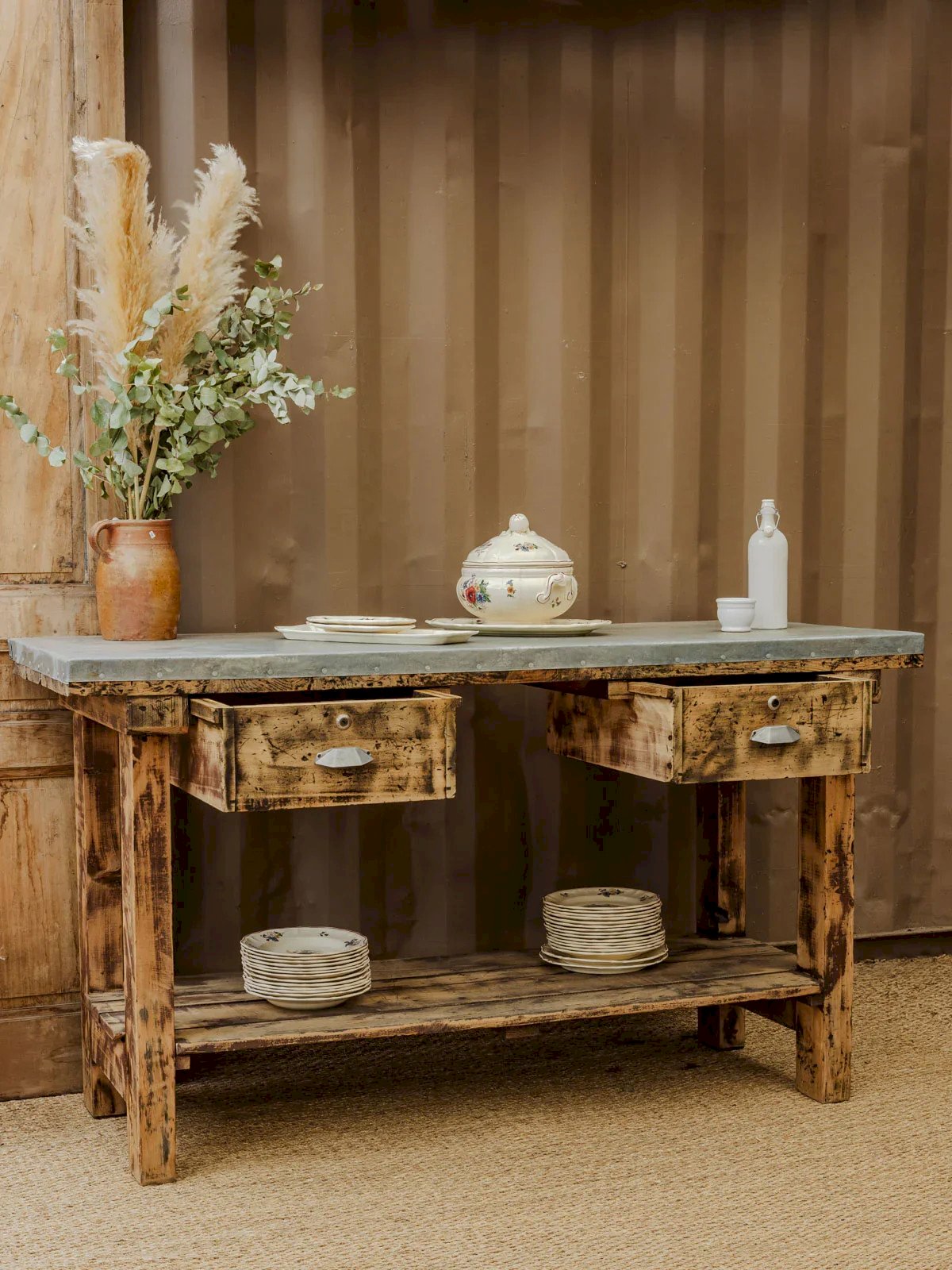 Découvrez ce charmant meuble métier ancien, idéal pour apporter une touche d'authenticité à votre intérieur. Son plateau recouvert de zinc lui confère un caractère intemporel, tandis que sa structure en pin assure robustesse et durabilité. Doté de deux tiroirs pratiques et d'un sous-plateau, ce meuble polyvalent peut également servir de console, s'intégrant facilement dans différents styles de décoration. Un incontournable pour un espace à la fois fonctionnel et élégant. Longueur : 173 cm Largeur : 70 cm Hauteur : 97 cm Hauteur sous plateau : 64 cm Hauteur tiroir : 18 cm État:Occasion: Objet ayant été utilisé. Objet présentant quelques marques d'usure superficielle, ...Occasion: Objet ayant été utilisé. Objet présentant quelques marques d'usure superficielle, entièrement opérationnel et fonctionnant correctement. Il peut s'agir d'un modèle de démonstration ou d'un objet retourné en magasin après une courte période d'utilisation. les éventuelles imperfections. Marque:Debongout Type:Produit chiné Matériau:Pin Style:Campagne Personnalisé:Meubles de métier