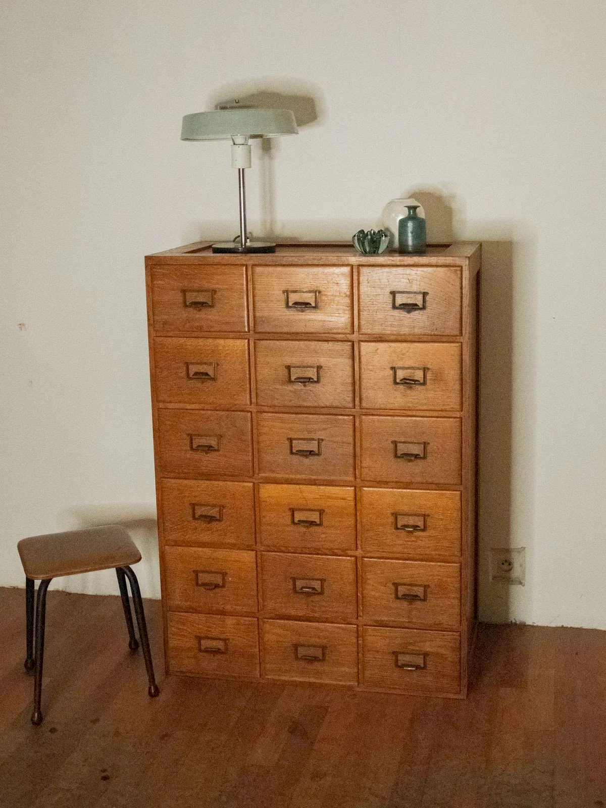 Adoptez ce meuble de métier en chêne et sapin, datant des années 30-50, au charme utile et aux lignes sobres. Ses 18 tiroirs format A4, équipés de porte-étiquettes et de poignées métalliques, offrent un rangement organisé pour dossiers ou pièces d'atelier. L'association du chêne et du sapin apporte chaleur et authenticité à un intérieur contemporain ou à un espace de travail rénové. Ses proportions pratiques et sa finition patinée invitent à une décoration fonctionnelle et inspirante. Petites marques du temps visibles sur les tiroirs et le plateau. Vendu à l'unité, un deuxième exemplaire identique est disponible (Fernand, le meuble de métier en bois N°169). Longueur : 80 cm Largeur : 40 cm Hauteur : 111,5 cm Hauteur des tiroirs : 14,5 cm État:Occasion: Objet ayant été utilisé. Objet présentant quelques marques d'usure superficielle, ...Occasion: Objet ayant été utilisé. Objet présentant quelques marques d'usure superficielle, entièrement opérationnel et fonctionnant correctement. Il peut s'agir d'un modèle de démonstration ou d'un objet retourné en magasin après une courte période d'utilisation. les éventuelles imperfections. Marque:Debongout Type:Produit chiné Matériau:Bois, Chêne, Sapin Style:Campagne Personnalisé:Meubles de métier