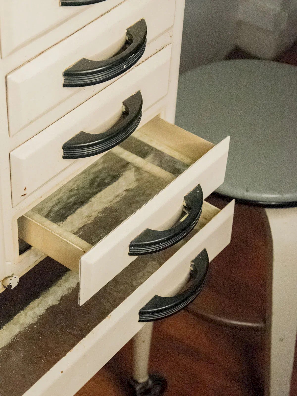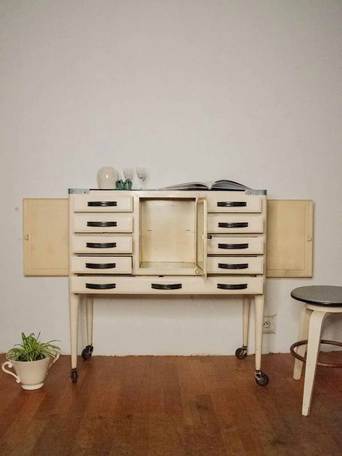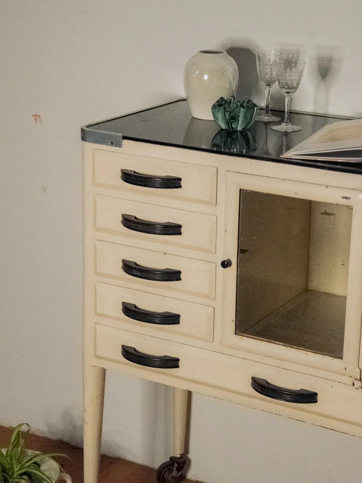 Invitez une allure industrielle et authentique avec ce meuble de métier sur roulettes, issu d'un cabinet médical. Sa structure en métal blanc associée à un plateau en verre noir et des fonds de tiroirs en verre structuré offre un contraste élégant, tandis que la niche vitrée centrale et les armoires à clés latérales garantissent un rangement original. Les quatre petits tiroirs de chaque côté et le grand tiroir central accueillent outils et documents, et les roulettes facilitent la mobilité selon vos besoins. Patiné par le temps mais toujours aussi fonctionnel et élégant. Longueur : 95 cm Largeur : 42 cm Hauteur : 94,5 cm Hauteur des tiroirs : 4,5 cm Dimensions placard : 37,5 cm x 29,5 cm État:Occasion: Objet ayant été utilisé. Objet présentant quelques marques d'usure superficielle, ...Occasion: Objet ayant été utilisé. Objet présentant quelques marques d'usure superficielle, entièrement opérationnel et fonctionnant correctement. Il peut s'agir d'un modèle de démonstration ou d'un objet retourné en magasin après une courte période d'utilisation. les éventuelles imperfections. Marque:Debongout Type:Produit chiné Matériau:Métal, Verre Style:Campagne Personnalisé:Meubles de métier