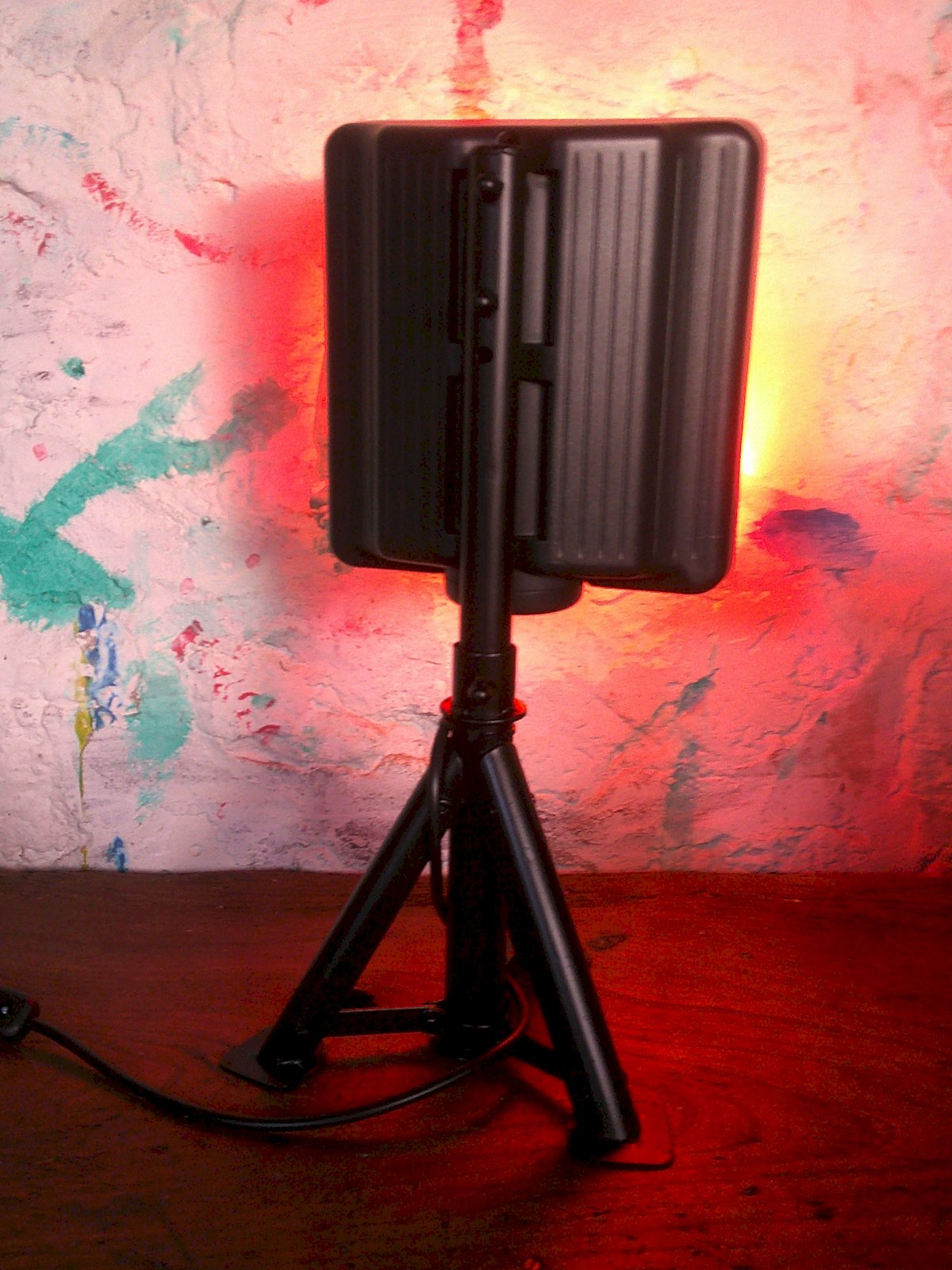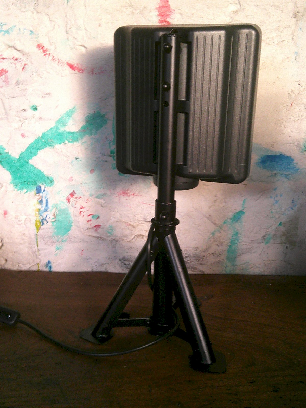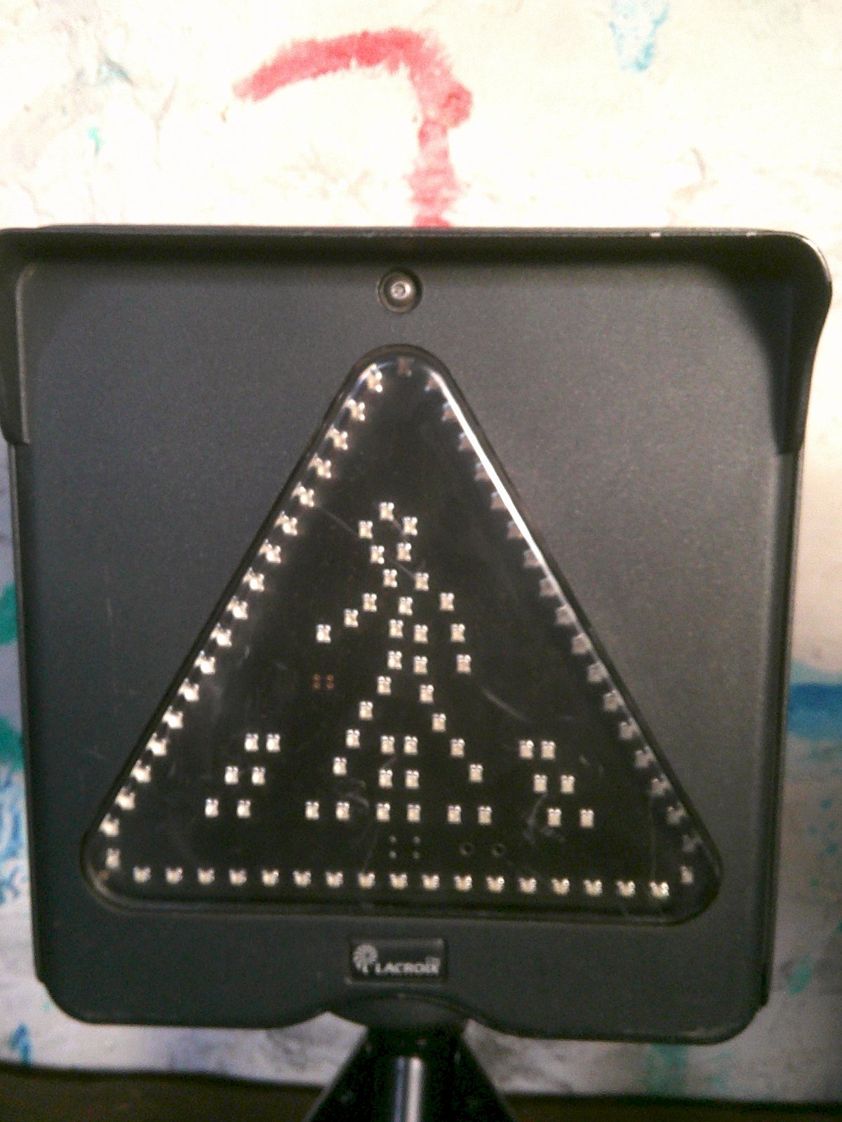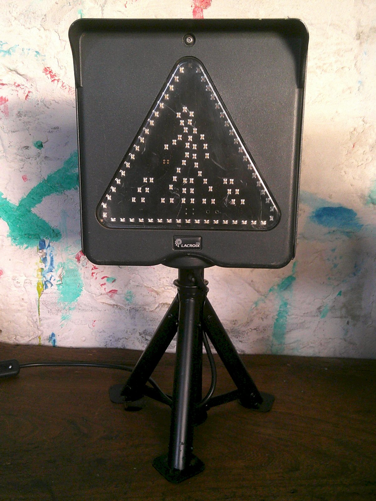 Feu de signalisation piéton " LACROIX " a éclairage ( LED ) fixe installé sur un pied réalisé a partir d'une ancienne chandelle d'atelier .