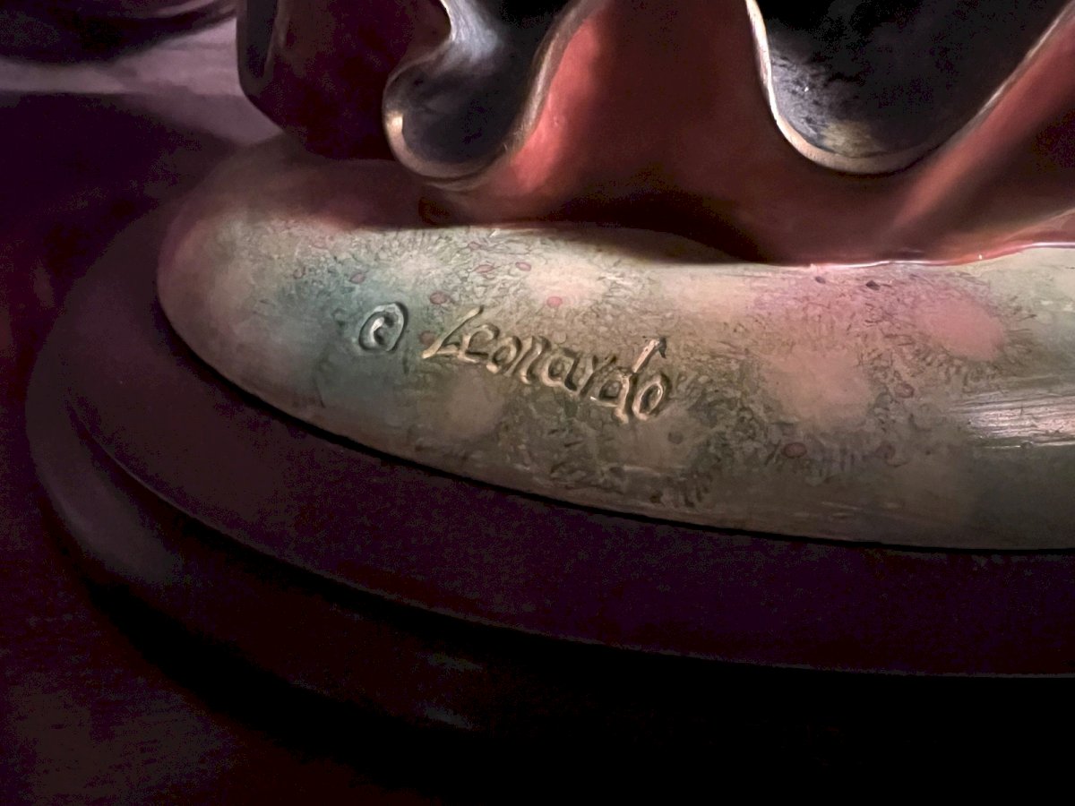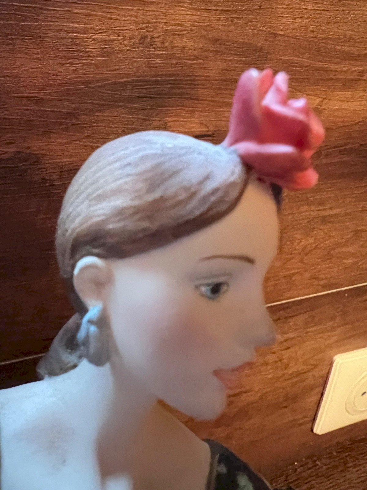 Dans un souffle de passion et de rythme, cette élégante danseuse flamenco signée Leonardo semble suspendue dans le mouvement. Le bras levé, la taille cambrée, la robe noire constellée de motifs floraux et soulignée de volants flamboyants, elle incarne toute l’intensité et la grâce du flamenco espagnol. Le travail des drapés est remarquable, la posture expressive, le visage finement modelé. Le socle décoré de roses accentue la dimension poétique et décorative de l’ensemble. Une pièce qui capte la lumière et attire immédiatement le regard. Caractéristiques Marque : Leonardo Type : Figurine / statue décorative Sujet : Danseuse flamenco Matière : Résine décorative peinte à la main Hauteur : 36 cm (≈ 14.17 inches) Dimensions de la base : 21 × 16 cm (≈ 8.27 × 6.30 inches) État : Très bon état général, sans éclat ni manque (voir photos) Idéal pour Collection de figurines Leonardo Décoration intérieure élégante et expressive Ambiance espagnole, flamenco ou bohème chic Cadeau décoratif raffiné Type:Sculpture Marque:Leonardo Pays d'origine:France Matière:resine Thème:Personnage