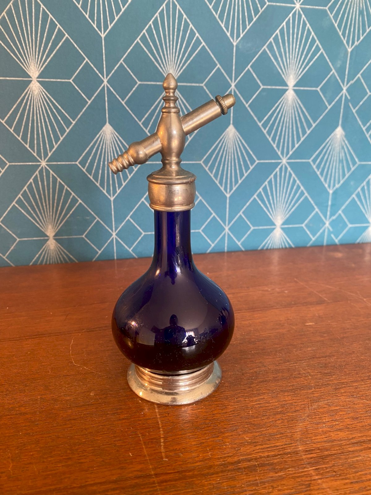 Charmant vaporisateur ancien, signé Fages Patentado et daté de 1927. Structure métal et flacon en verre bleu. En excellent état, il mesure 17cm de haut pour 8cm de large à son maximum. Très jolie pièce.