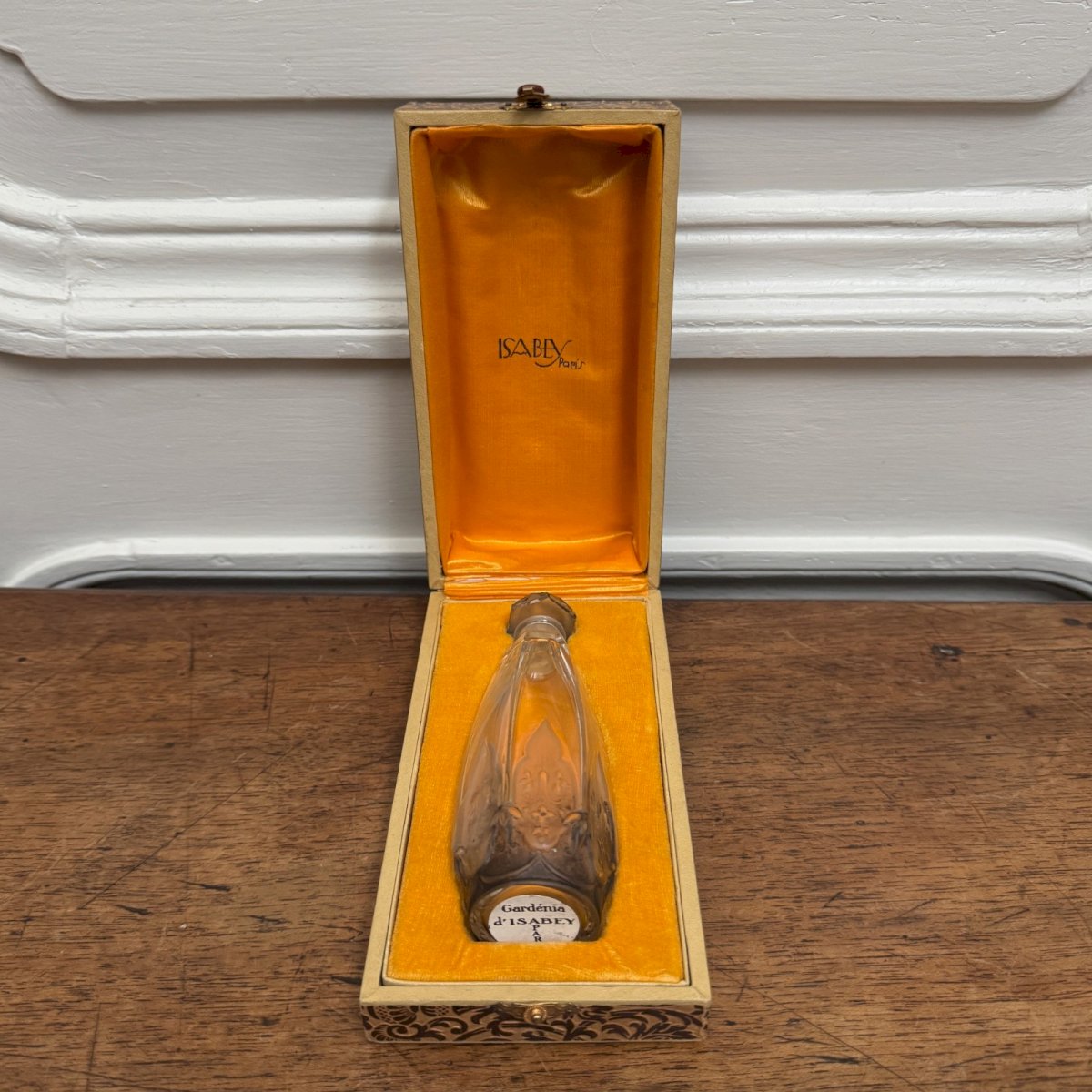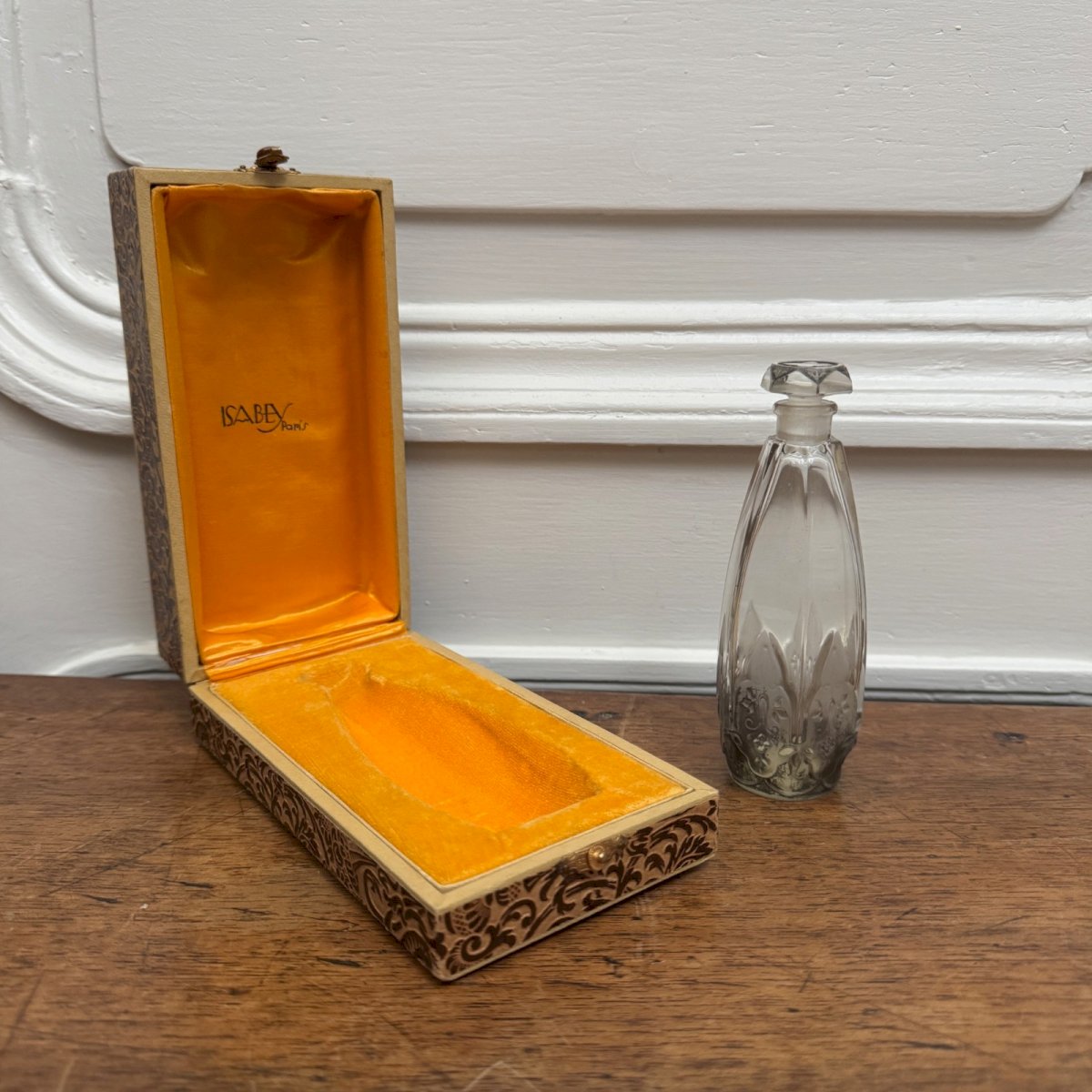 Flacon d'Isabey par Julien Viard 1930 pans coupés décors floraux avec sa boite  M3903 Voici un rarissime flacon de parfum d'Isabey par Julien Viard. Le flacon est en verre pressé, assise circulaire taillée à huit pans avec un relief de motifs patinés et un bouchon casquette. Voici ce que l'on peut lire sur le flacon "Gardénia d'Isabey Paris". Le verre est en superbe état, notons un minime saut sur le bouchon pour les plus pointilleux et une usure de patine. Nos photos vous permettent d'apprécier la qualité de l'objet. Pour l'état, merci de bien détailler les photos. N'hésitez pas à zoomer . Les photos font partie intégrante de la description. Dimensions : - Coffret  Hauteur : 5 cm Largeur : 8 cm Profondeur : 15 cm - Flacon  Hauteur : 12 cm Largeur : 4 cm Profondeur : 4 cm A :  AAKXOMODHW P :  1666219   Je reste à votre disposition pour toute question. Type:Objet de vitrine, Décoratif Période:Design du XXème Pays d'origine:France Sous-type:Flacon de parfum Hauteur:12 cm Matière:Verre Longueur:cm Largeur:4 cm
