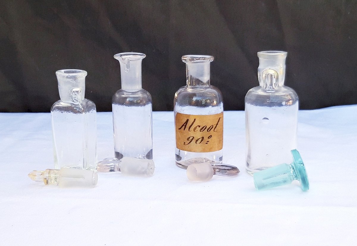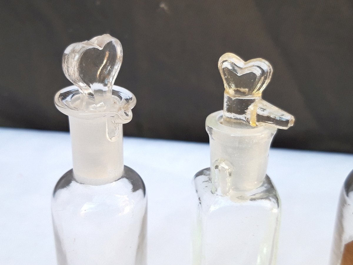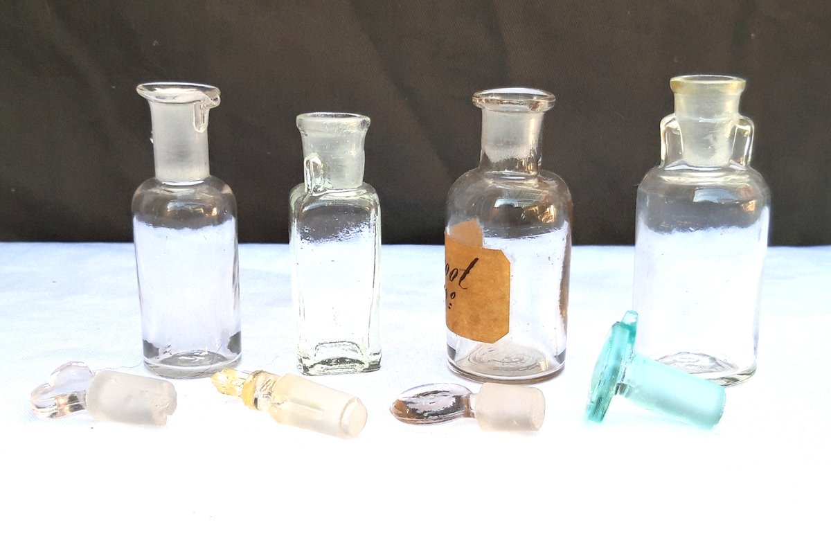 Ensemble de 4 petits flacons anciens en verre avec leurs bouchons.