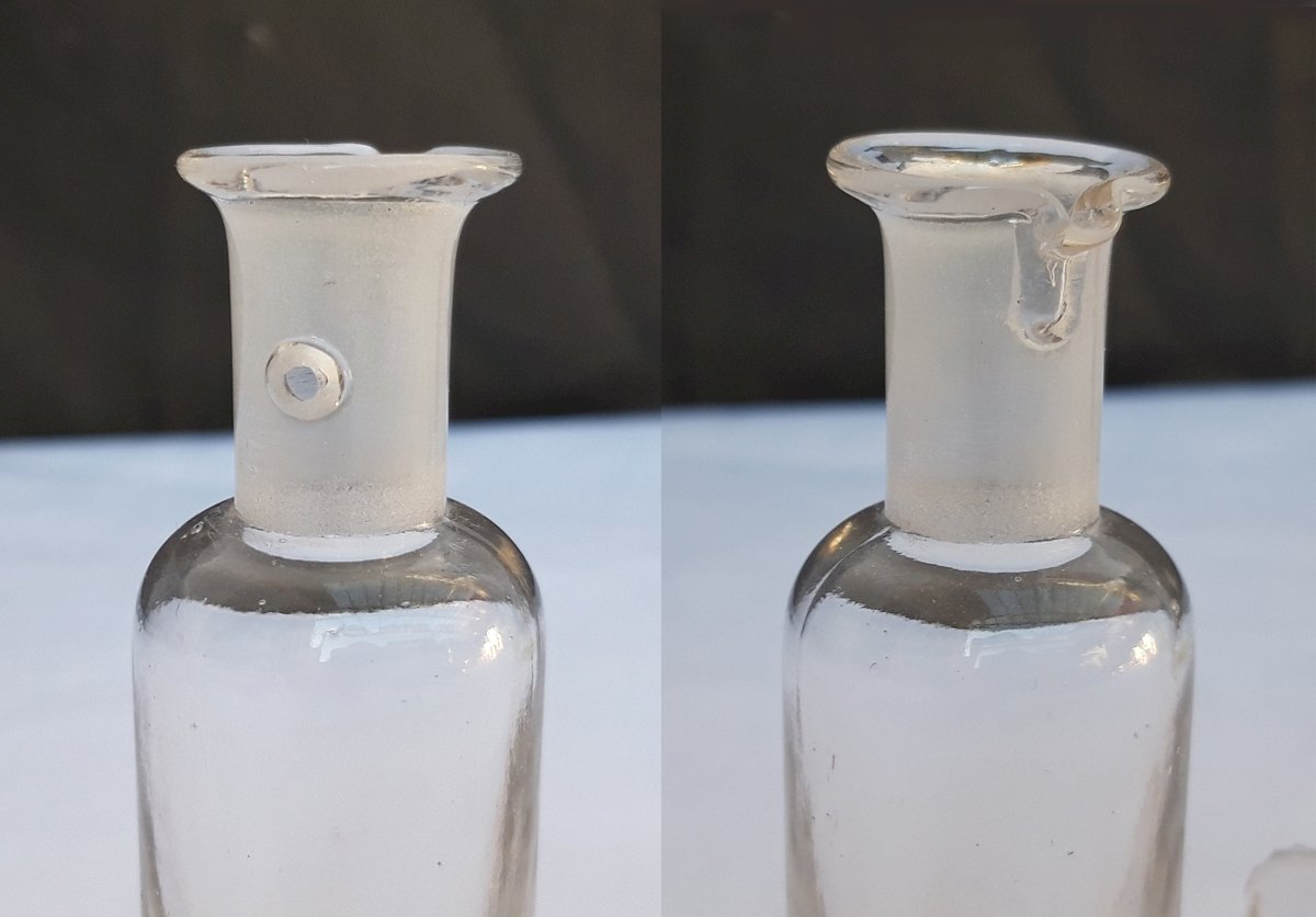 - les 3 autres sont sophistiqués, avec col et bouchons techniques complexes (percés d’orifices et creusés d’un canal ou deux), permettant l’écoulement du liquide en goutte à goutte